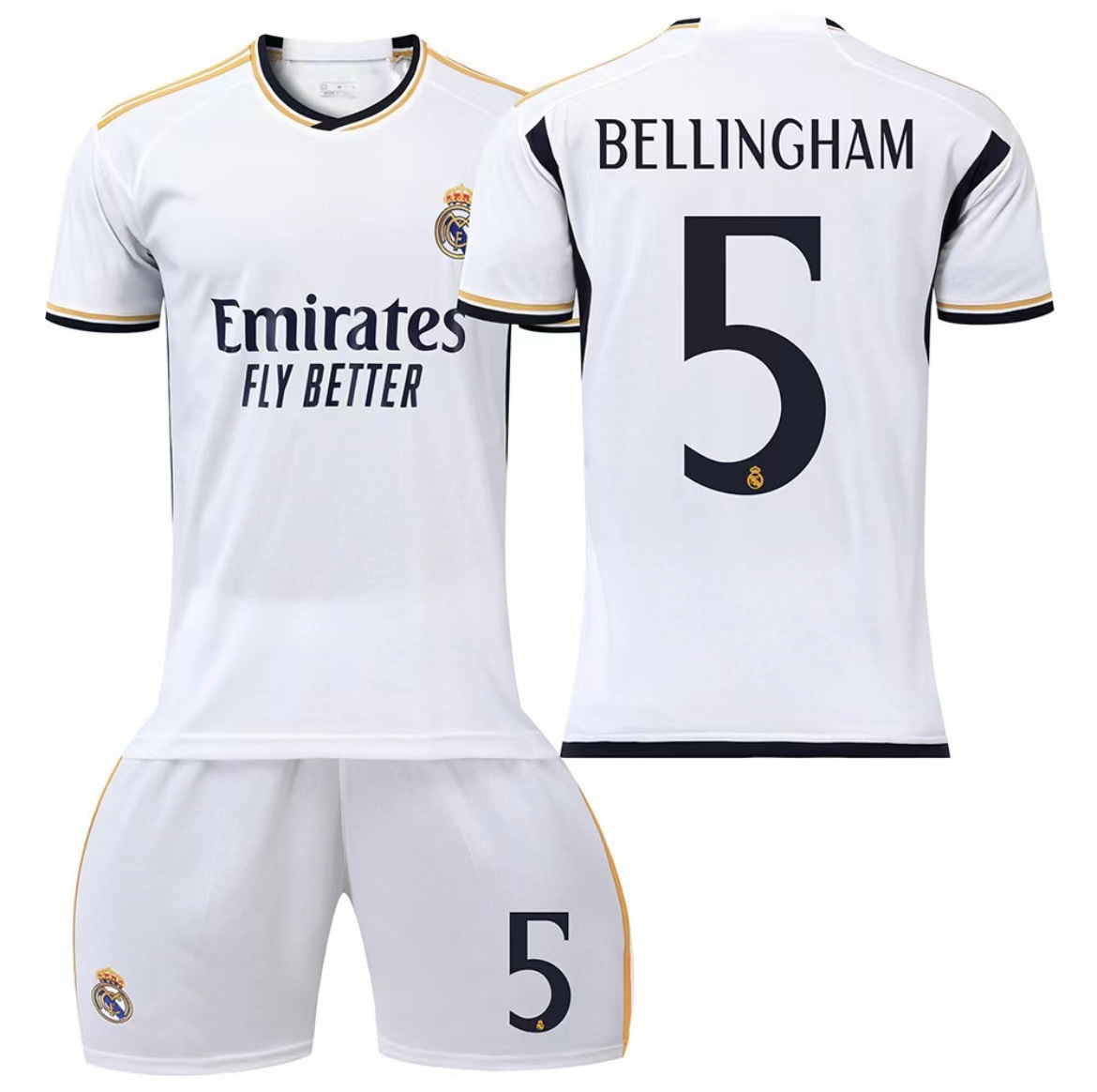 도매 23-24 레알 마드리드 저지 No. 5 벨링엄 No. 7 Vinicus 성인 어린이 축구 유니폼 세트