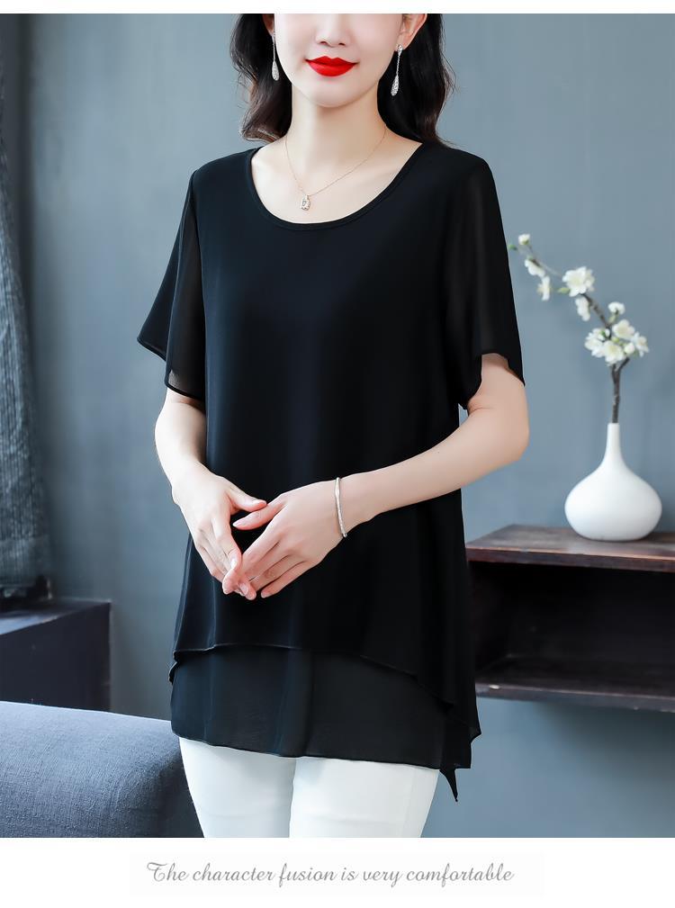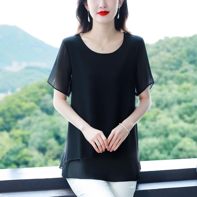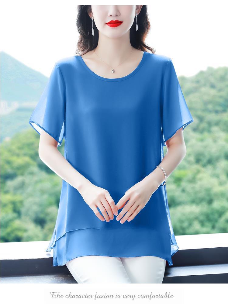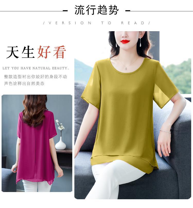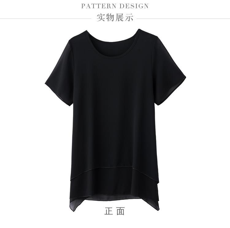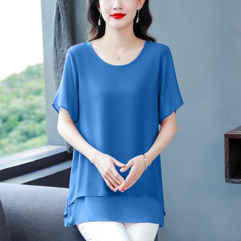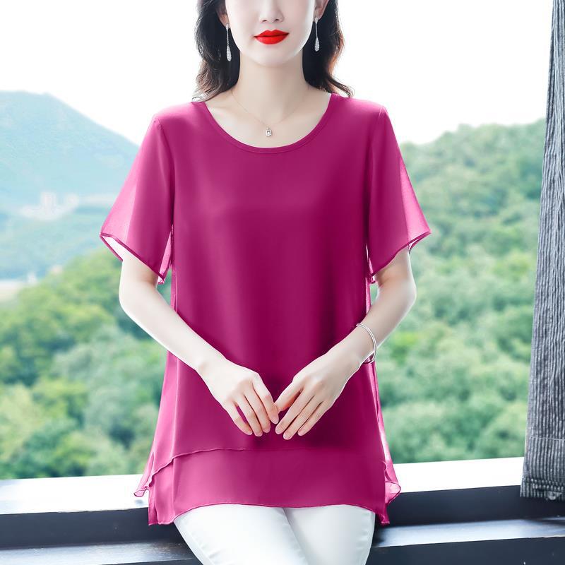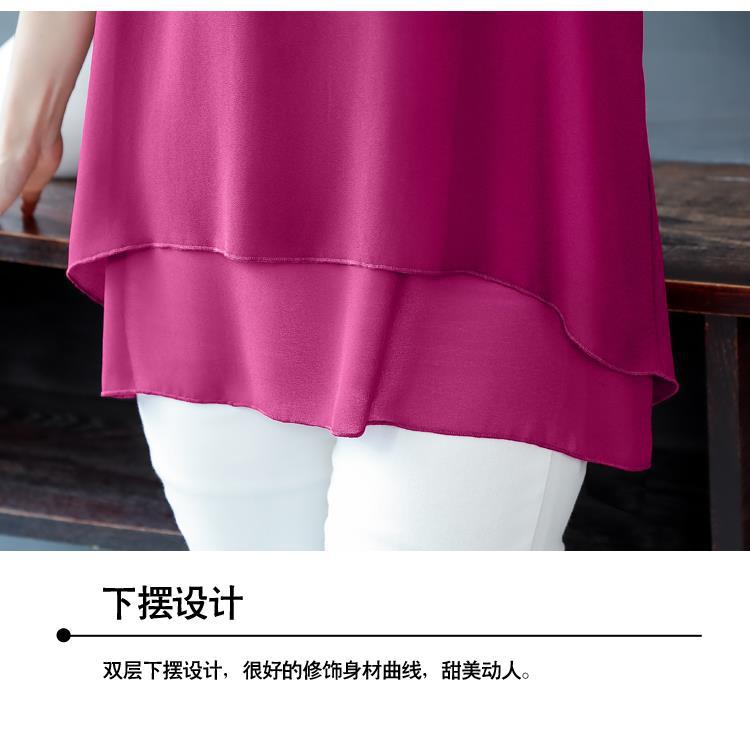 통통녀 배꼽 덮기 쉬폰 셔츠 여성의 중간 길이 여름 플러스 사이즈 서양 스타일 작은 셔츠 중년 어머니 느슨한 슬리밍 탑