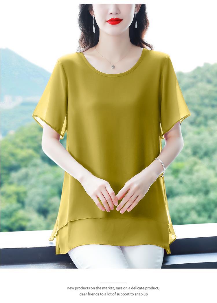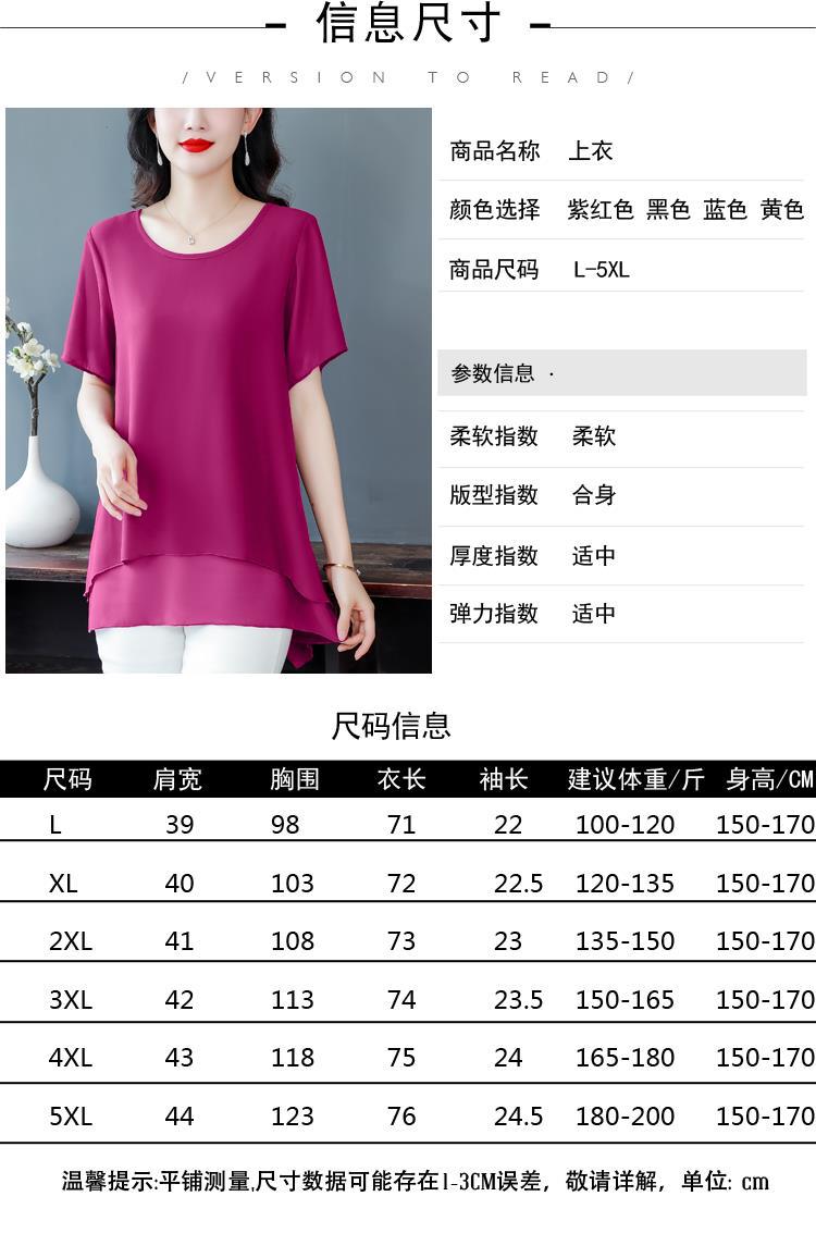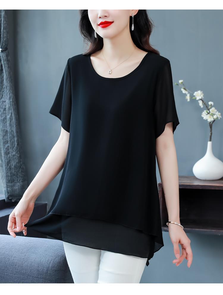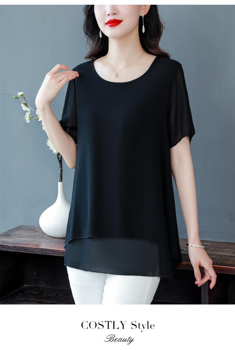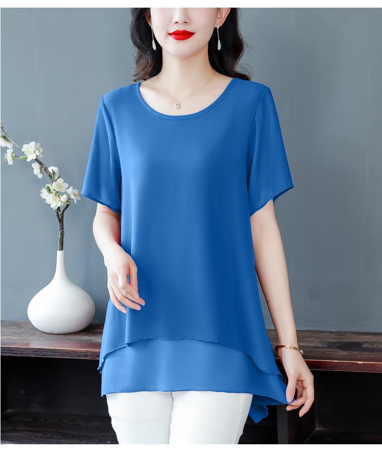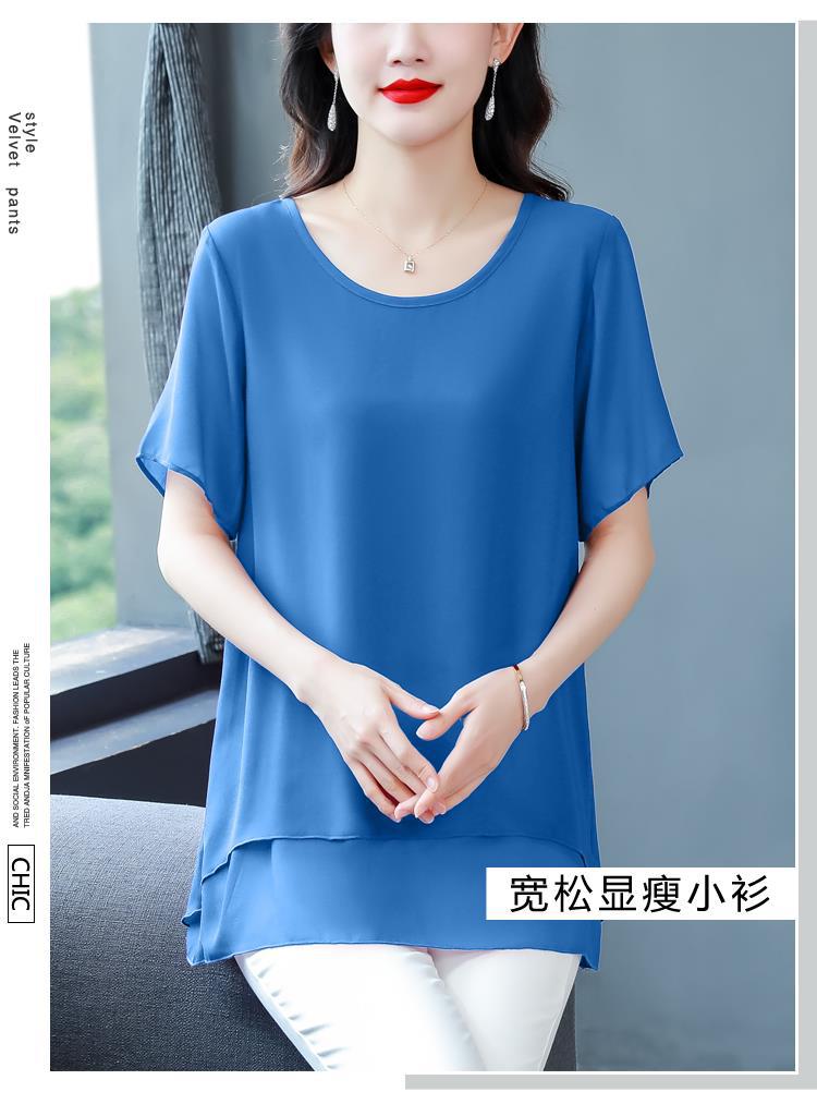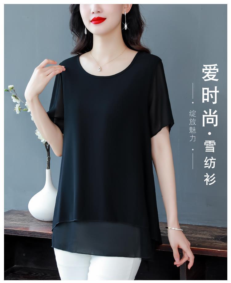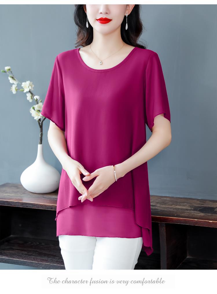 통통녀 배꼽 덮기 쉬폰 셔츠 여성의 중간 길이 여름 플러스 사이즈 서양 스타일 작은 셔츠 중년 어머니 느슨한 슬리밍 탑