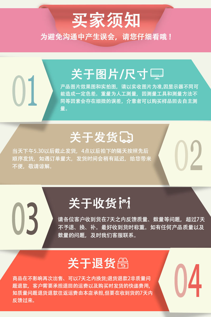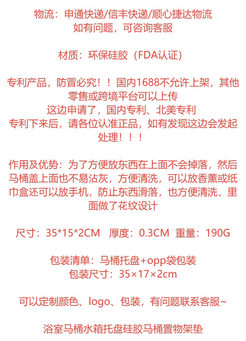 欢迎各界朋友前来探讨研究。 关于产品图片/尺寸: 本店所有产品都是自由工厂生产,一手货源,质量保证。产品图片效果图和实拍图,请以实物为准,因显示器不同可能造成一定色差;重量尺寸均为人工测量,因测量工具和测量方法不同等因素会存在细微的误差,介意者可以购买样品回去自主测量。 关于退货: 1、本店所有产品没有7天无理由退货服务!!! 2、货物存在质量问题或者少货请在48小时内联系客服处理,超时责任难以确定不予处理!定制产品不接受退货退款; 3、爆款产品随时会调价,届时已经发货的订单不接受退差价!!! 4、收货后超过15天的,统一都不能再退换货!国外各国跨境平台的专利问题需自行查清,本店不为此负任何责任! 5、本司很多爆款产品,请合理采购,合理备库存,产品一经发货,不接受退换货,不接受因为产品滞销、链接被下架、没有通过审核发不了海外仓等任何原因退款退货,敬请悉知!!! 专利问题: 1、我司原创作品,都有专利,并且有专业的维权法务团队每天打假。 一经发现COPY,会利用法律手段维权! 2、本店所有产品不能上架到1688国内站,否则一经投诉后不撤销!其他平台均可上传。 发货时间: 少量订单于当天下午5点前付款的会尽量安排当天寄出,5点后付款的订单第二天会按照先后顺序发货。订单量大的发货时间会稍有延迟,不过请亲们放心,都会尽快安排发出的!如遇大促或其它特殊情况可能会有延迟,如需发加急件,请联系客服咨询。 请下单前仔细阅读以免后期出现纠纷,谢谢合作!!! |