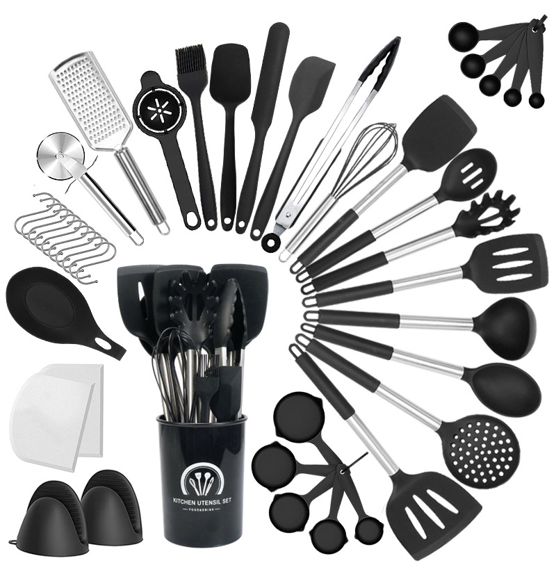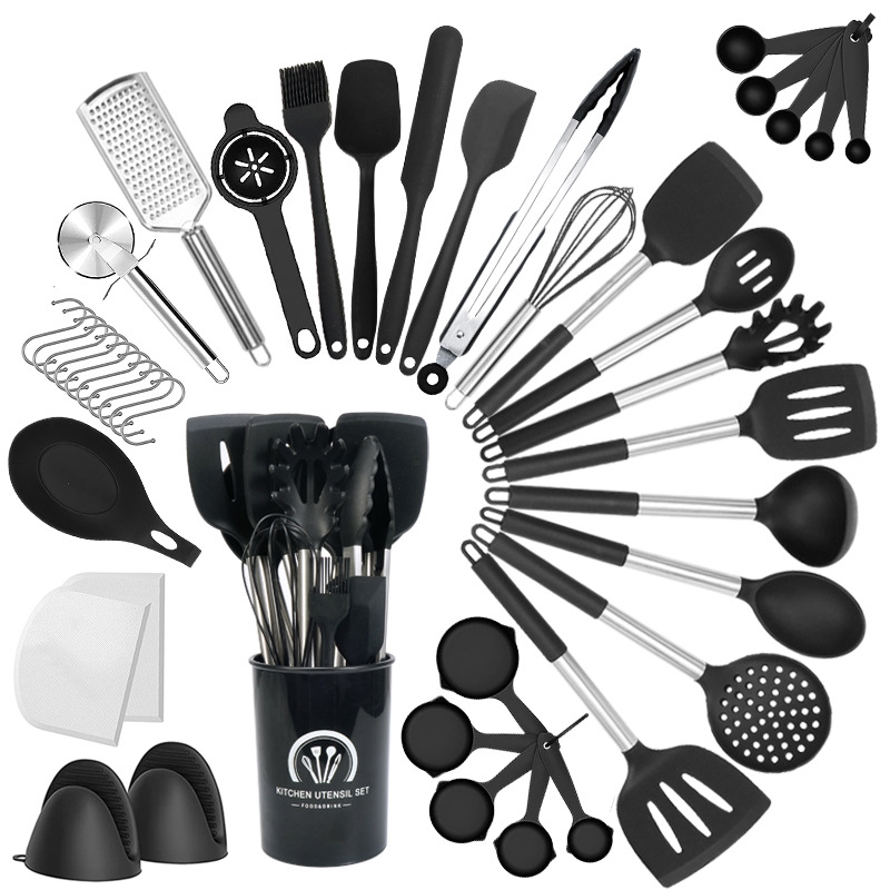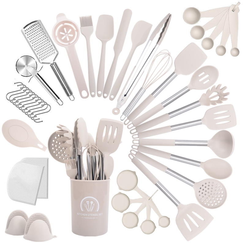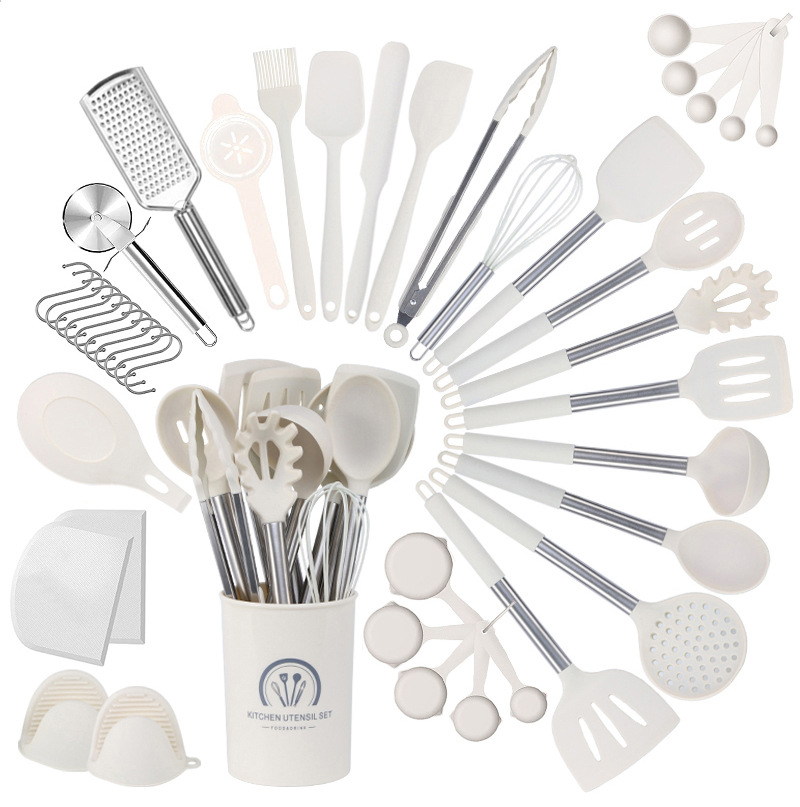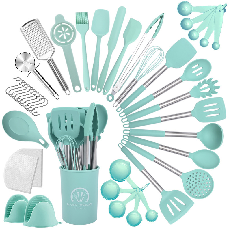 국경 43 조각 실리콘 요리 주방 용품 세트 고온 저항하는 주방 용품 비 스틱 스푼 삽 스테인레스 스틸 식기