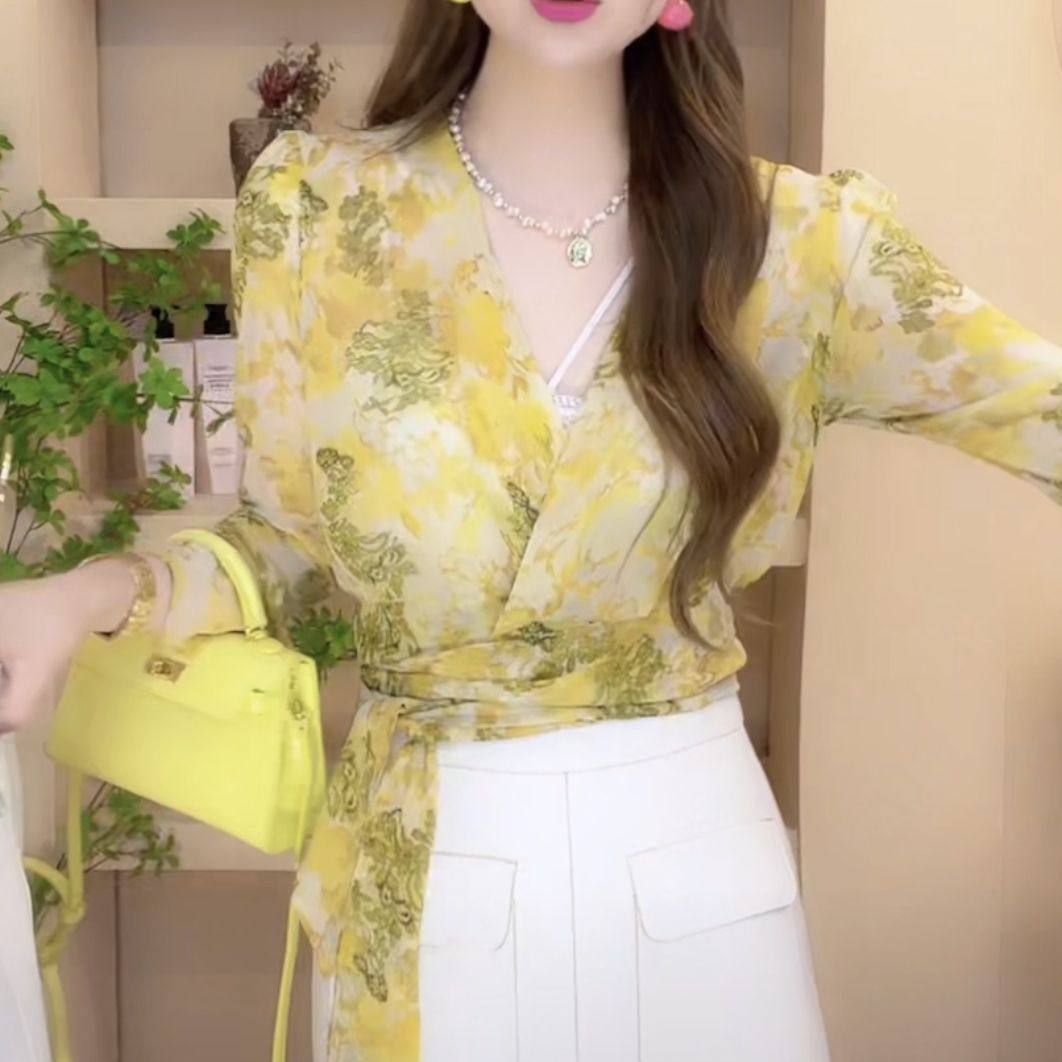 여름 쉬폰 새로운 빈티지 틈새 플로럴 크로스 V-넥 레이스 업 혼 슬리브 셔츠 여성용 타이트 웨이스트 자외선 차단 셔츠