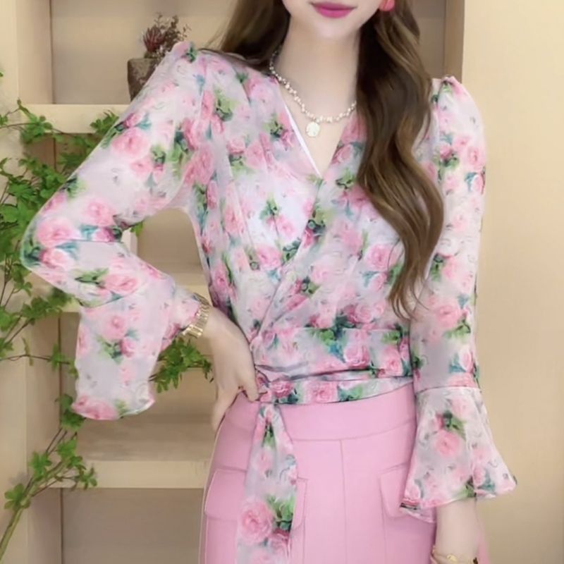 여름 쉬폰 새로운 빈티지 틈새 플로럴 크로스 V-넥 레이스 업 혼 슬리브 셔츠 여성용 타이트 웨이스트 자외선 차단 셔츠스토어 가기