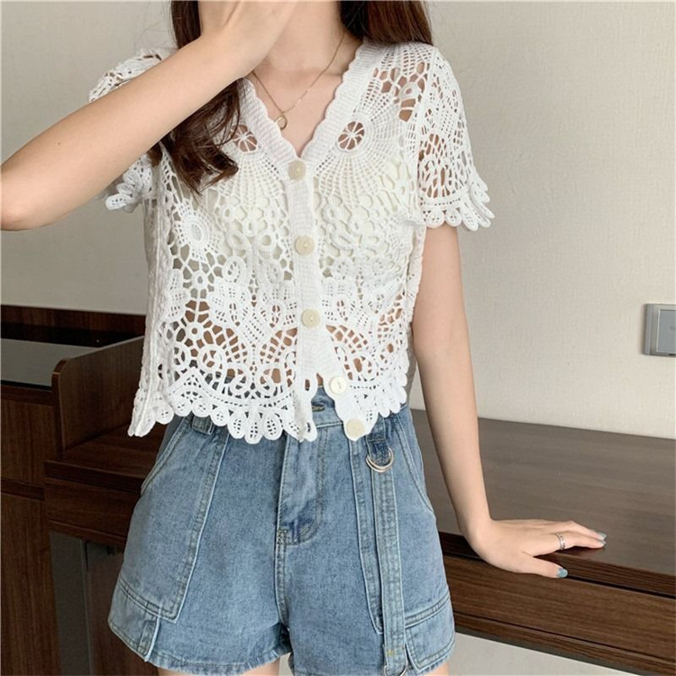 니트 자수 가디건 반팔 중공 크로 셰 뜨개질 겉옷 자외선 차단제 여성용 탑 코트 보헤미안 에스닉 스타일스토어 가기