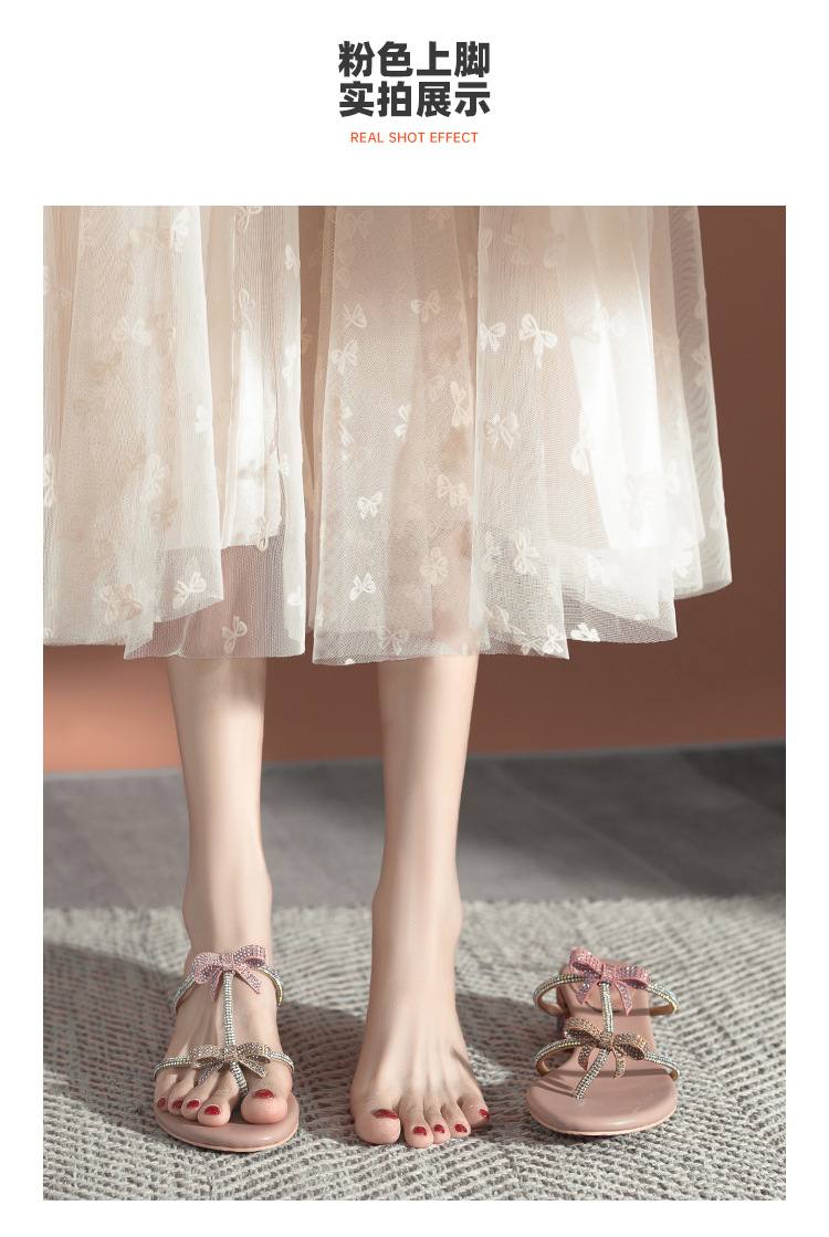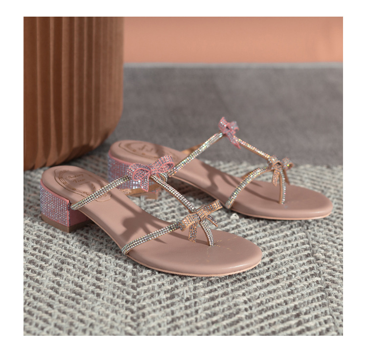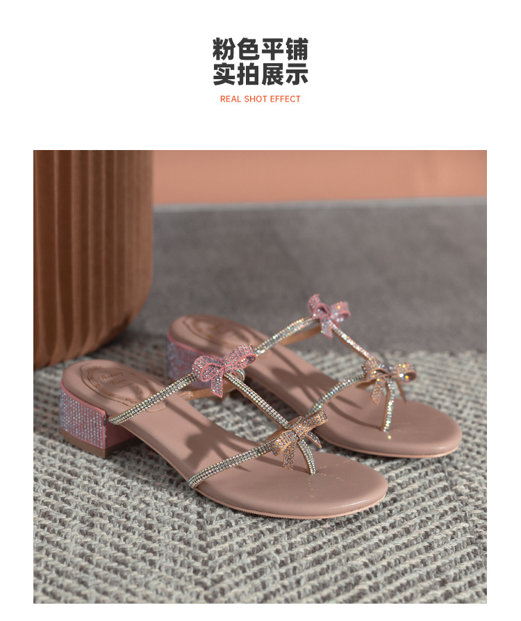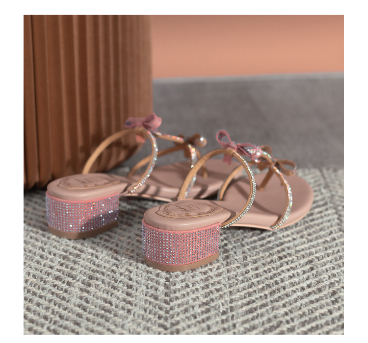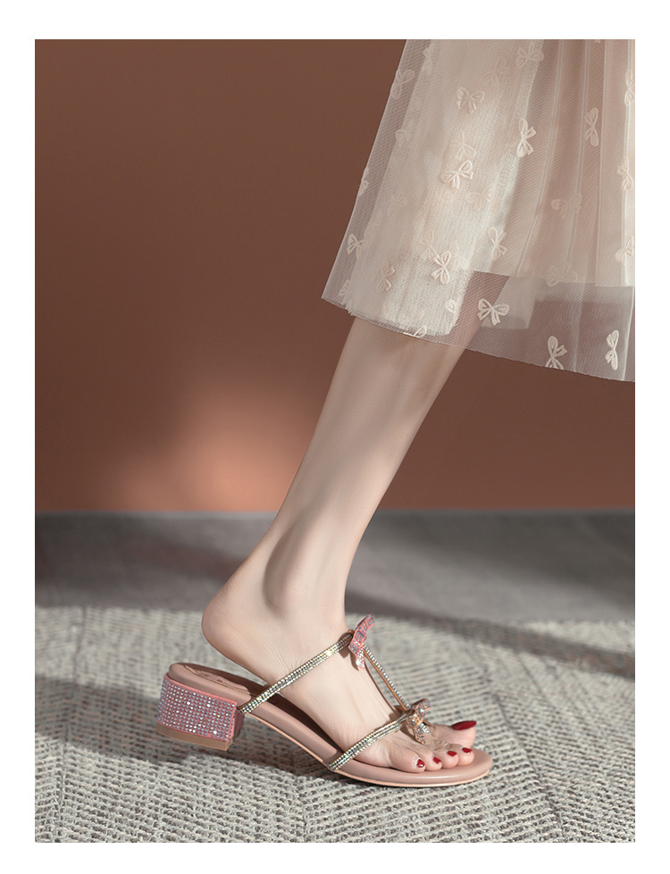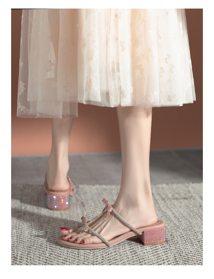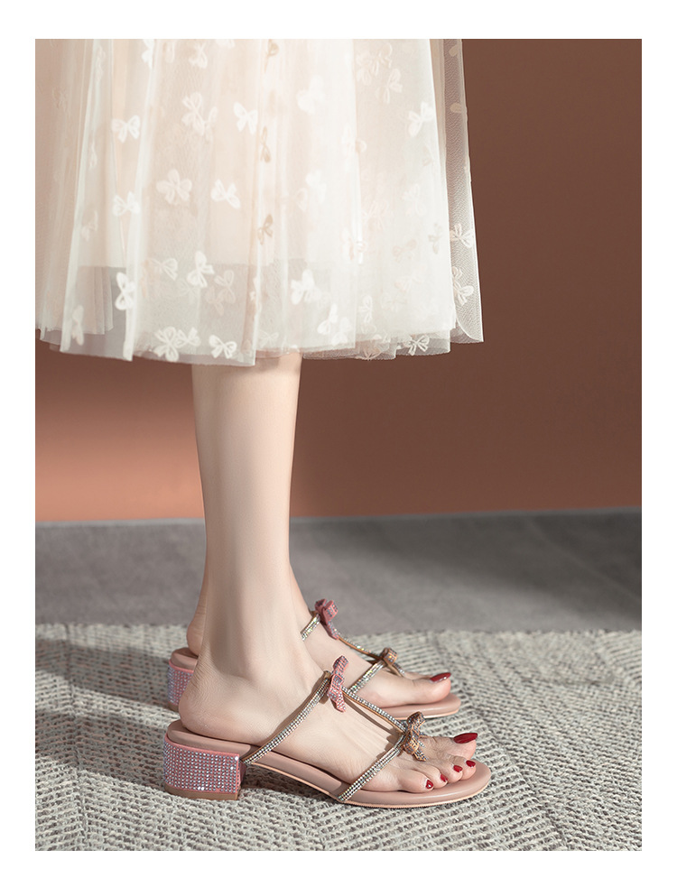 여름 신상품 물방울 모양 샌들 리본 샌들 반짝이는 요정 스타일 슬리퍼 두꺼운 굽 중간 굽 여성용 신발스토어 가기