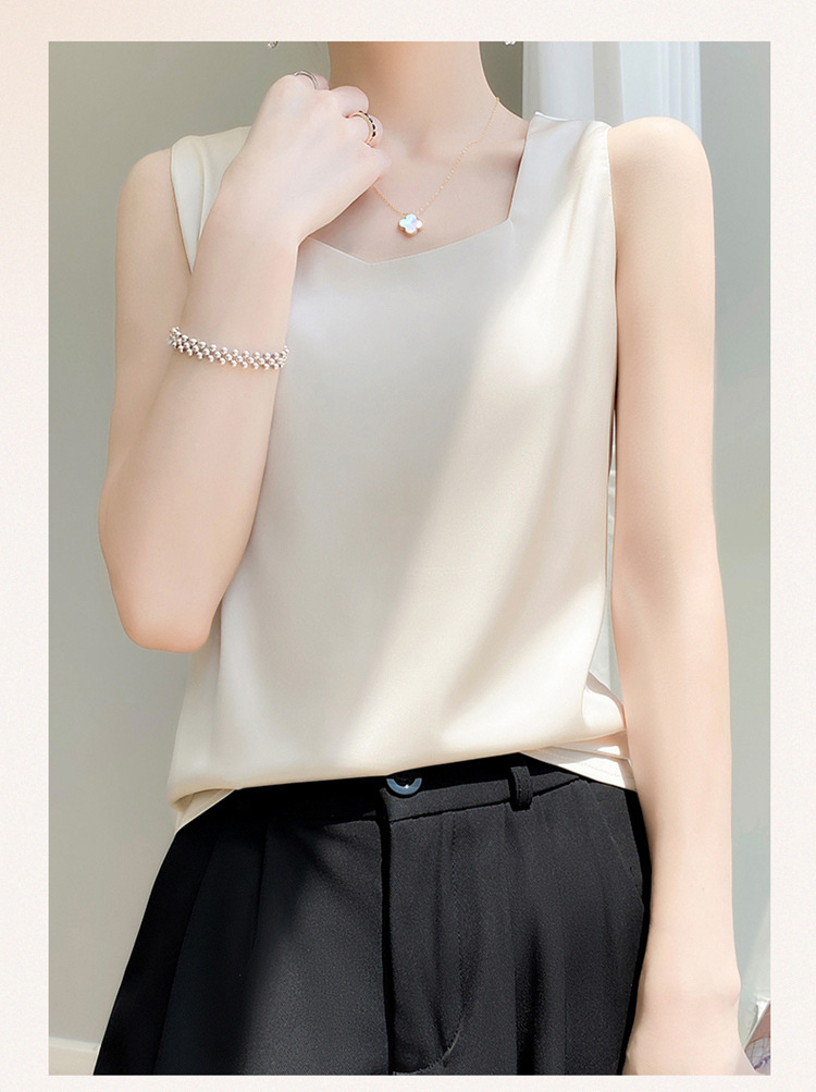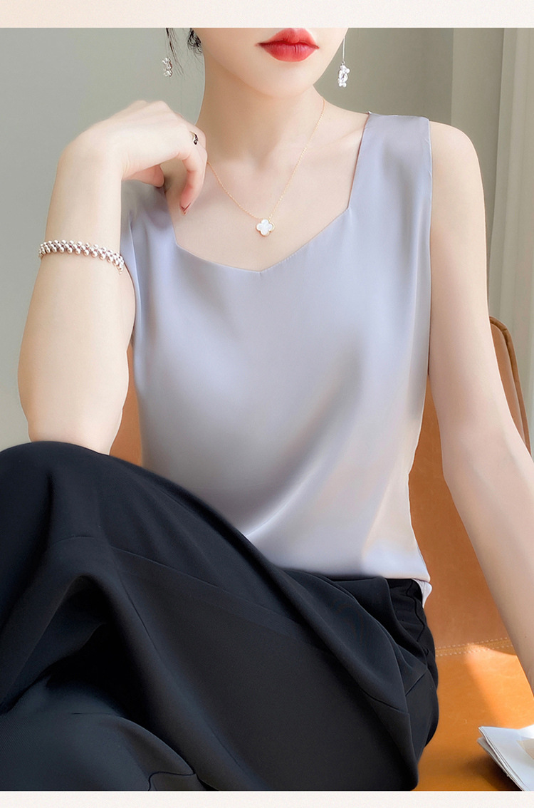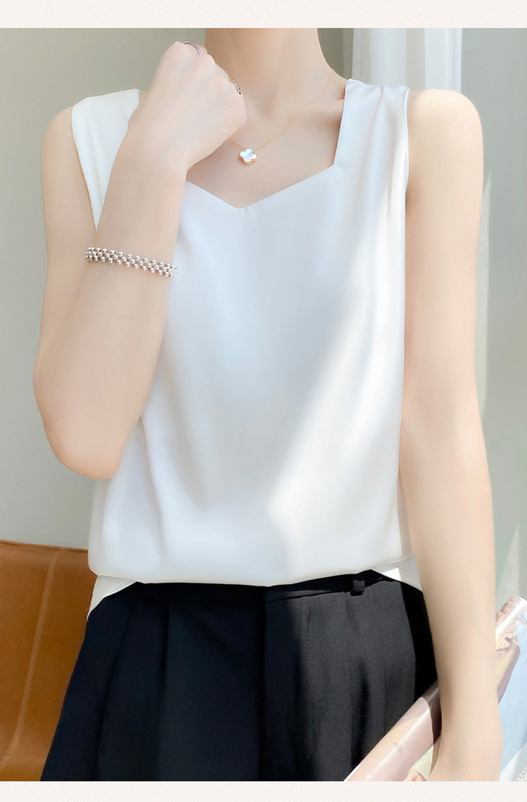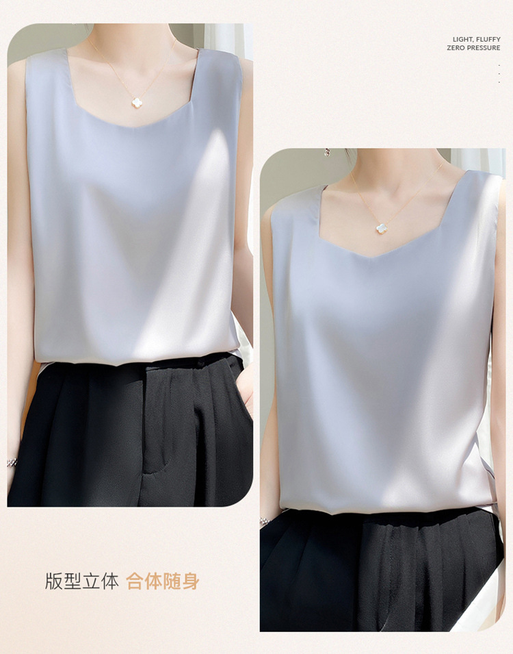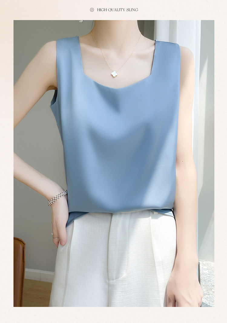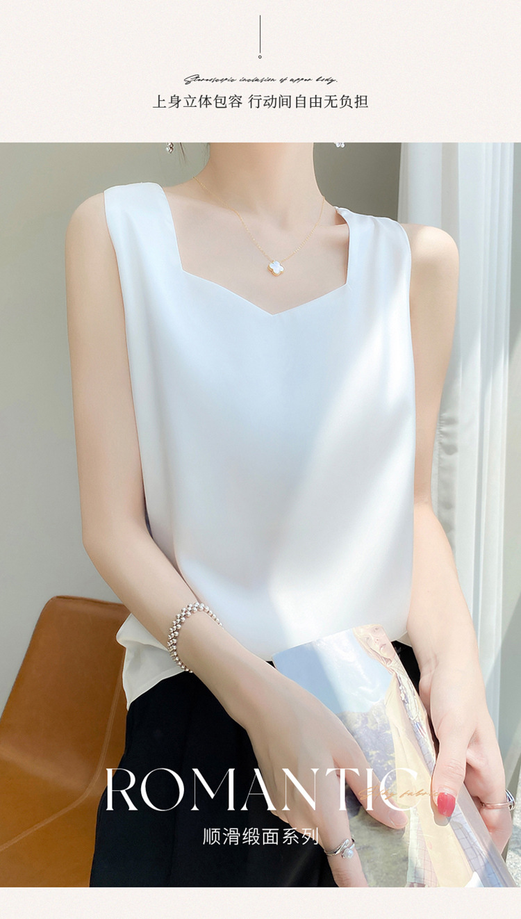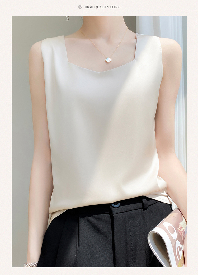 2023 여름 여성용 새로운 하트 모양 V넥 슬링 아세트산 새틴 탑 올매치 슬림핏 와이드 숄더 민소매 조끼
