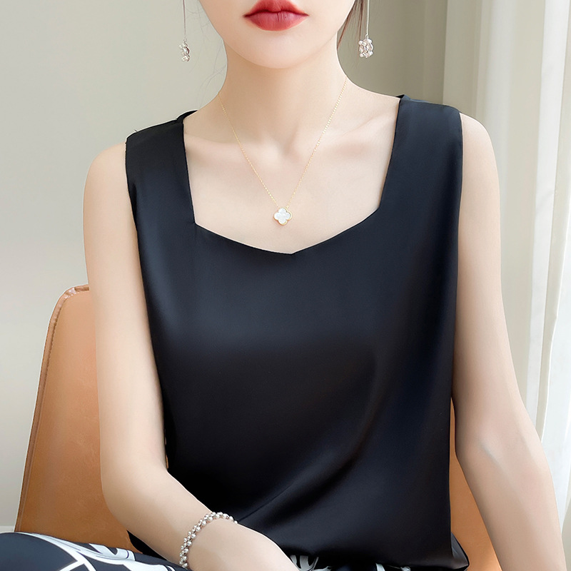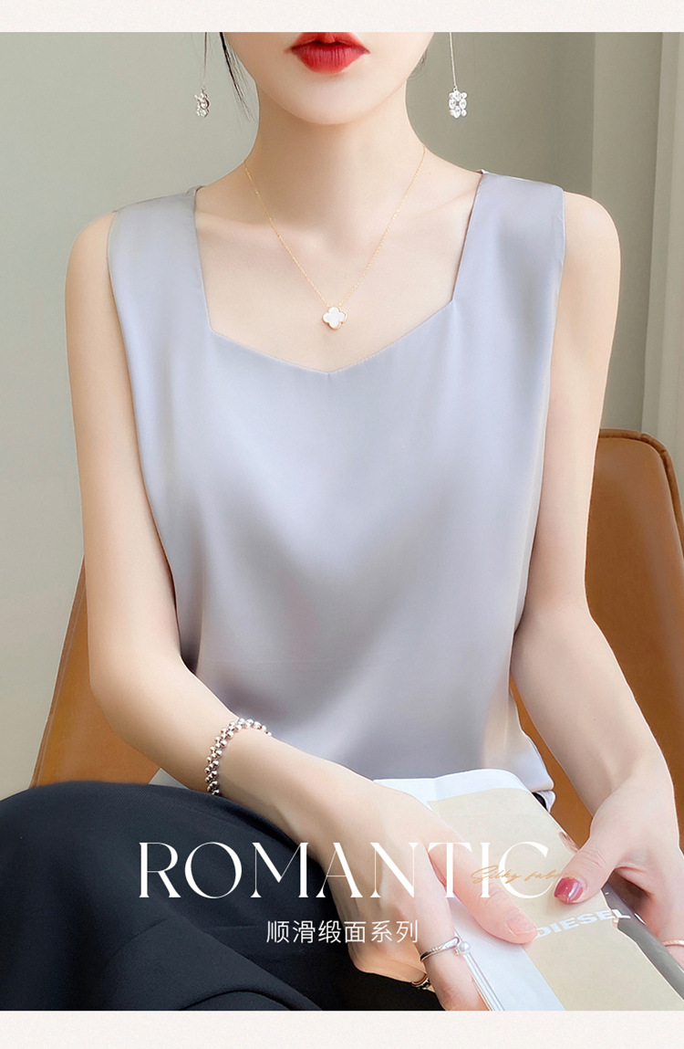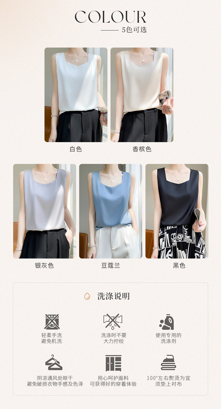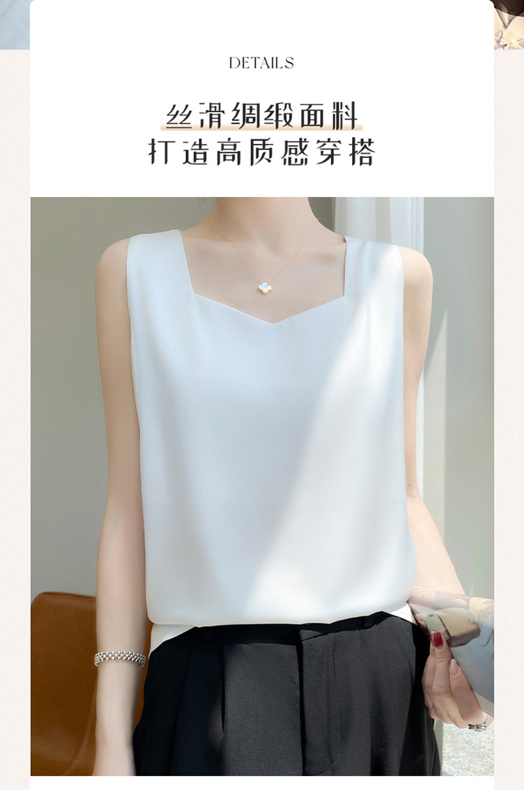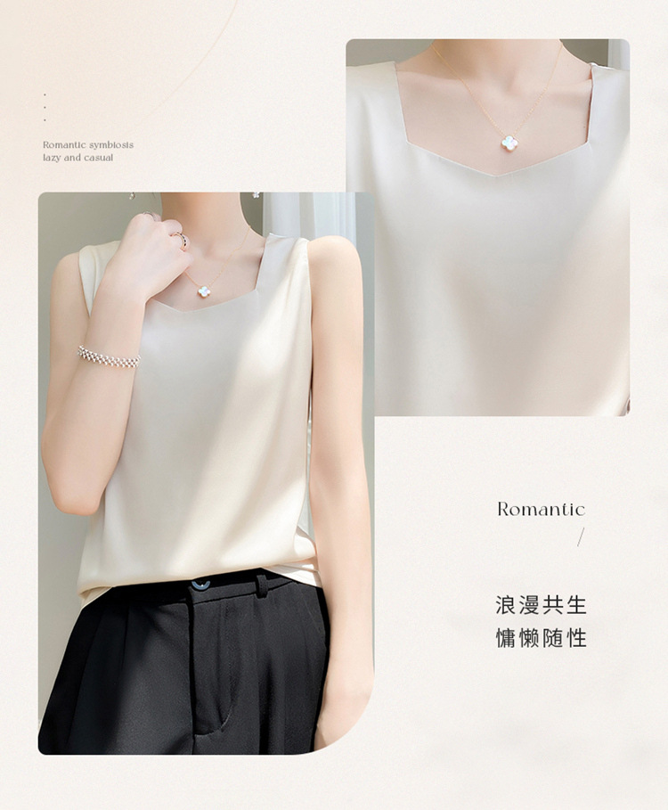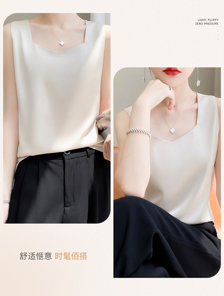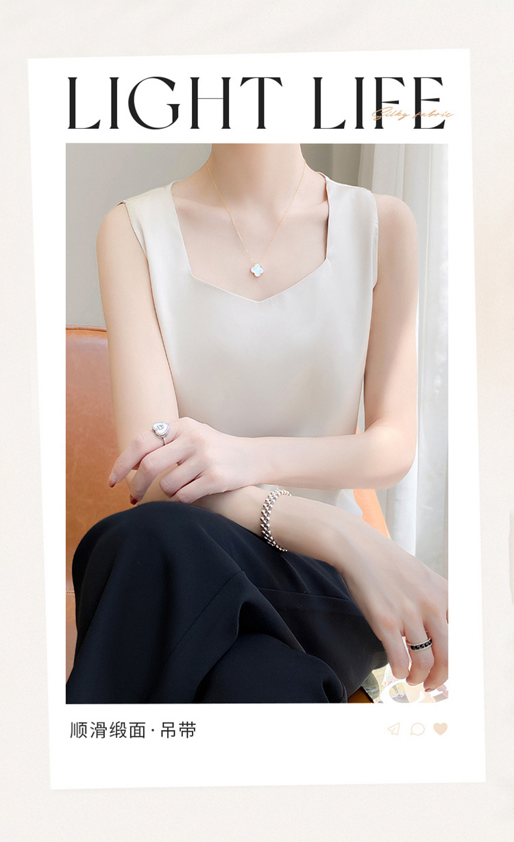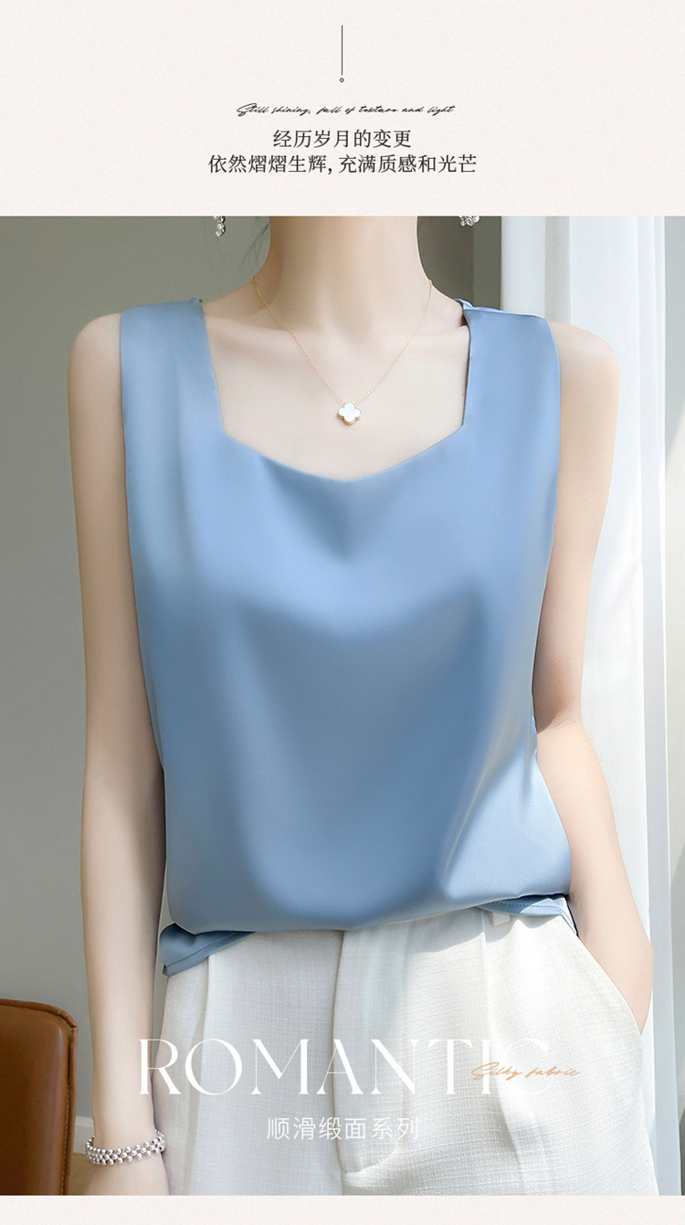 2023 여름 여성용 새로운 하트 모양 V넥 슬링 아세트산 새틴 탑 올매치 슬림핏 와이드 숄더 민소매 조끼
