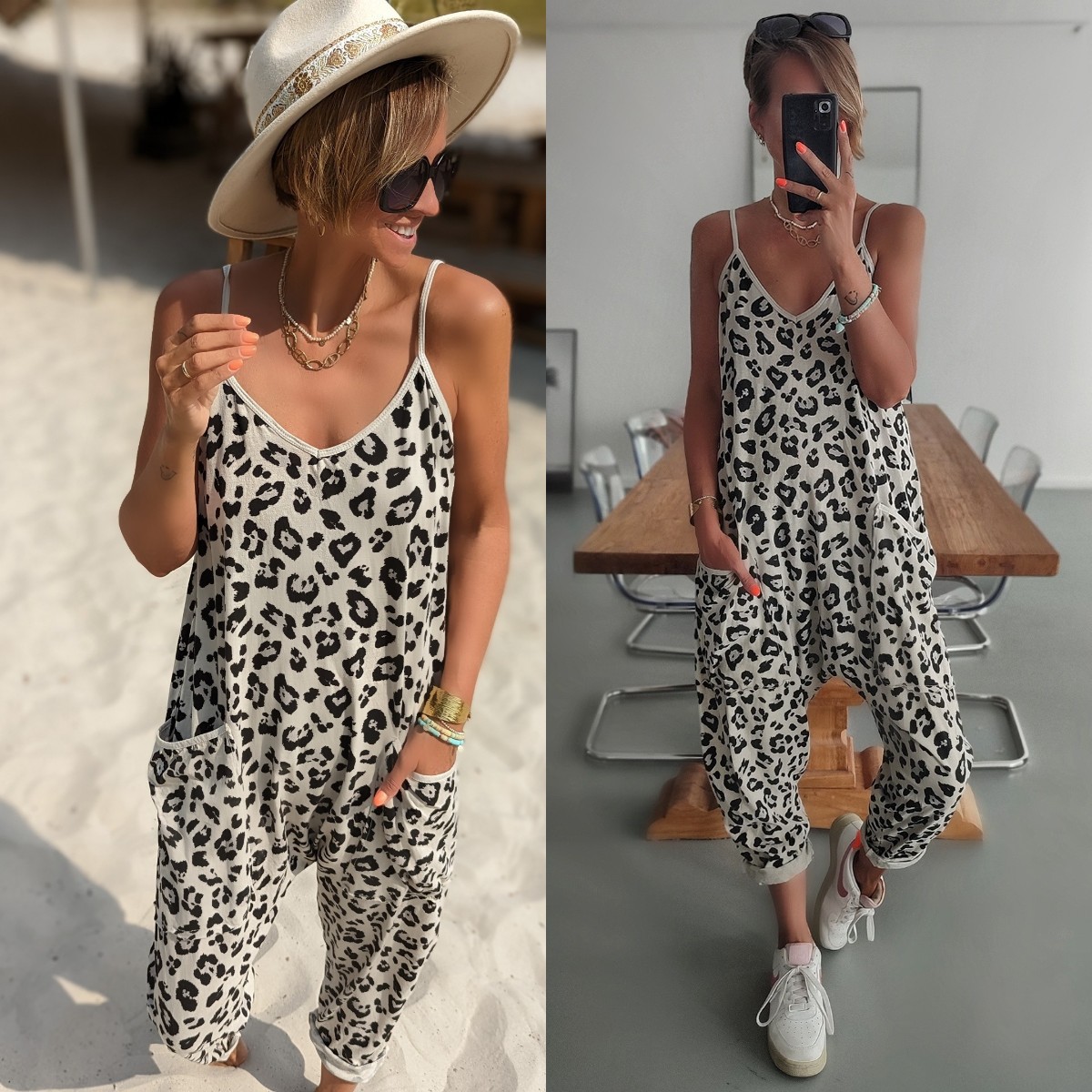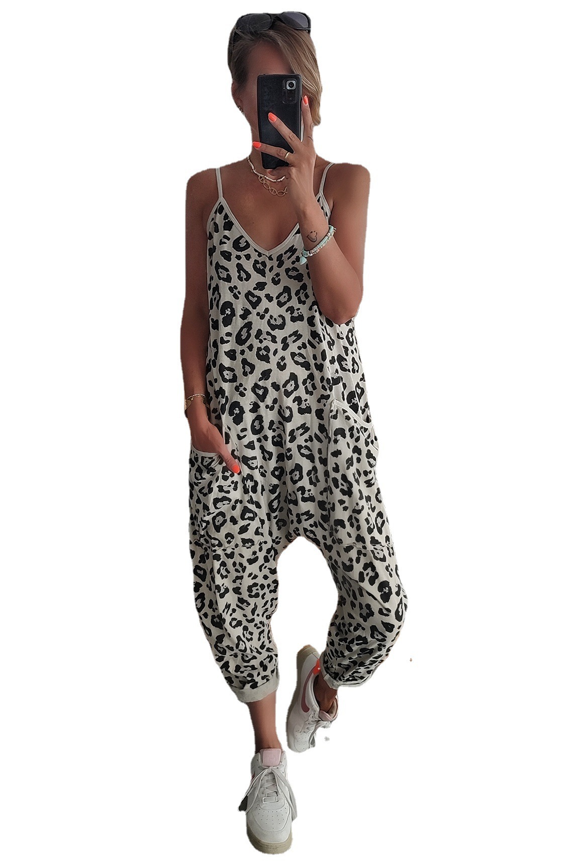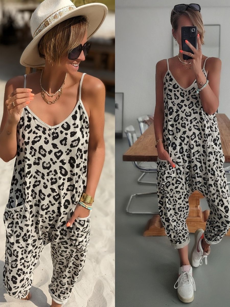 2023 유럽과 미국의 아마존 여름 새로운 느슨한 캐주얼 슬링 레오파드 무늬 포켓 바지 점프 수트스토어 가기