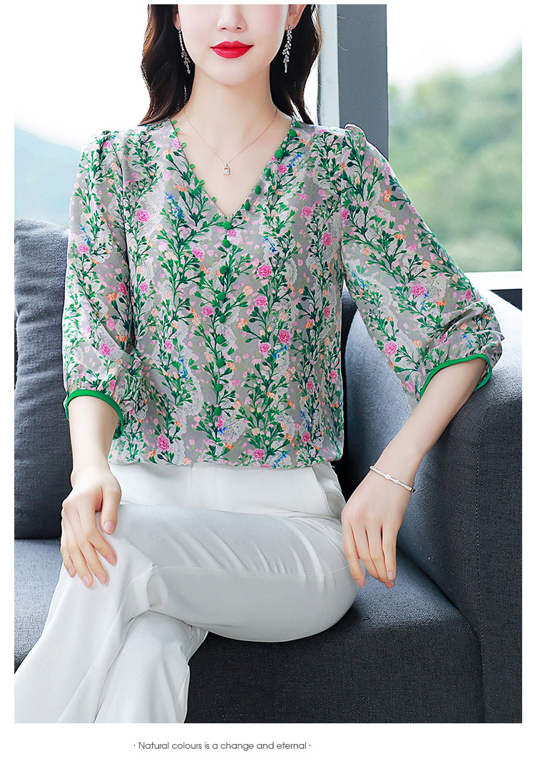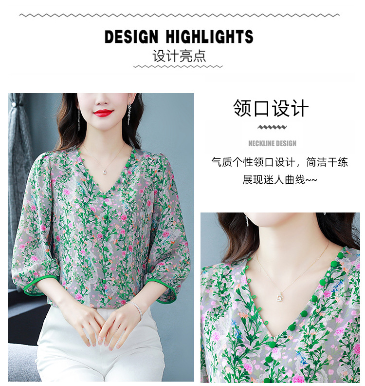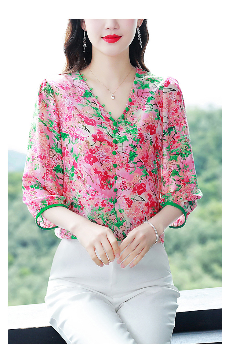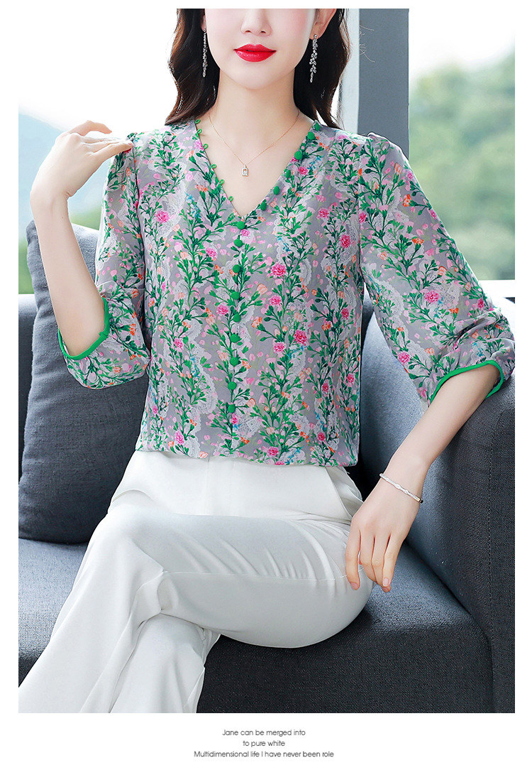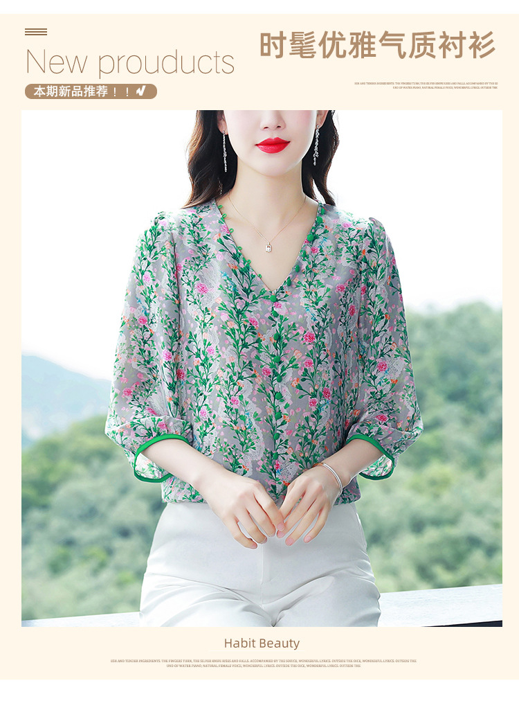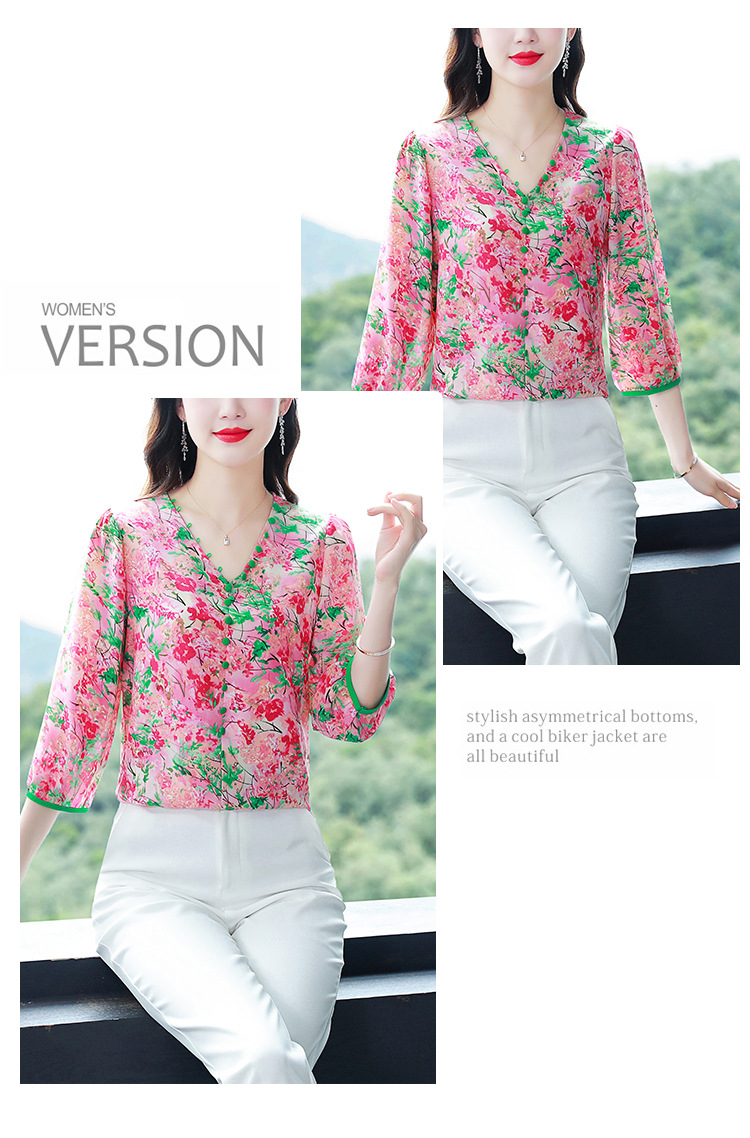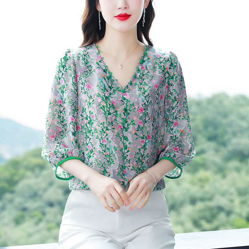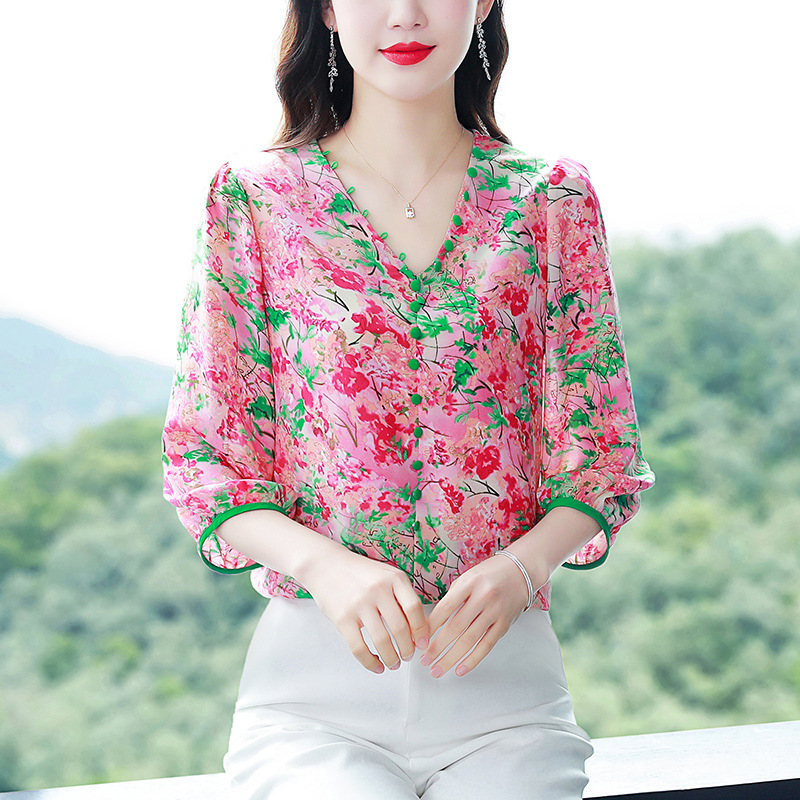 여성용 리얼 샷 인공 실크 탑 여름 2024 새로운 느슨한 V 넥 디자인 민감한 인쇄 꽃 우아한 작은 셔츠