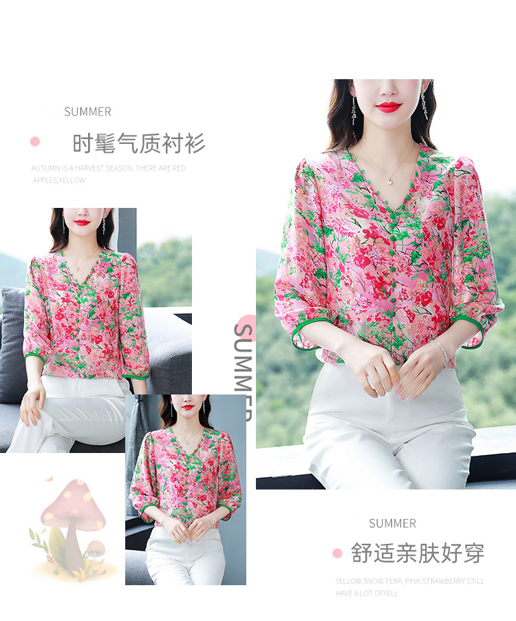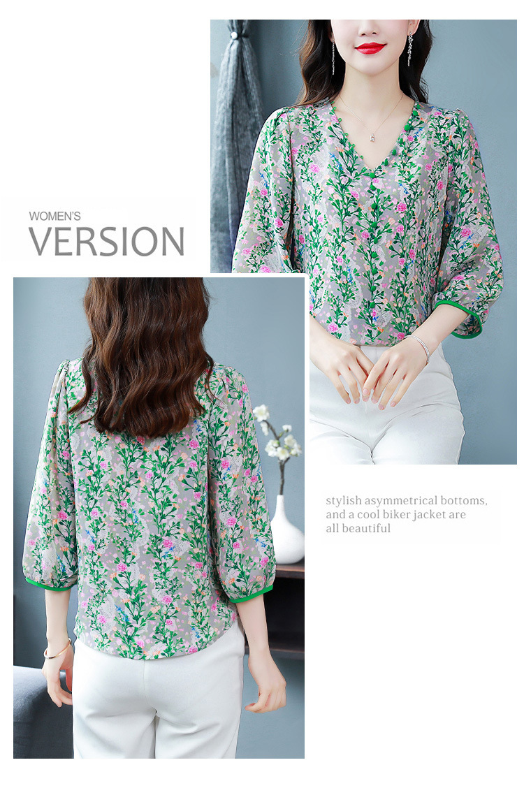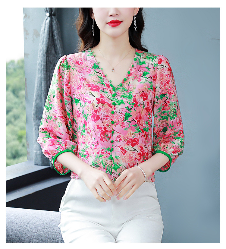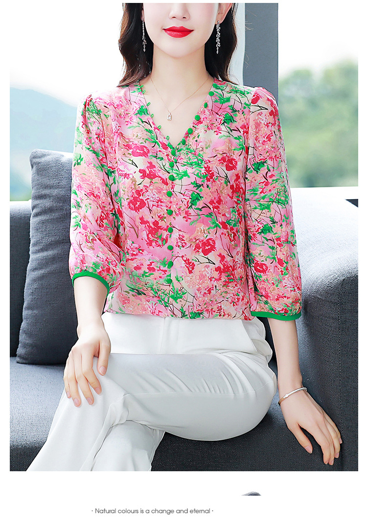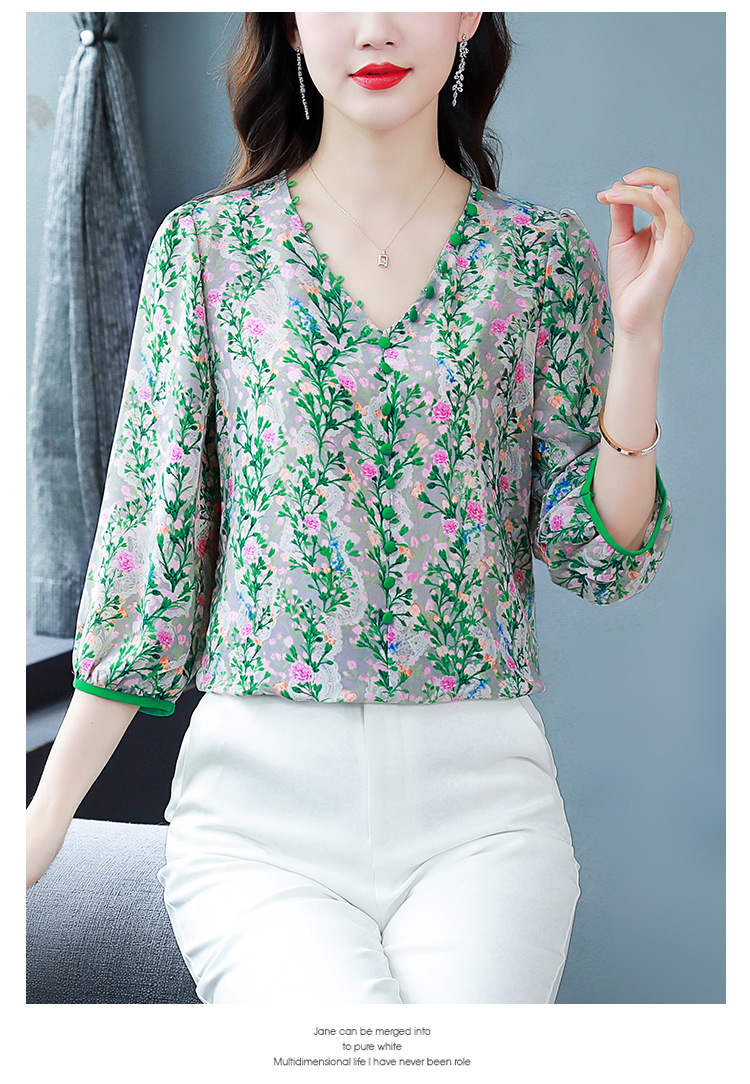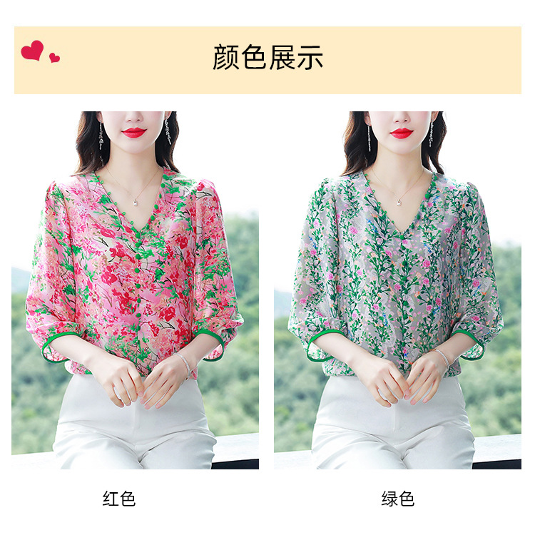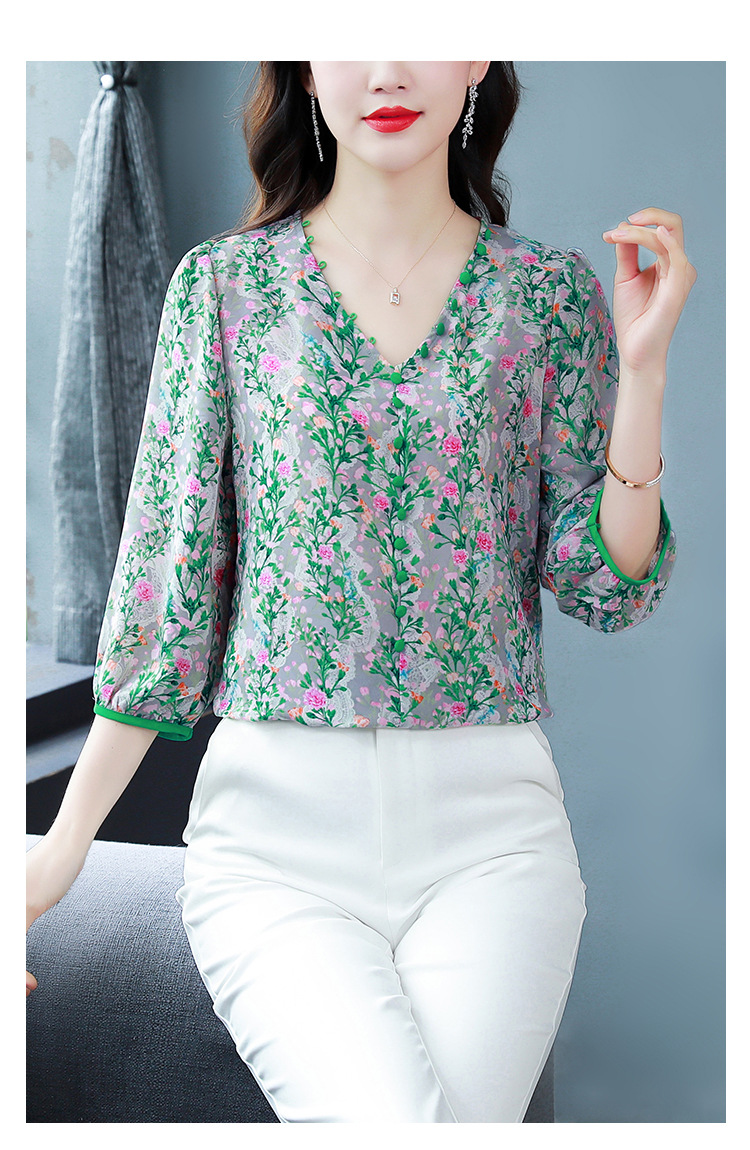 여성용 리얼 샷 인공 실크 탑 여름 2024 새로운 느슨한 V 넥 디자인 민감한 인쇄 꽃 우아한 작은 셔츠