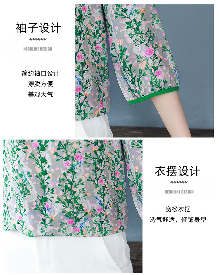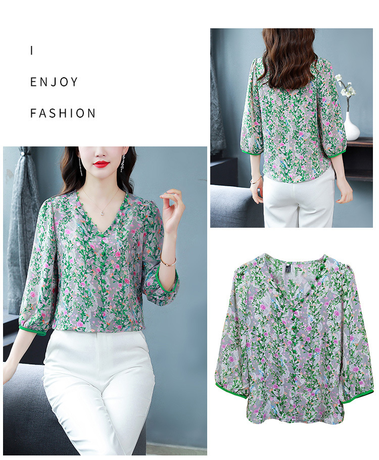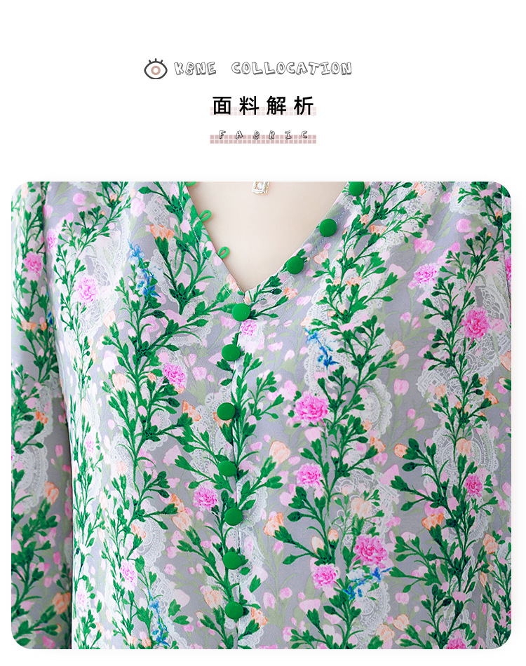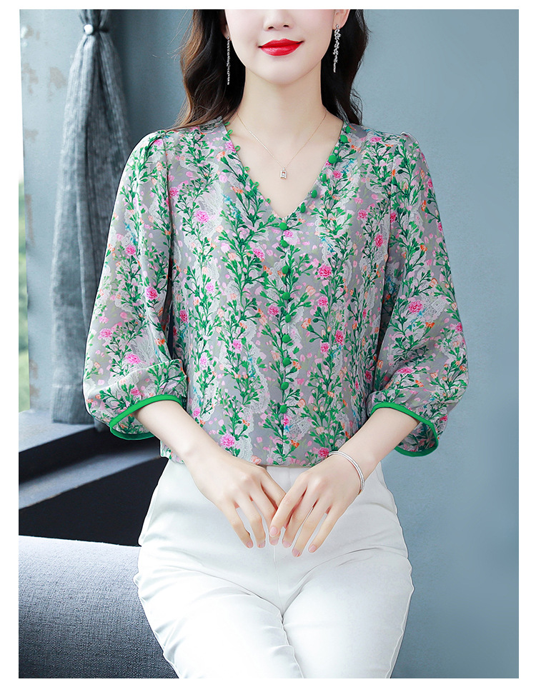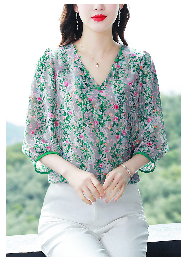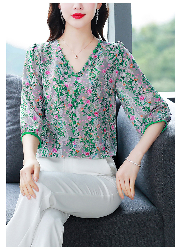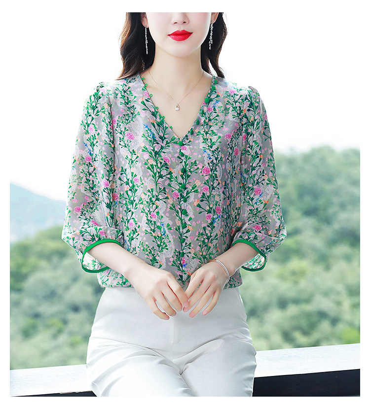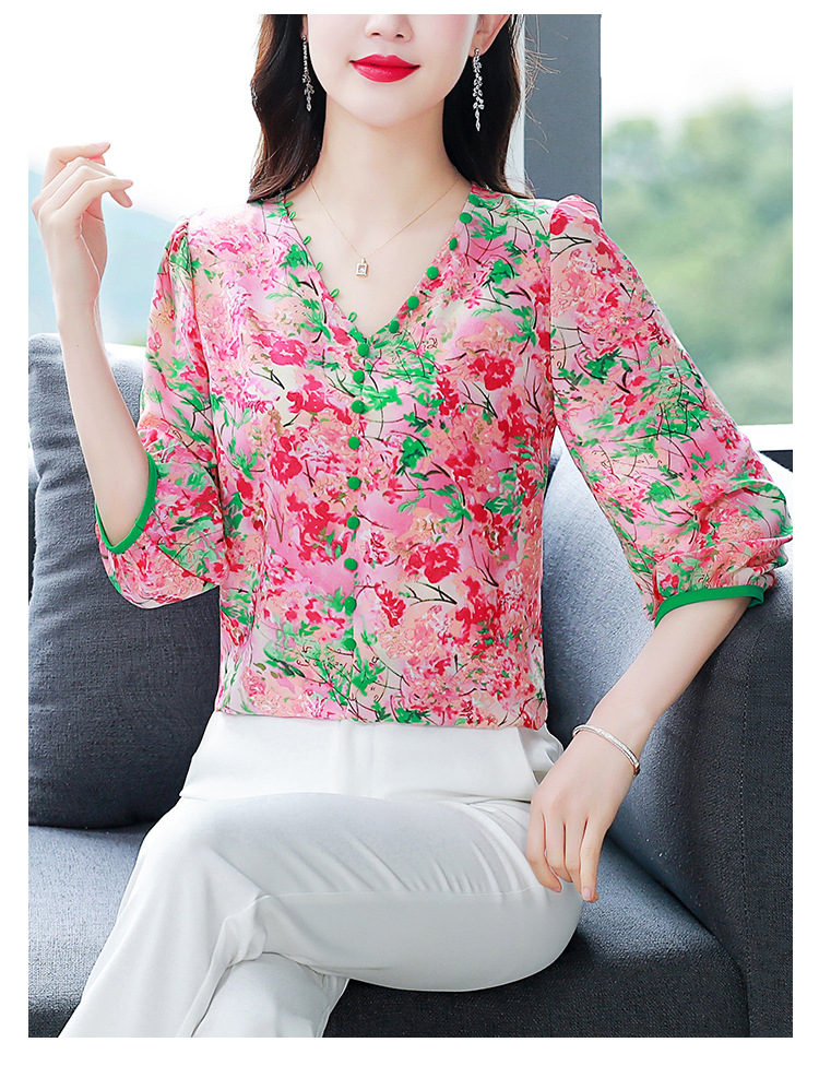 여성용 리얼 샷 인공 실크 탑 여름 2024 새로운 느슨한 V 넥 디자인 민감한 인쇄 꽃 우아한 작은 셔츠