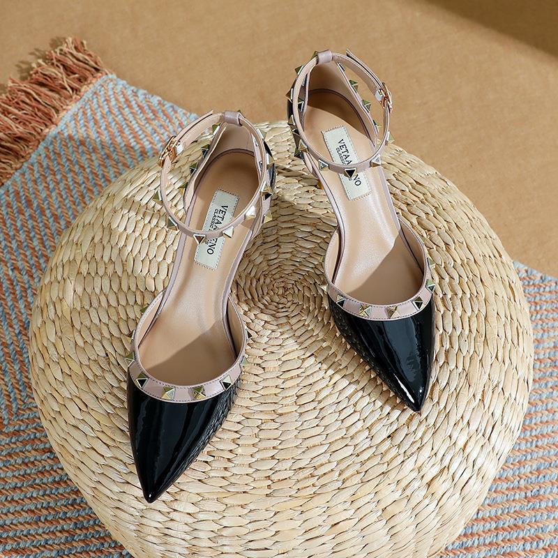 铆钉尖头平底鞋2024春季新款网红漆皮绑带工作平跟柳丁浅口单鞋女