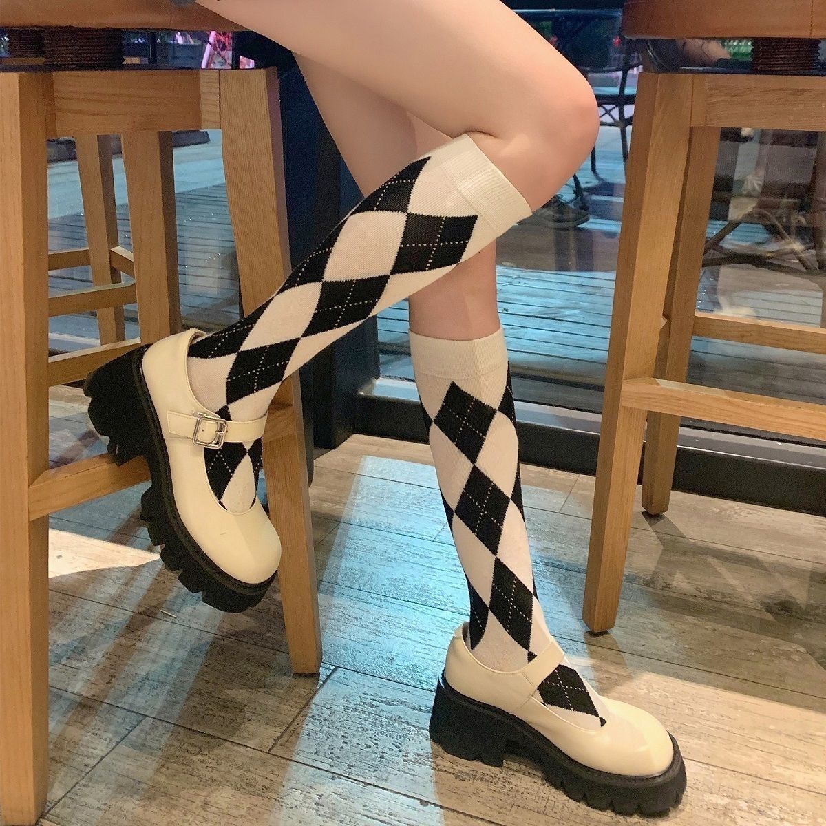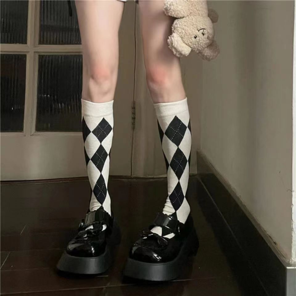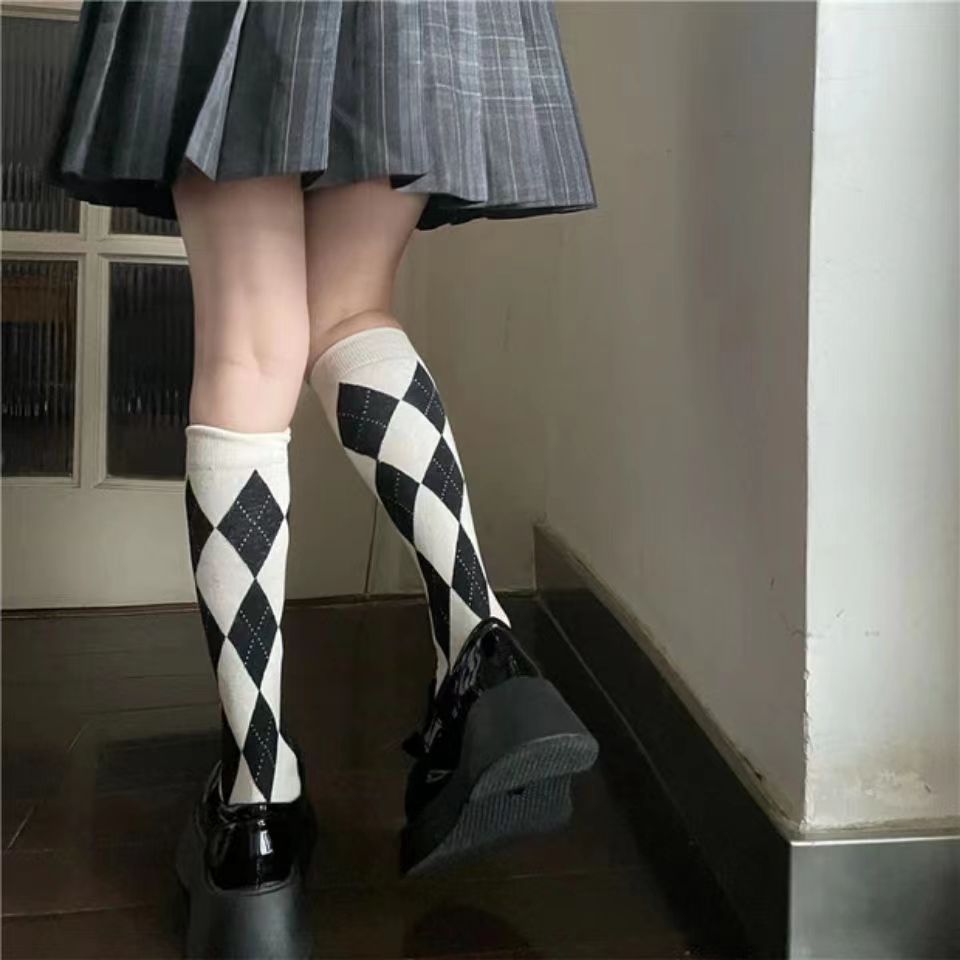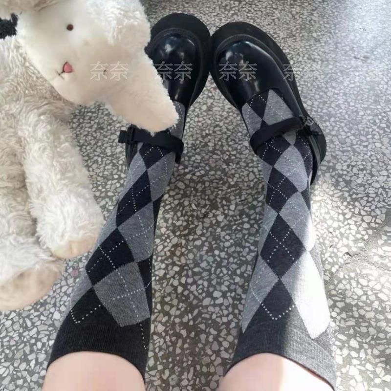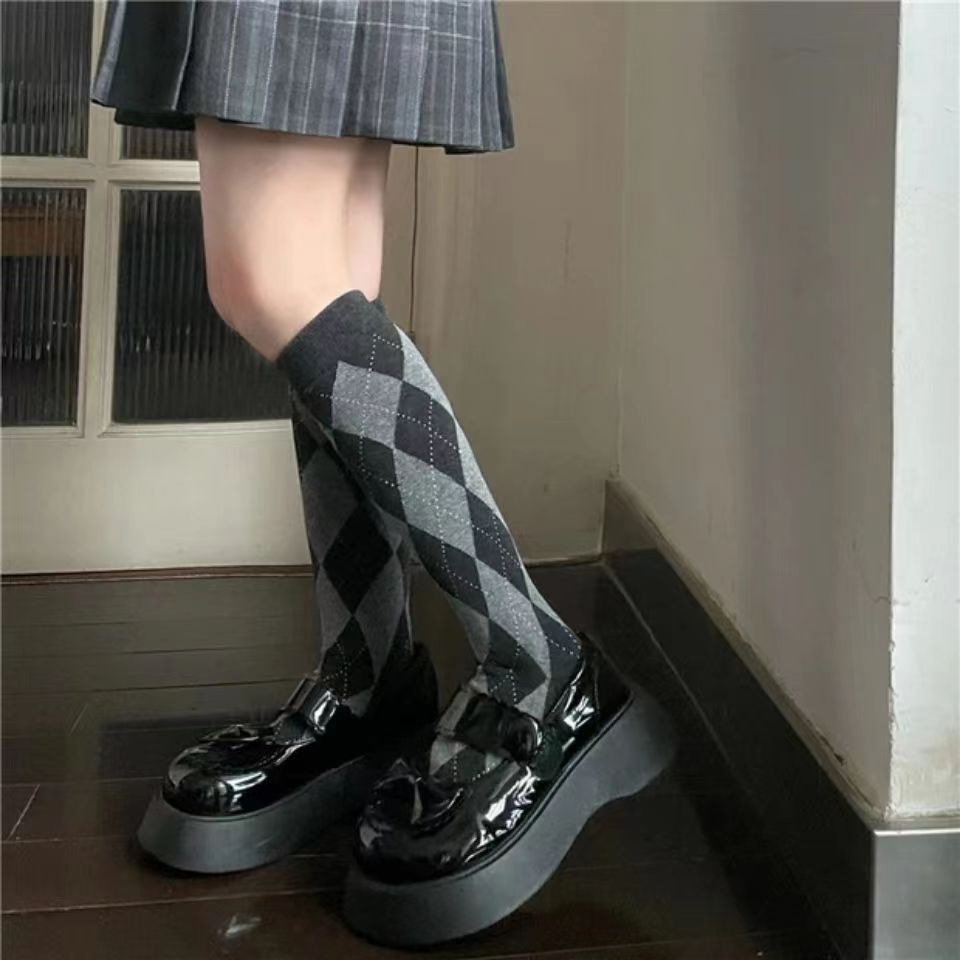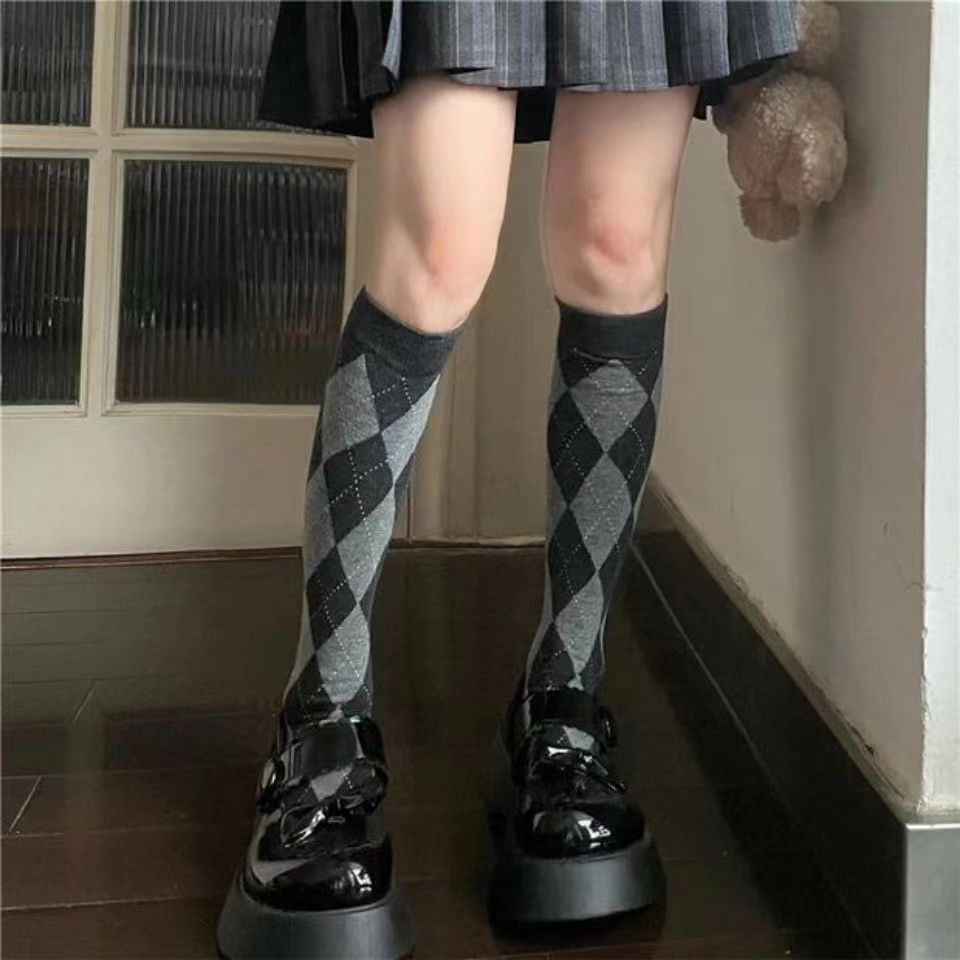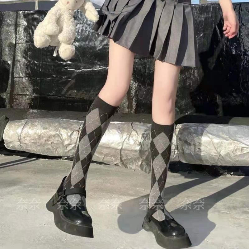 빈티지 다크 브라운 긴 튜브 무릎 양말 마름모꼴 송아지 여자 양말 대학 스타일 유행 양말 코스프레