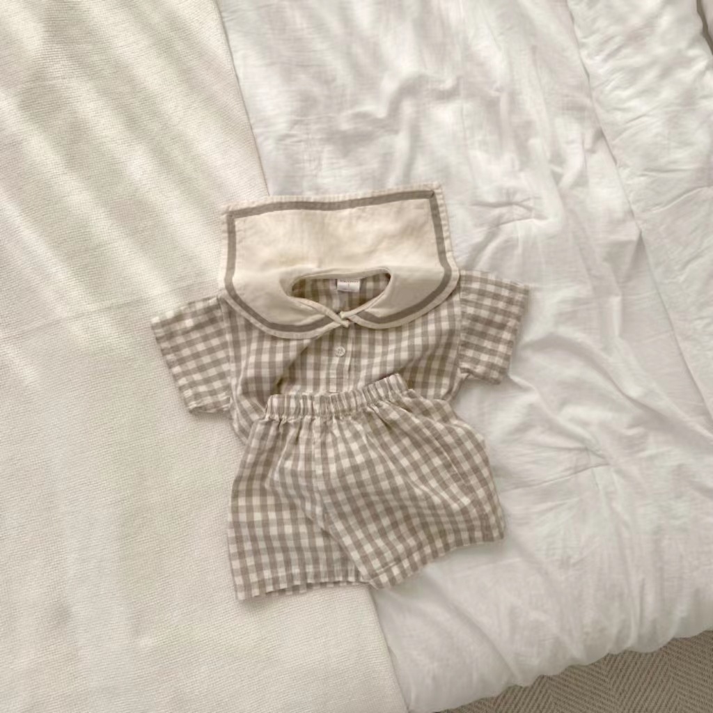 한국어 남성과 여성의 네이비 칼라 격자 무늬 반팔 반바지 바지 신선한 캐주얼 통기성 라르 여름 세트스토어 가기