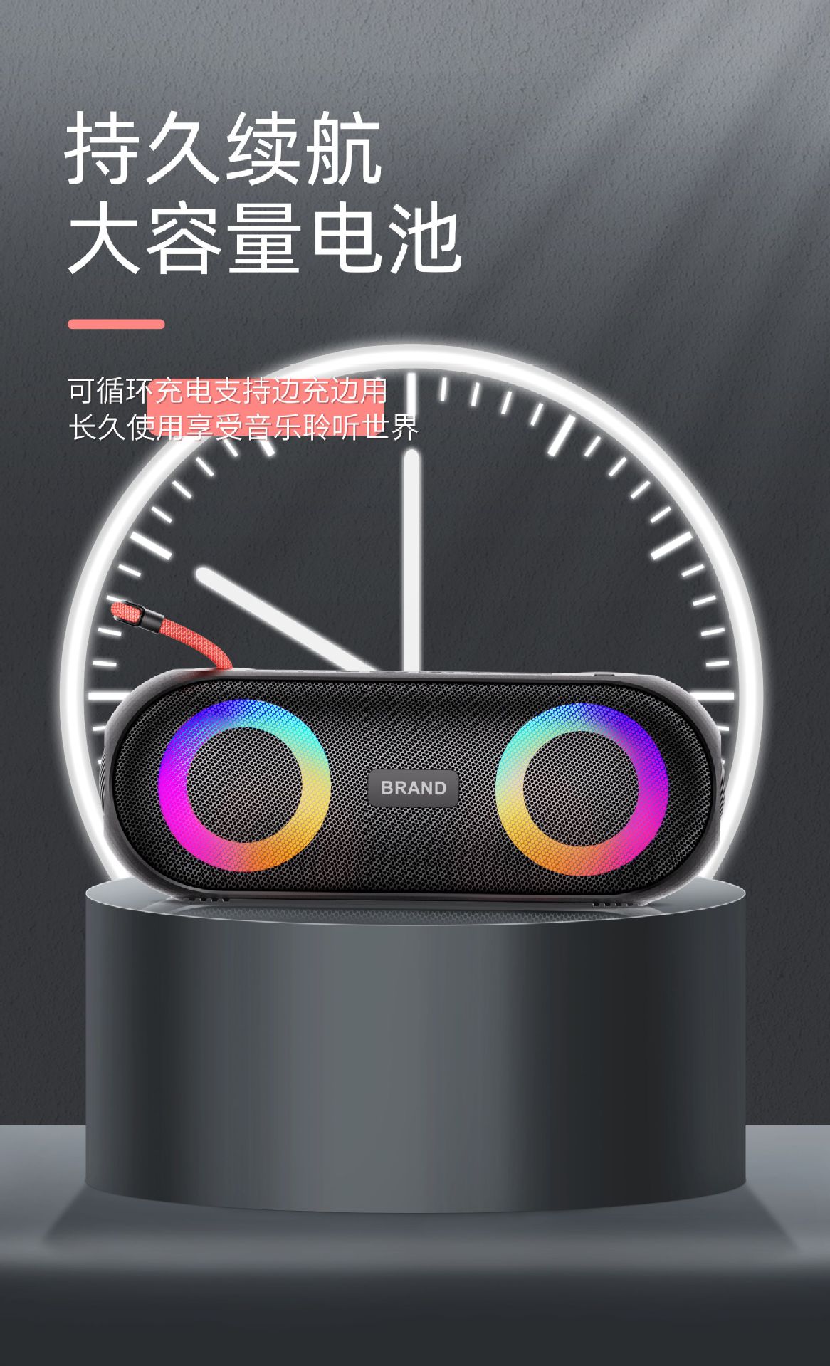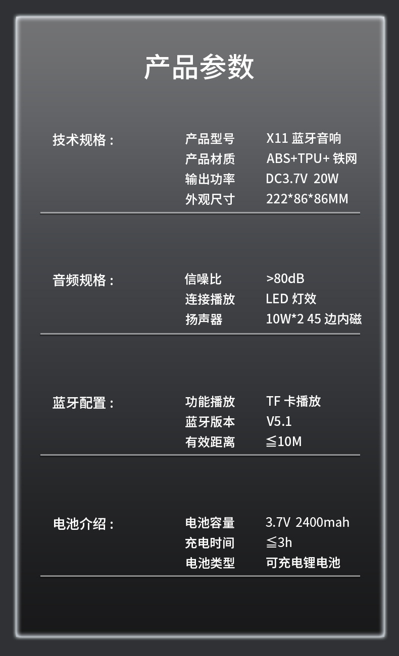 功能:蓝牙连接/TF卡/AUX/TWS互联播放