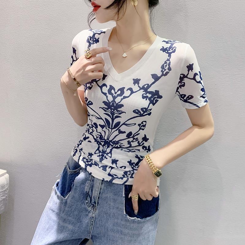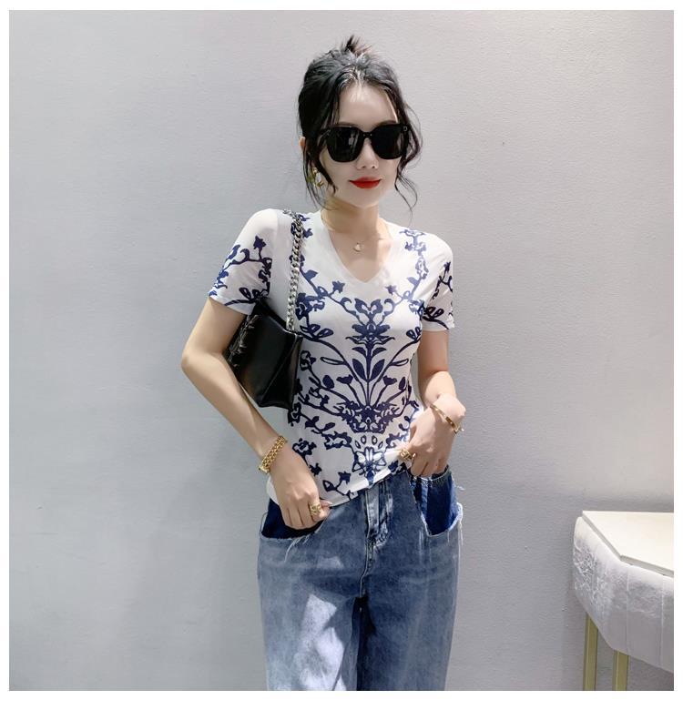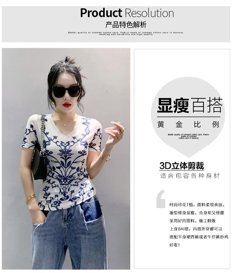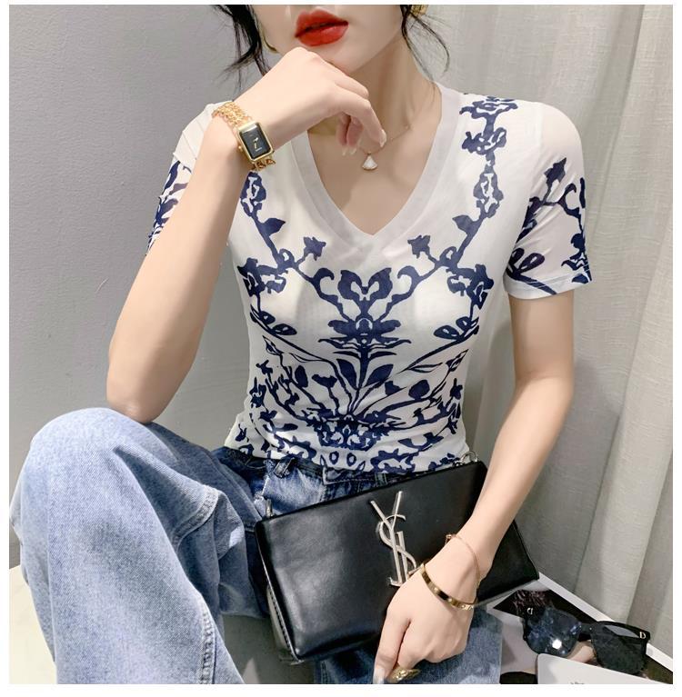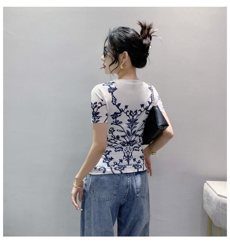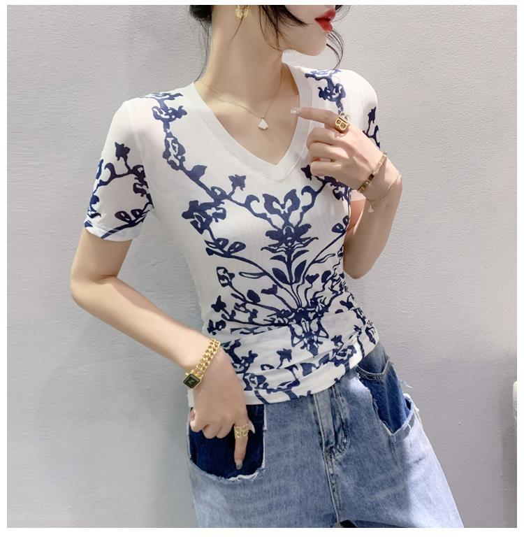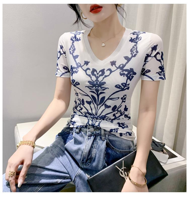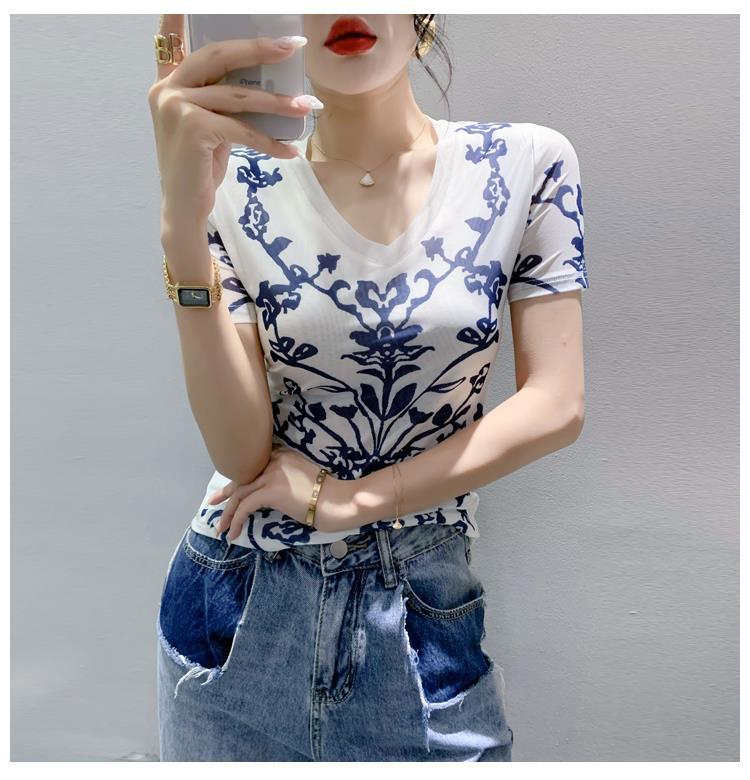 유럽 제품 2025 여름 새 스타일 메쉬 포지셔닝 프린트 V 넥 반팔 티셔츠 여성 패션 슬림 바닥 셔츠 유행 배송스토어 가기