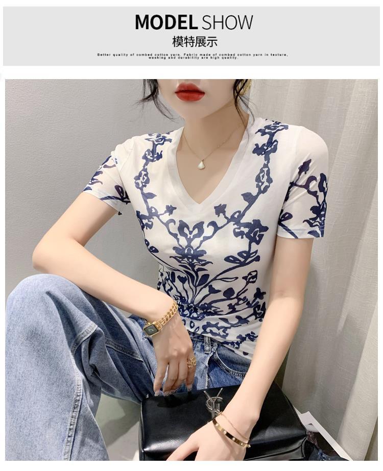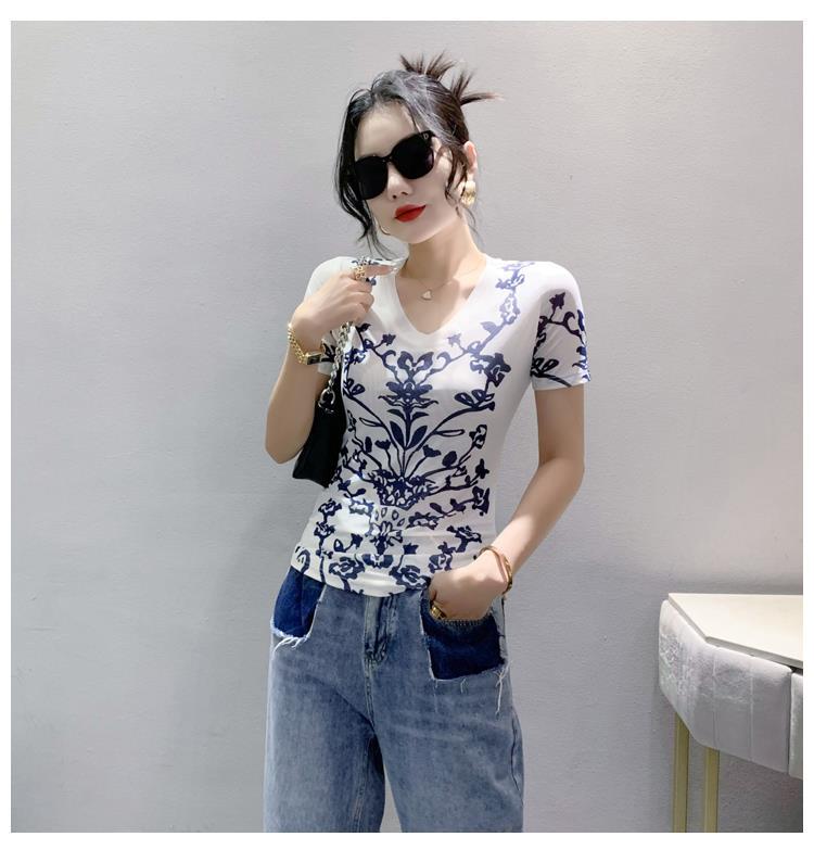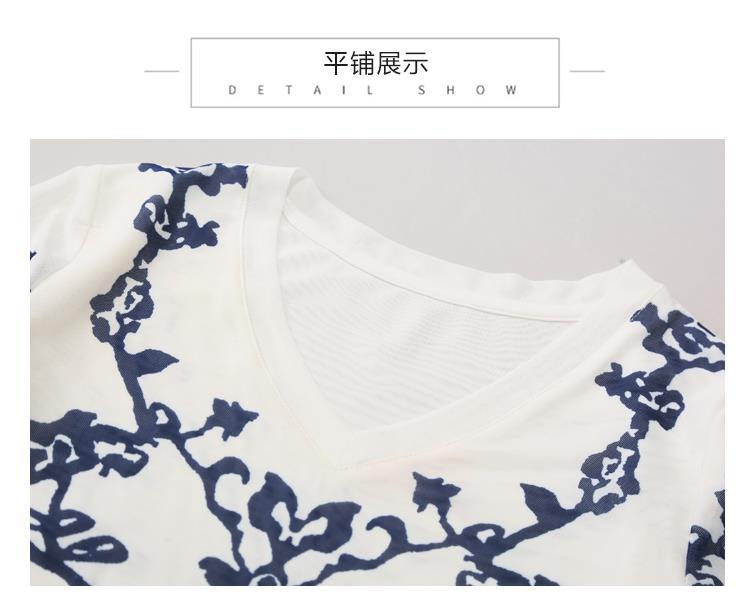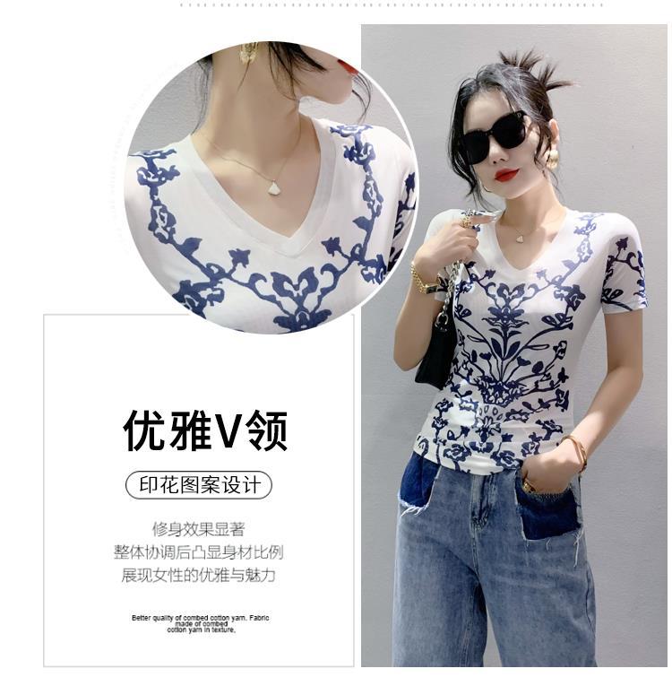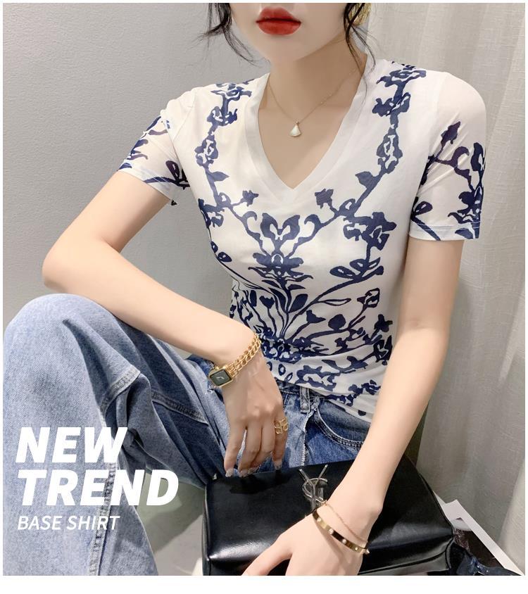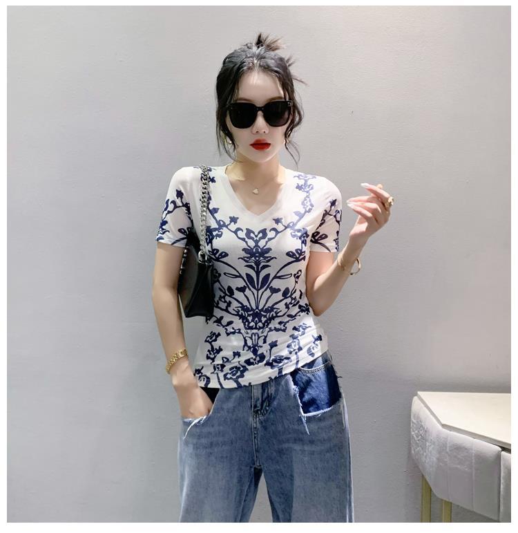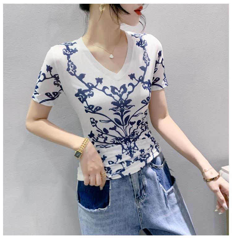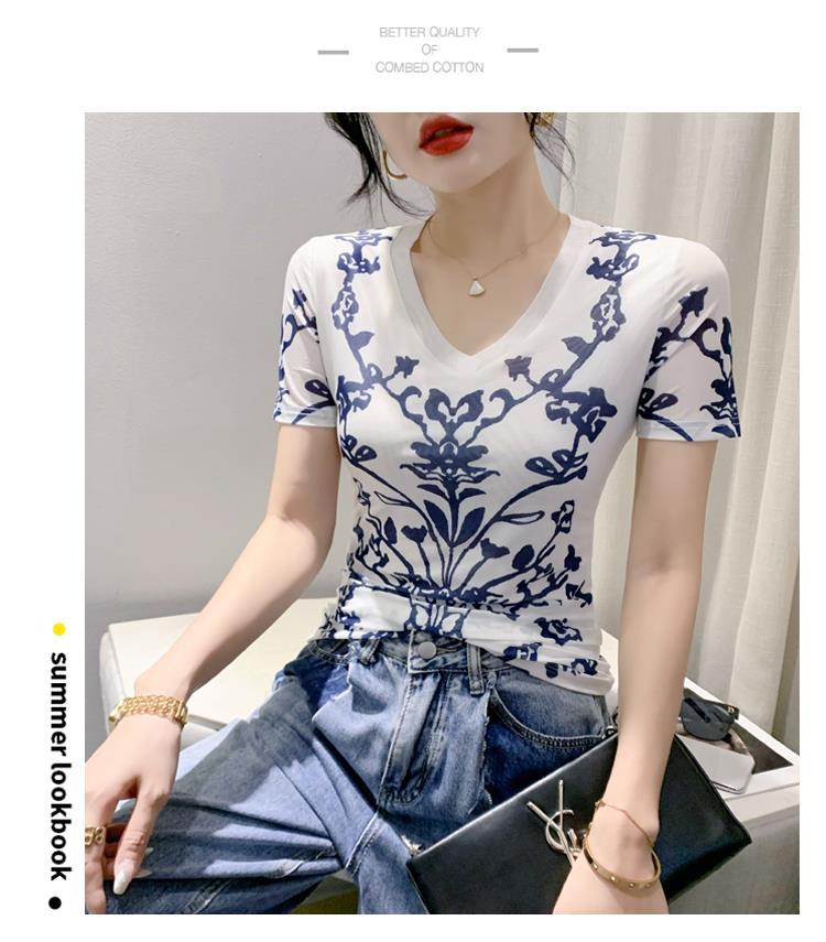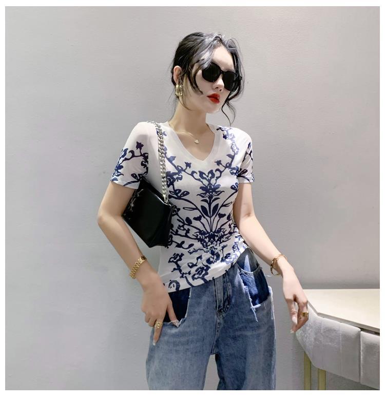 유럽 제품 2025 여름 새 스타일 메쉬 포지셔닝 프린트 V 넥 반팔 티셔츠 여성 패션 슬림 바닥 셔츠 유행 배송스토어 가기