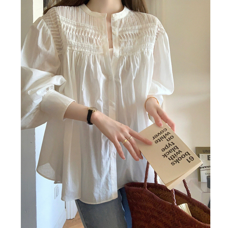 프랑스 복고풍 흰색 면과 린넨 탑 여성의 여름 디자인 감각 틈새 하이 지 센스 인형 셔츠 달콤한 긴 소매 셔츠스토어 가기