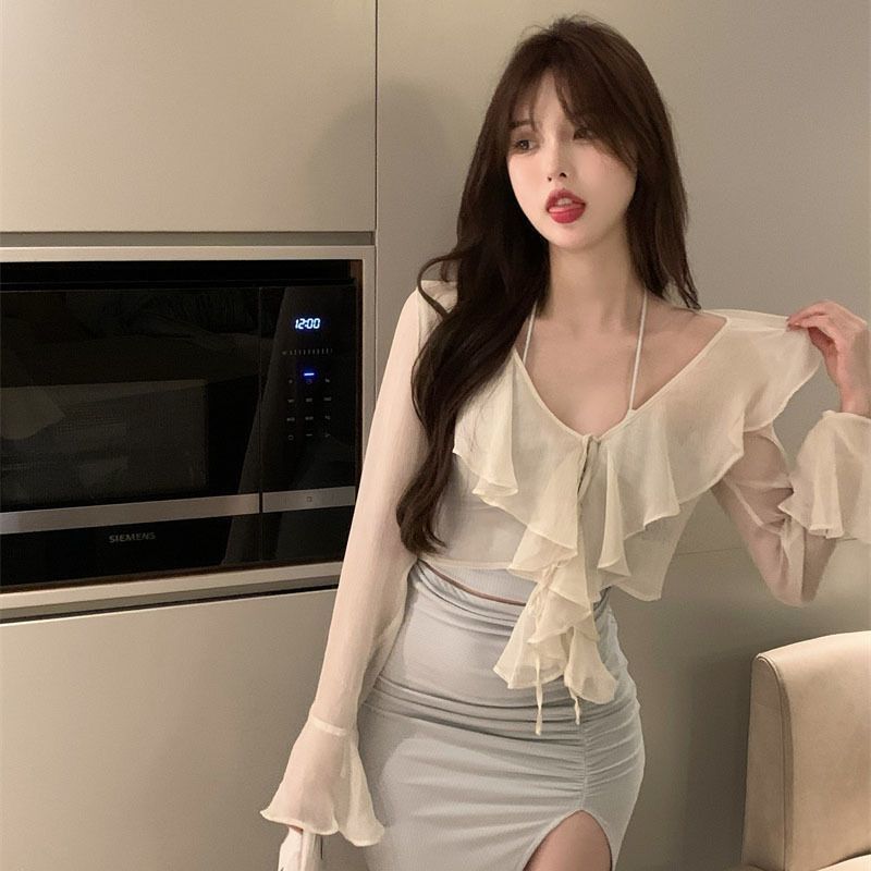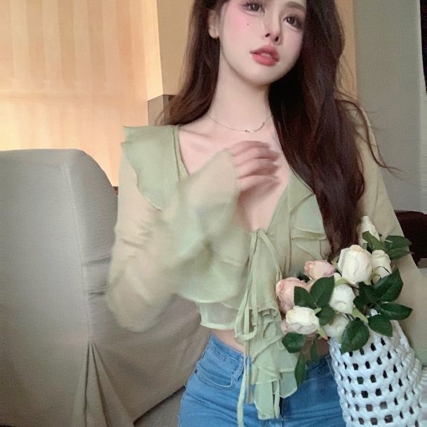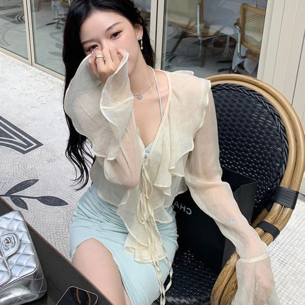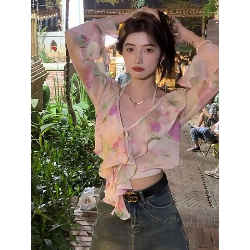 프랑스 스타일 달콤한 꽃 쉬폰 셔츠 여성용 우아한 스트랩 느슨한 슬리밍 주름 장식이 달린 짧은 탑 자외선 차단제 카디건스토어 가기