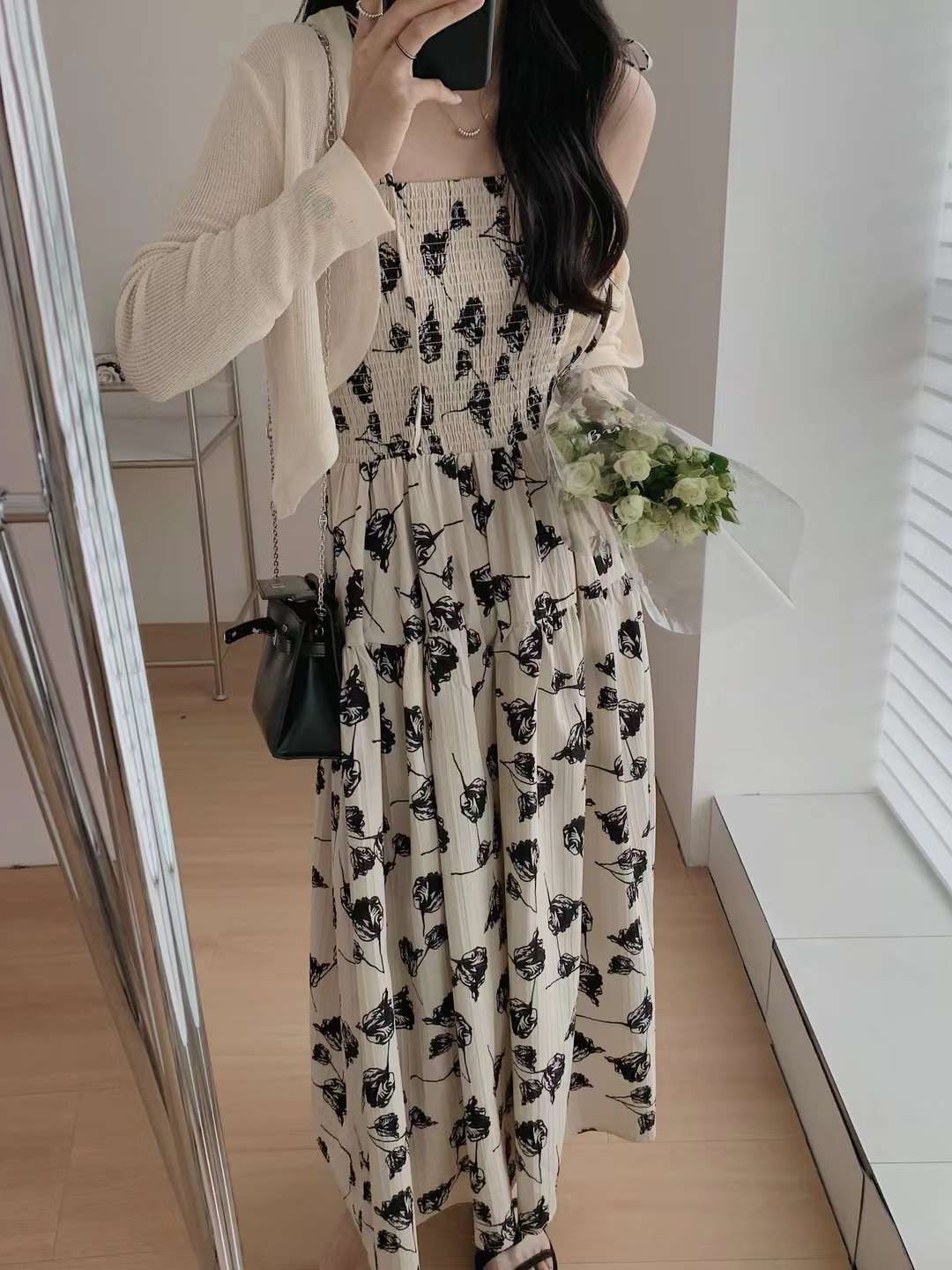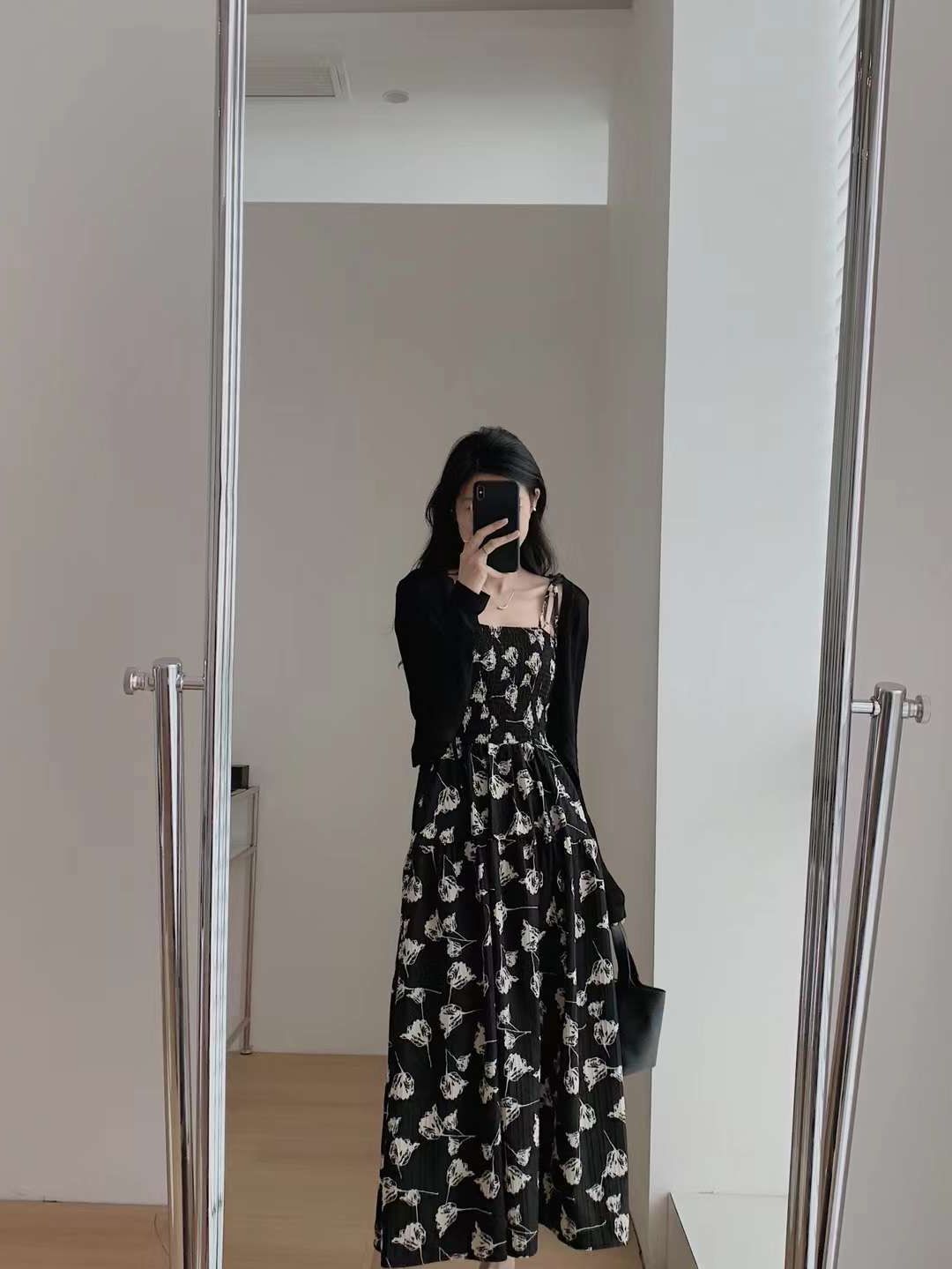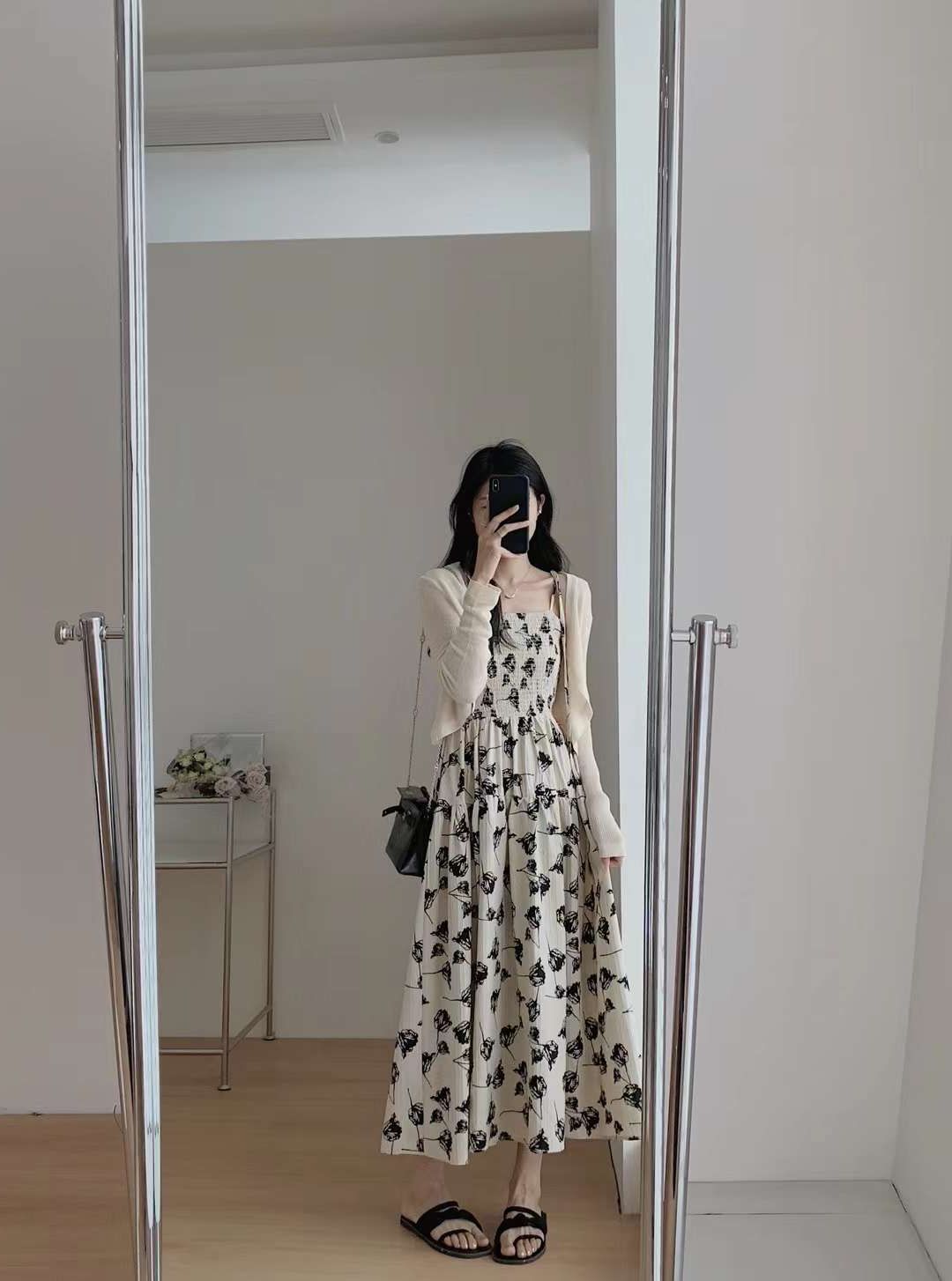 Aiyixuan 차 휴식 프랑스 꽃 슬링 원피스 여자의 여름 고급 기질 슬리밍 세트스토어 가기