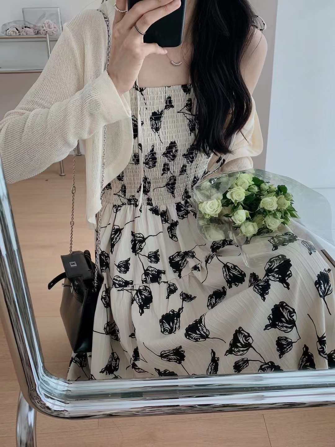 Aiyixuan 차 휴식 프랑스 꽃 슬링 원피스 여자의 여름 고급 기질 슬리밍 세트