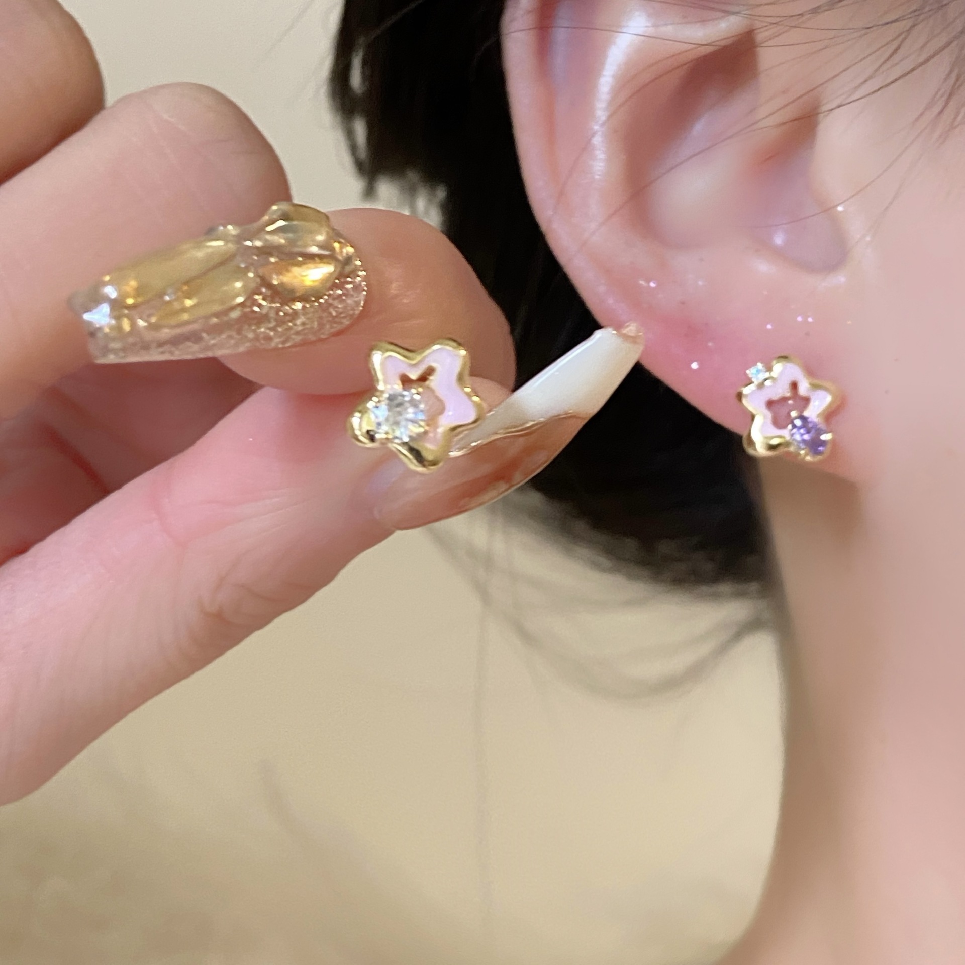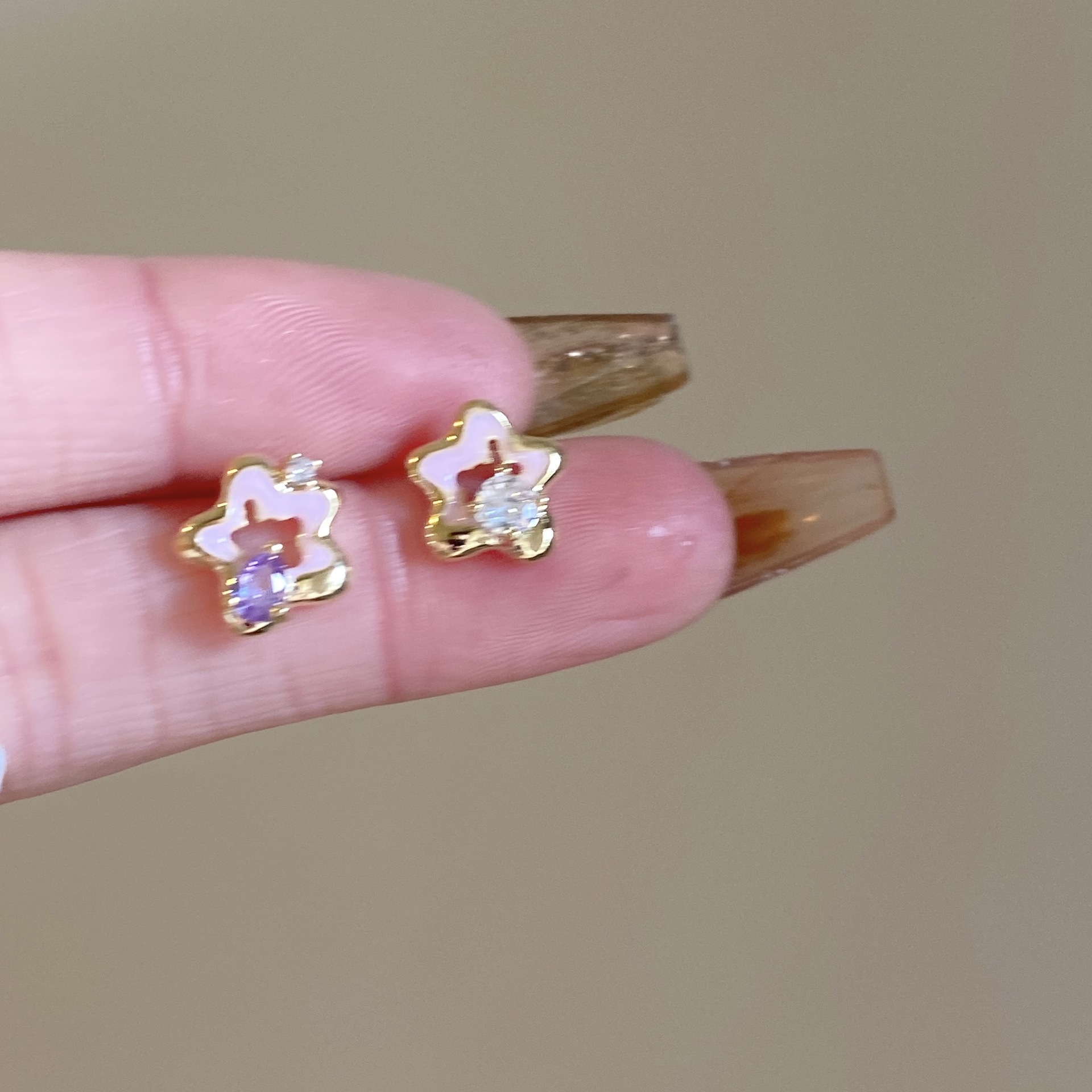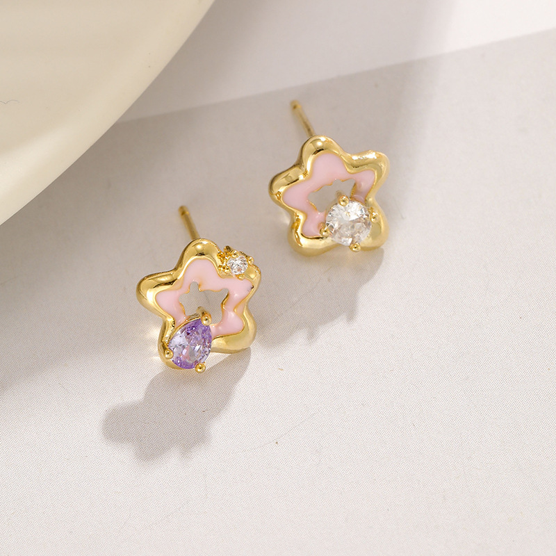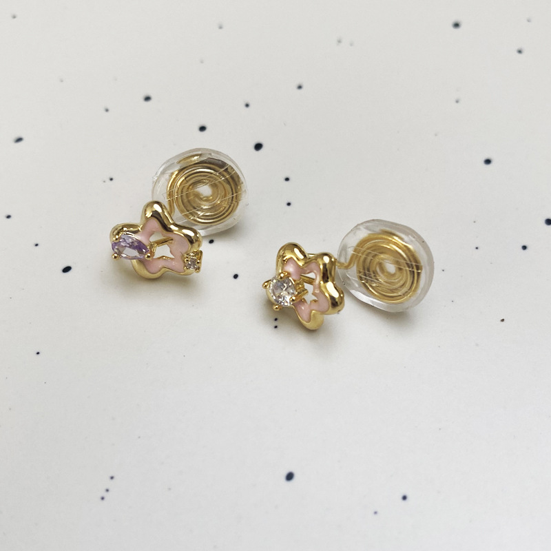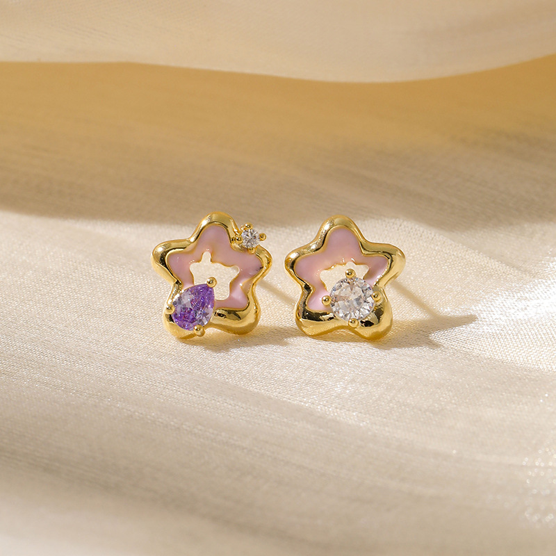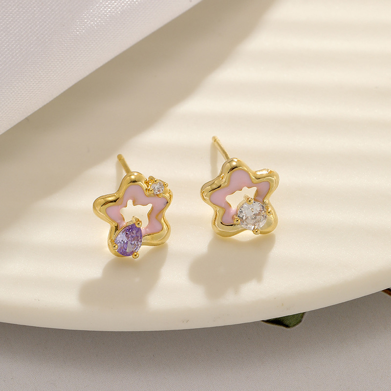 [구리 + 지르콘] 핑크 작은 오각형 별 귀걸이 여성 2023 새로운 귀여운 소녀 귀걸이 실버 핀