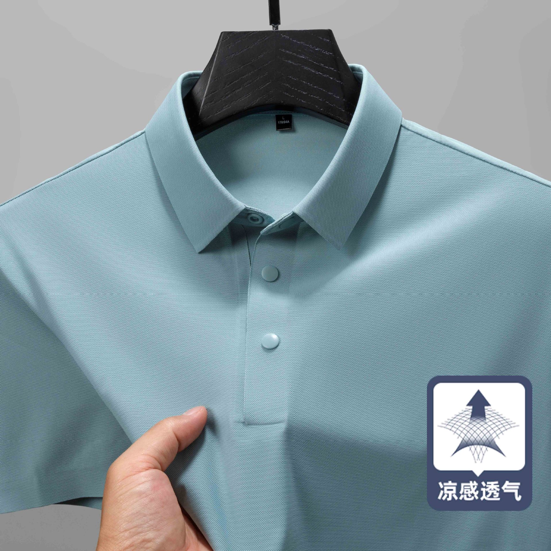 [스냅 버튼] 여름 아이스 실크 원활한 반팔 폴로 셔츠 남성 비즈니스 캐주얼 탄성 비 다림질 빠른 건조 옷깃 티셔츠