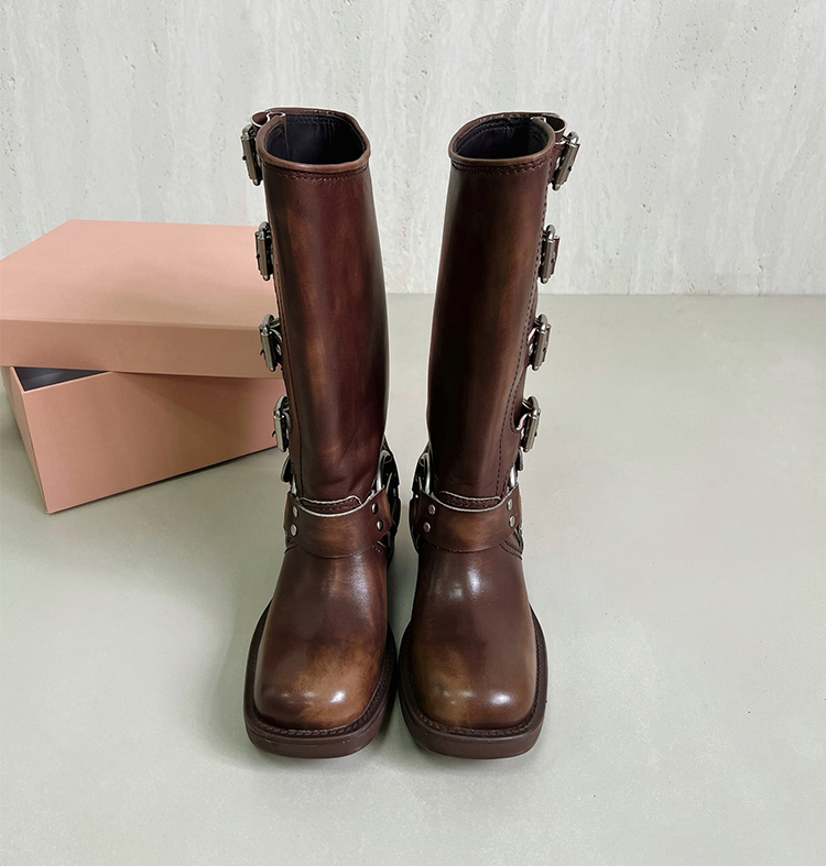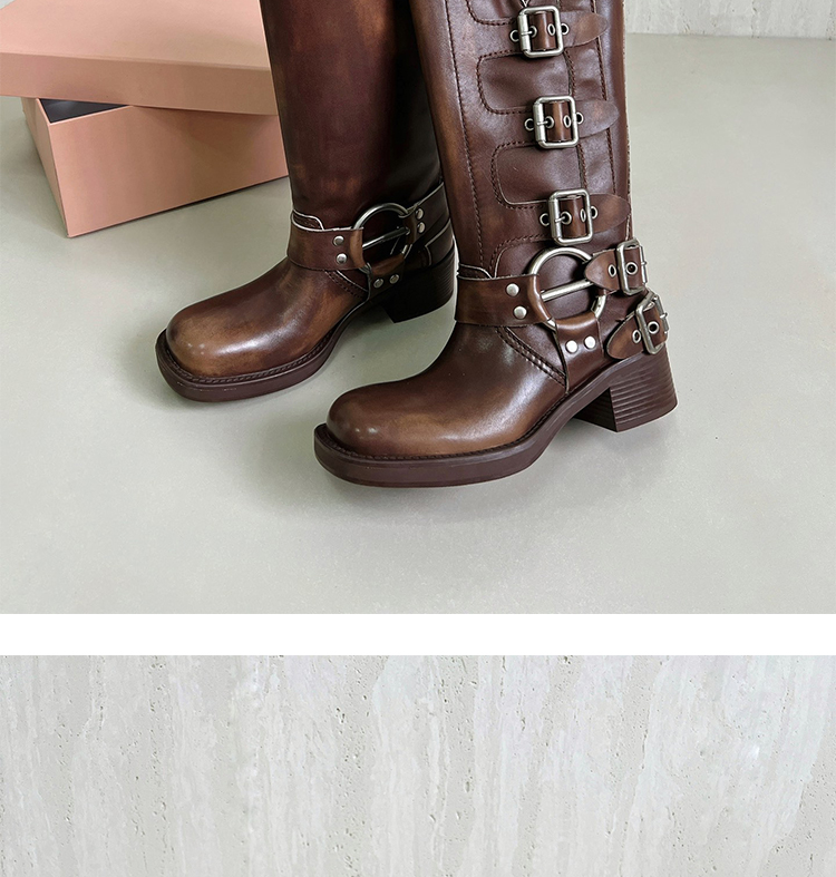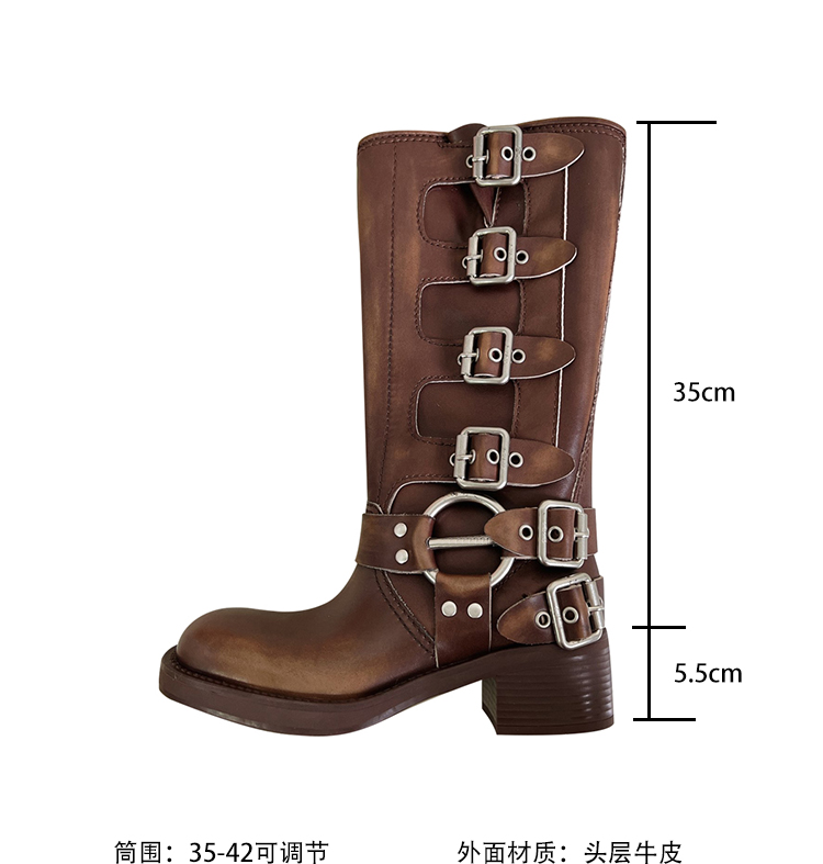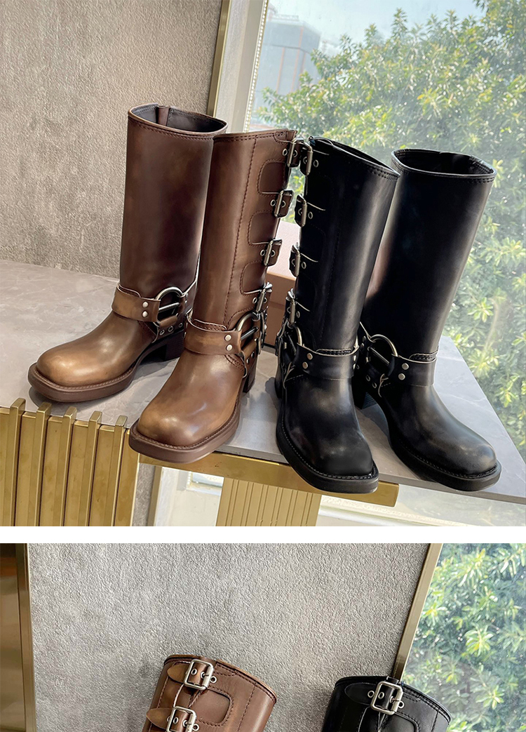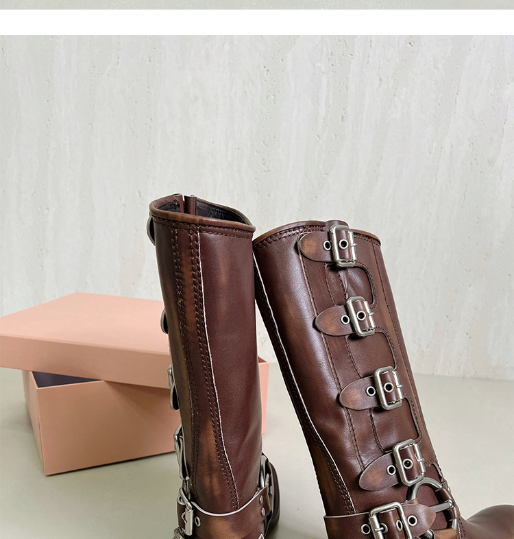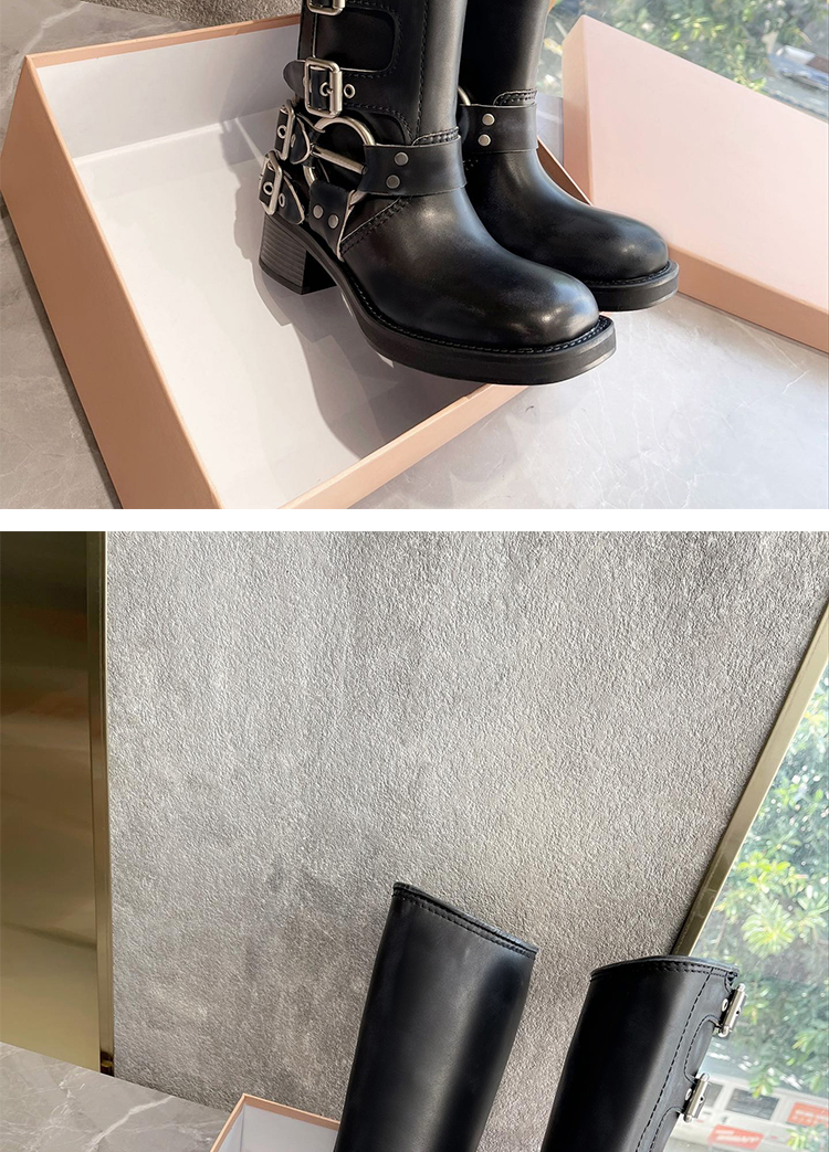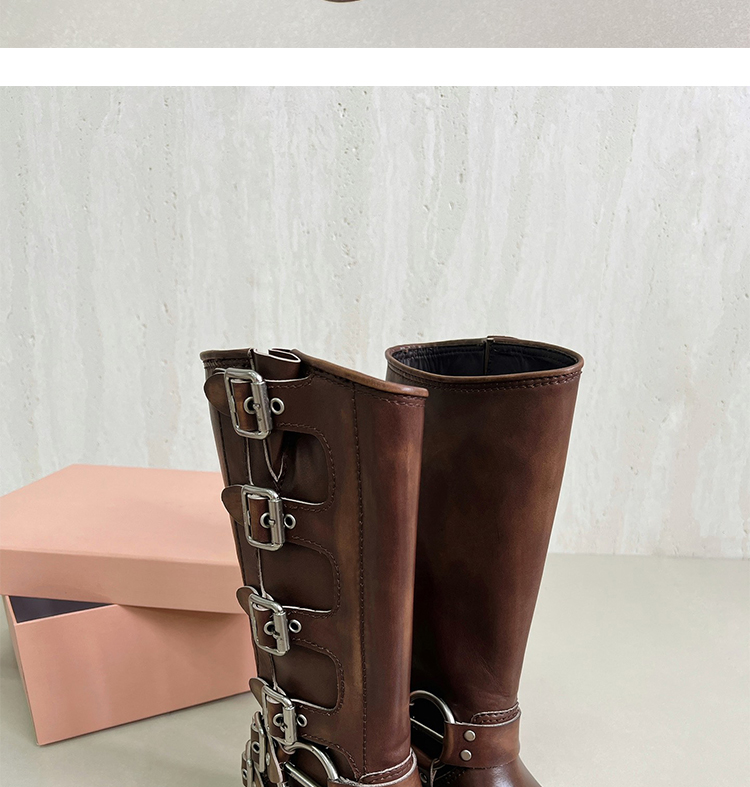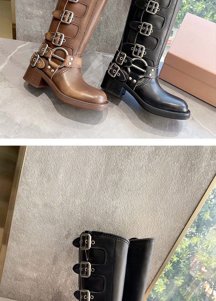 Miu * Catwalk 벨트 버클 두꺼운 굽 마틴 부츠 여성용 봄과 여름 정품 레트로 무릎 롱 부츠 웨스턴 부츠