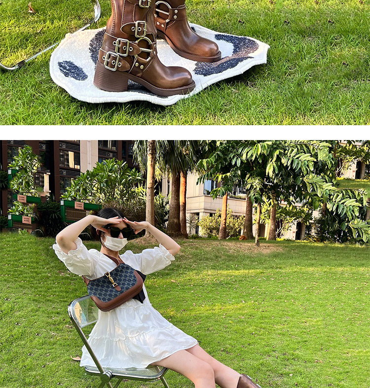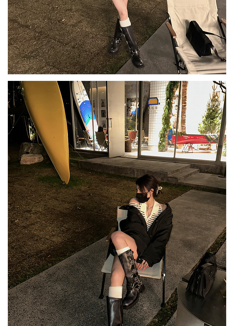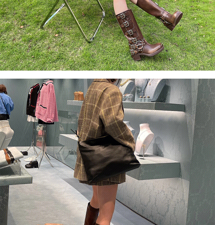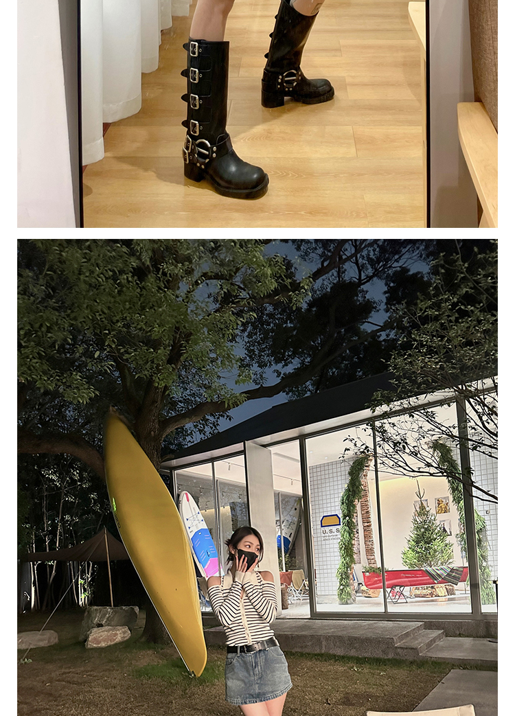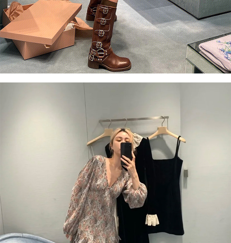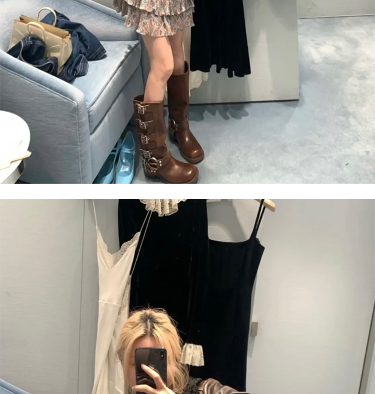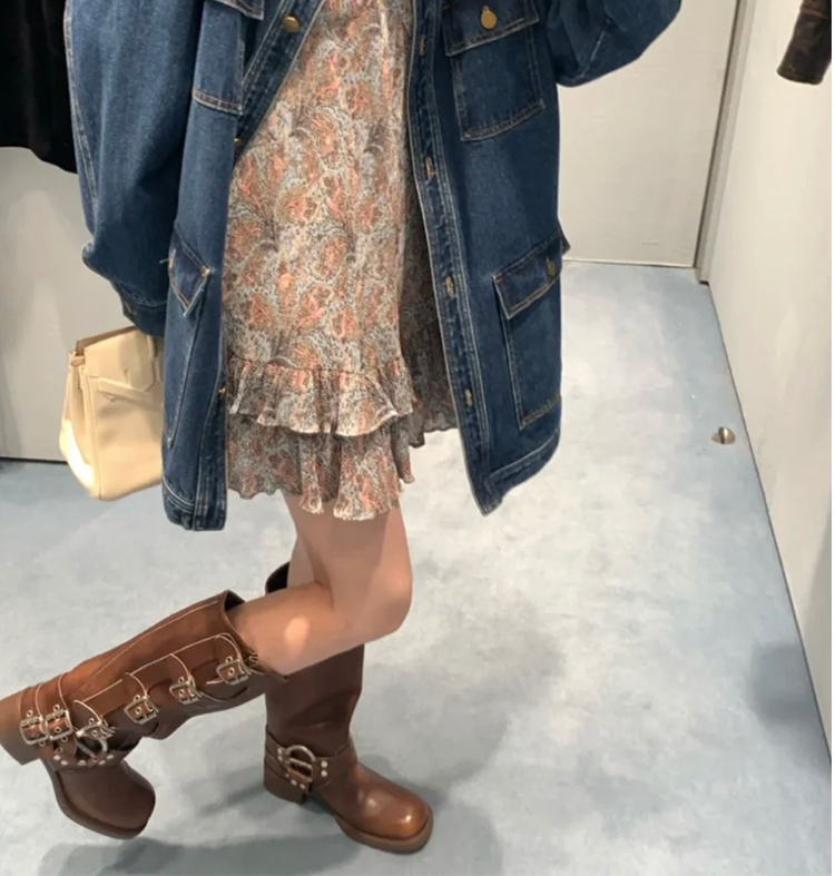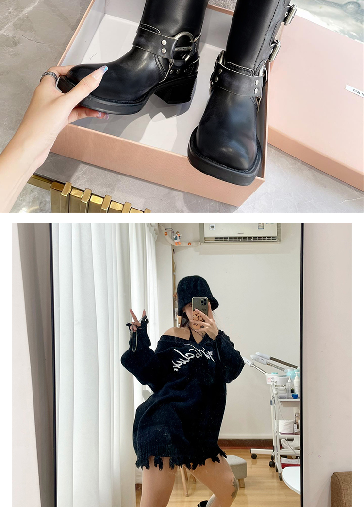 Miu * Catwalk 벨트 버클 두꺼운 굽 마틴 부츠 여성용 봄과 여름 정품 레트로 무릎 롱 부츠 웨스턴 부츠스토어 가기