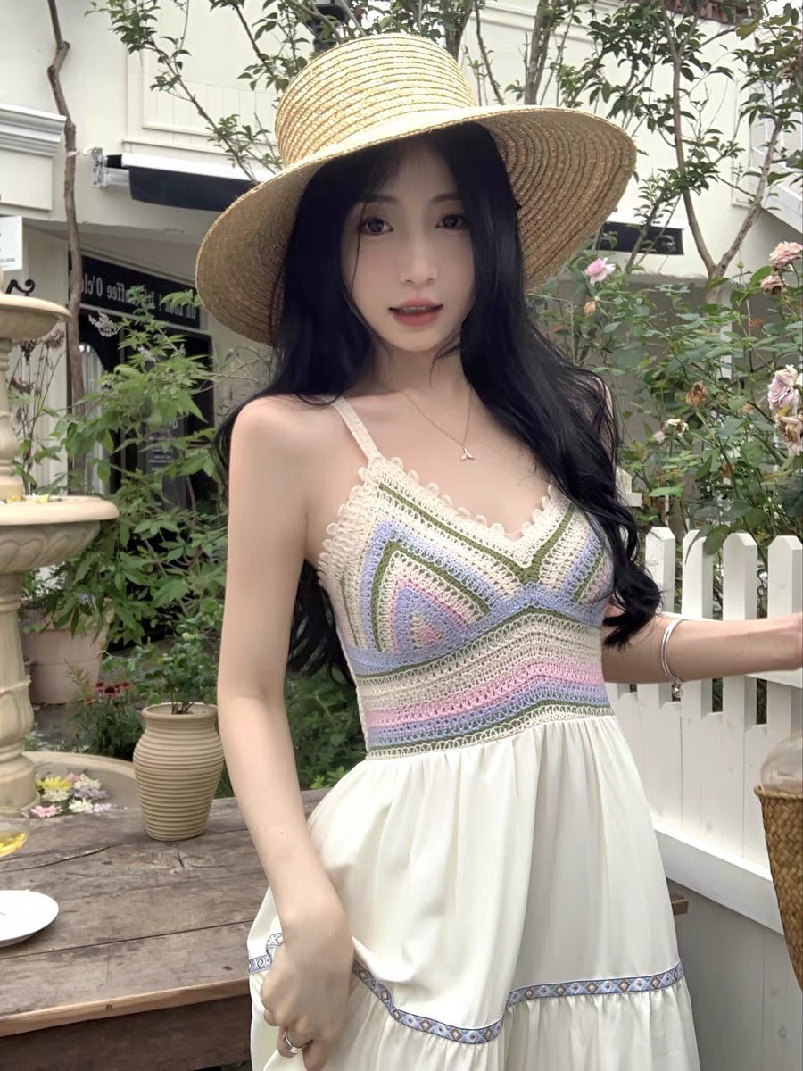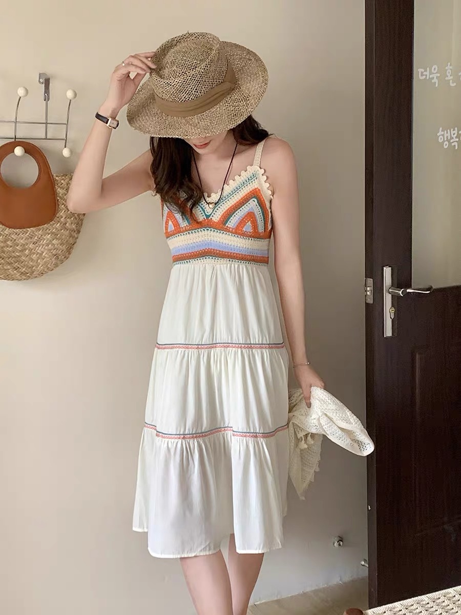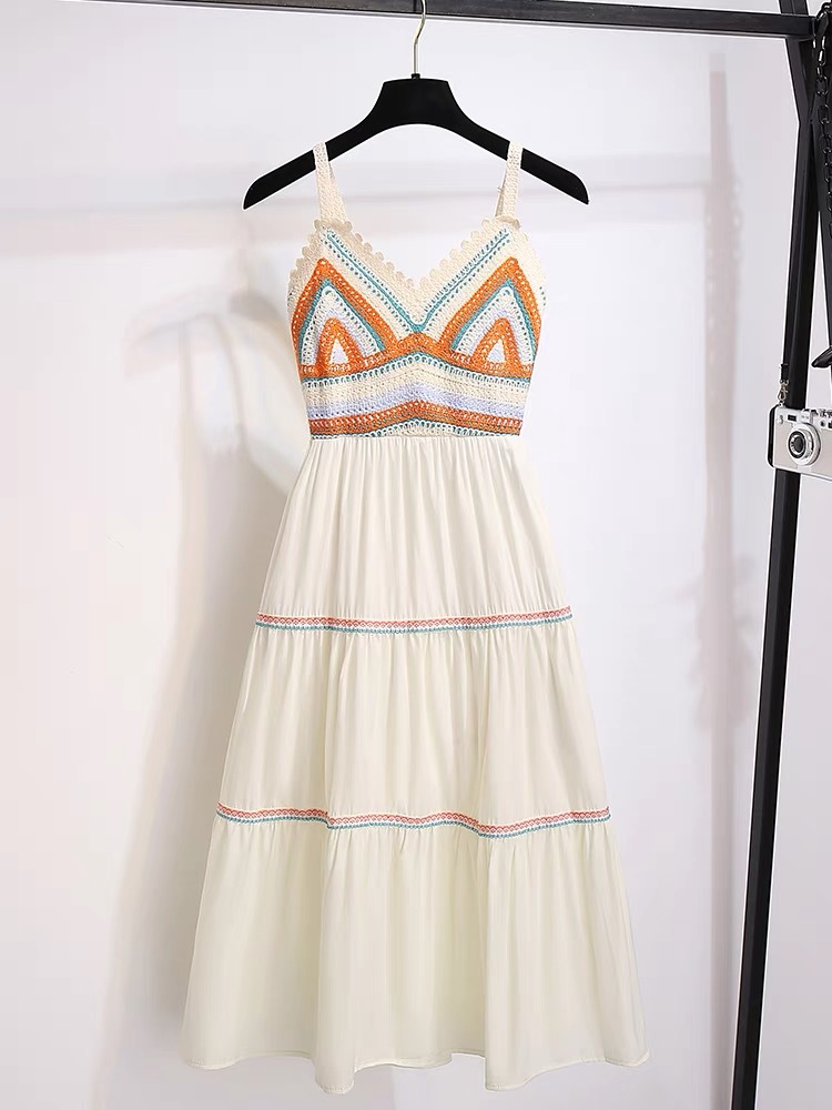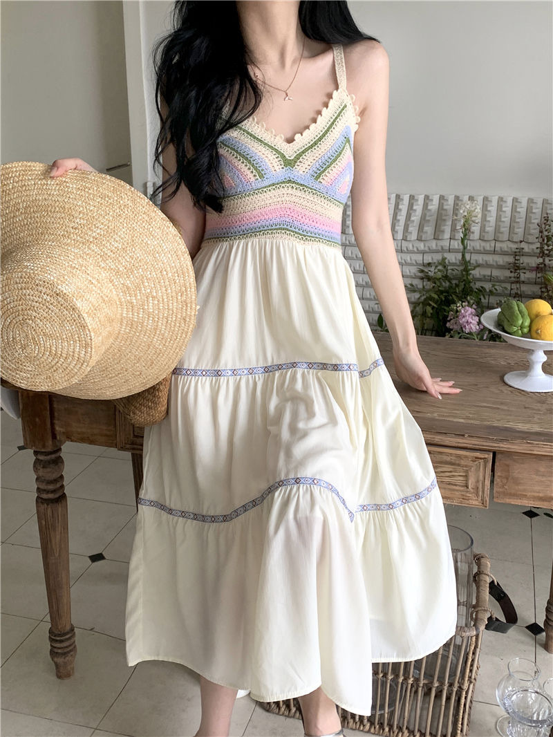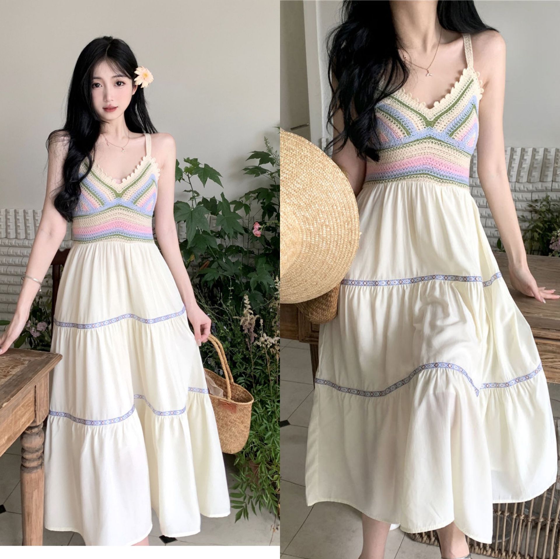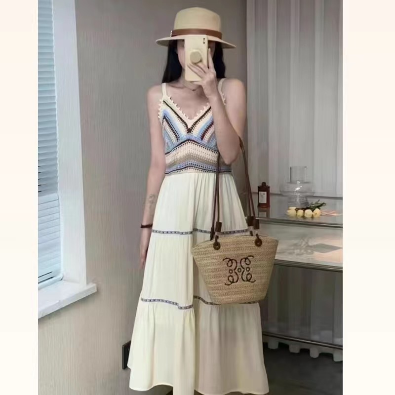여성을위한 민족 스타일 크로 셰 뜨개질 스플 라이스 서스펜더 드레스 여름 2025 새로운 v 넥 허리 a 라인 캐주얼 휴가 롱 드레스