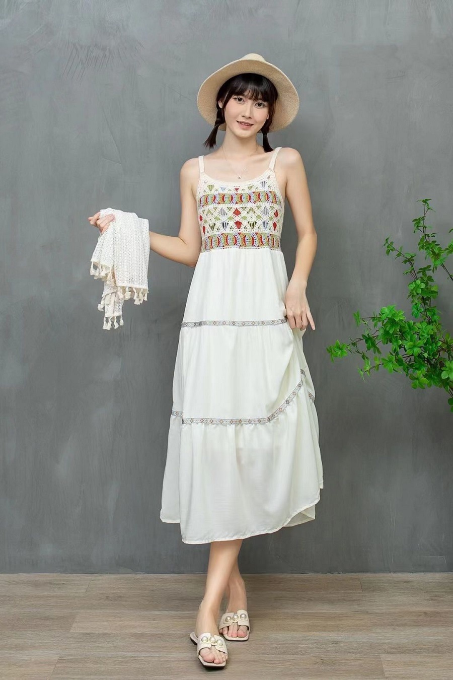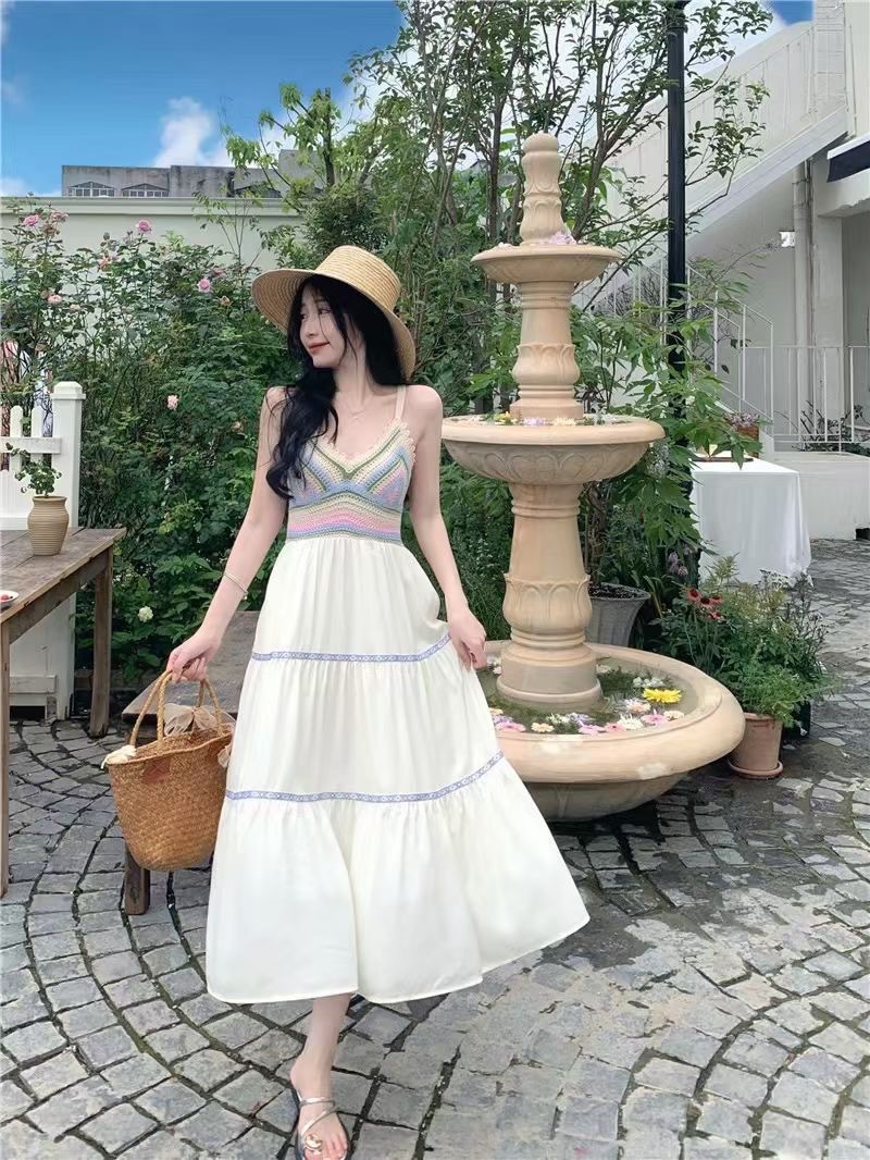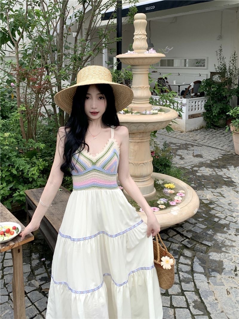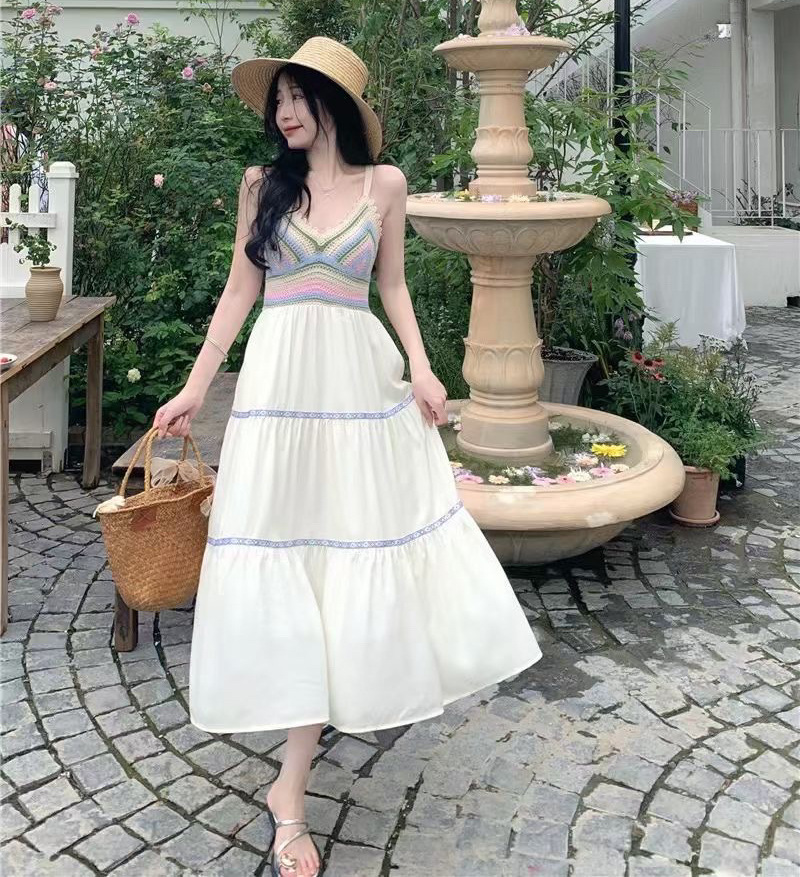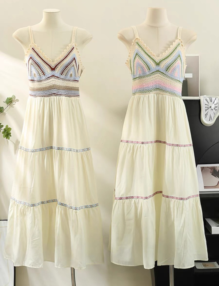여성을위한 민족 스타일 크로 셰 뜨개질 스플 라이스 서스펜더 드레스 여름 2025 새로운 v 넥 허리 a 라인 캐주얼 휴가 롱 드레스