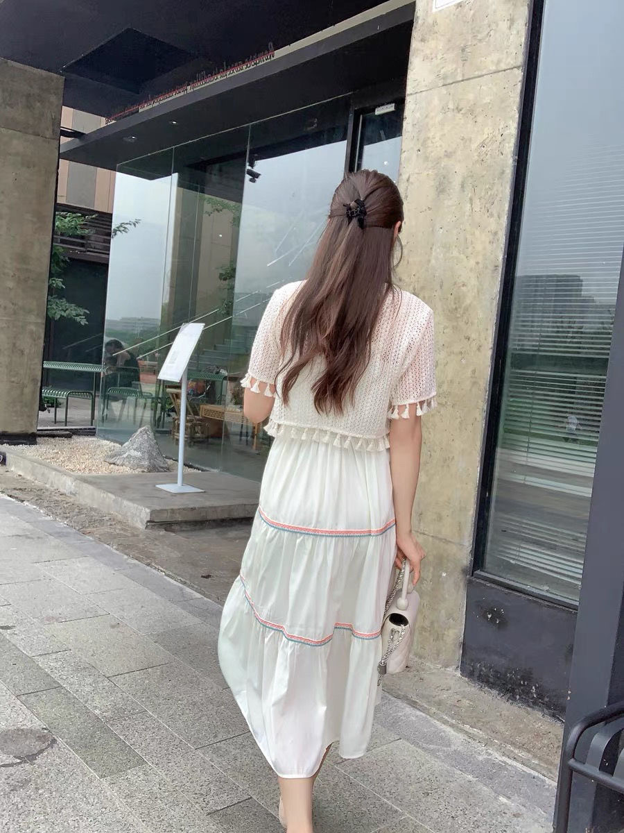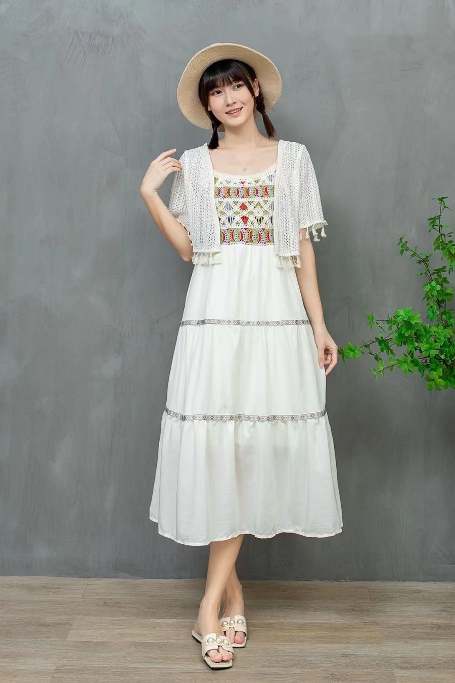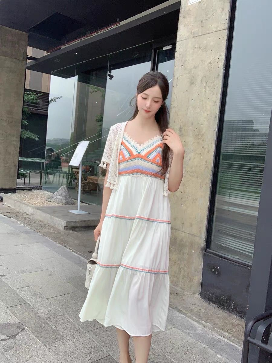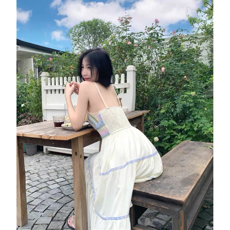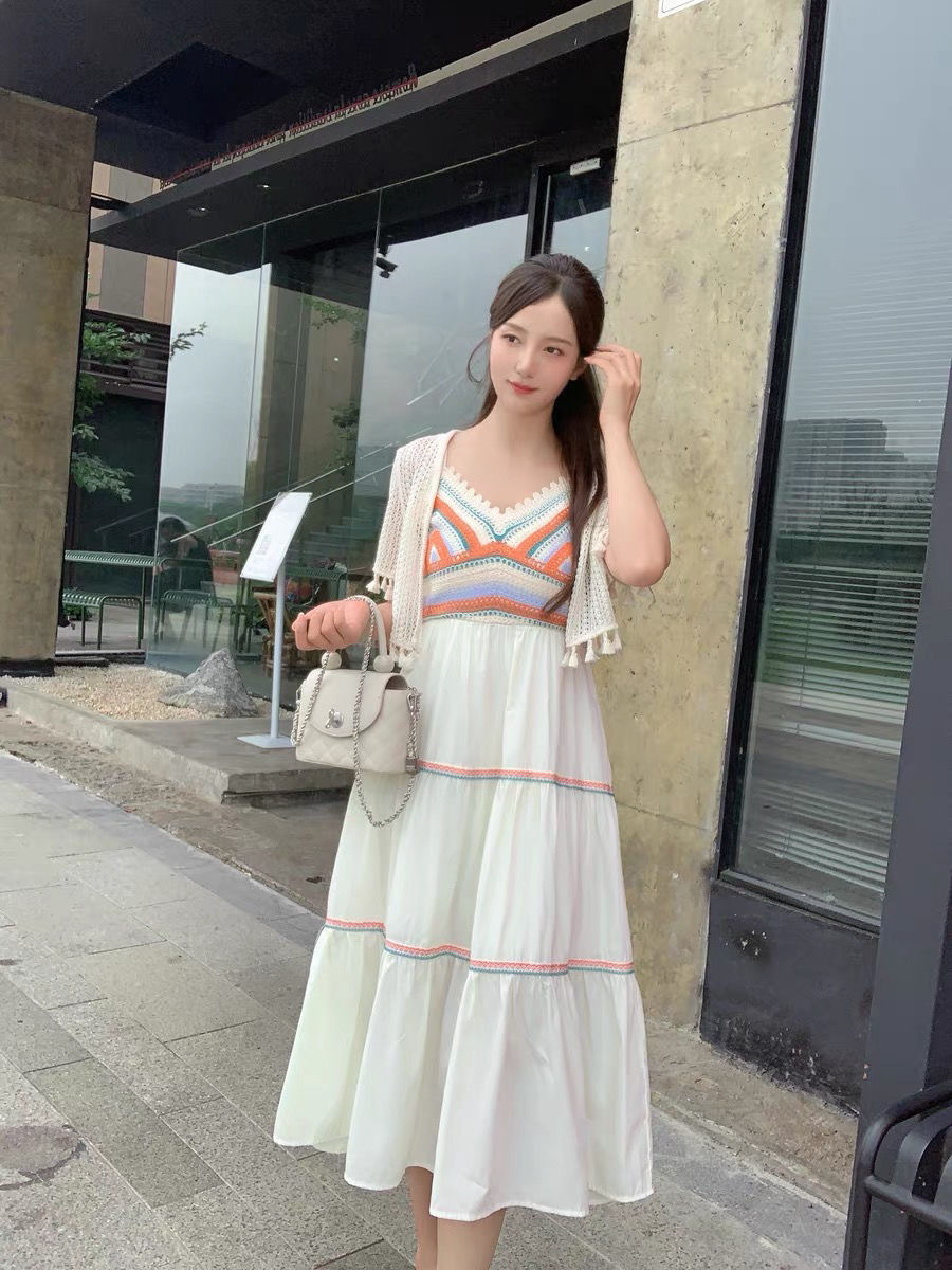 여성을위한 민족 스타일 크로 셰 뜨개질 스플 라이스 서스펜더 드레스 여름 2025 새로운 v 넥 허리 a 라인 캐주얼 휴가 롱 드레스