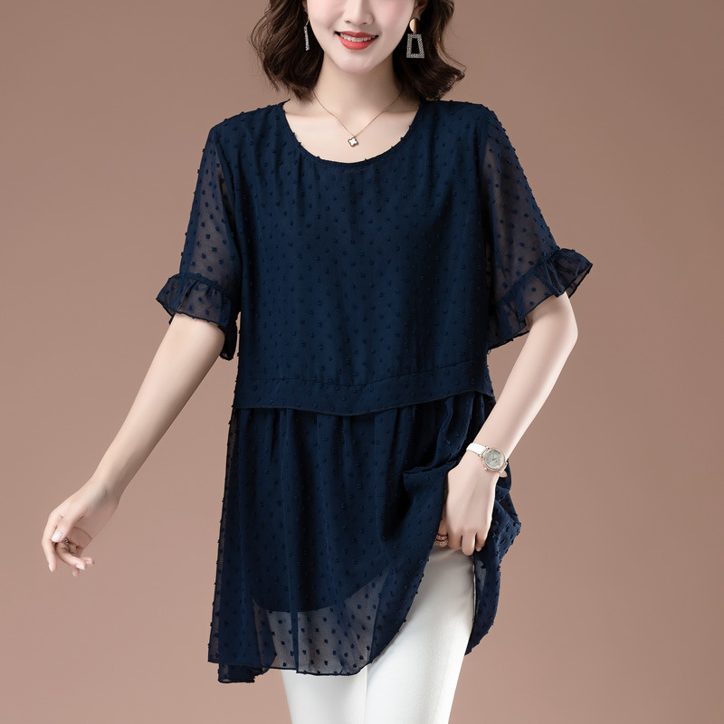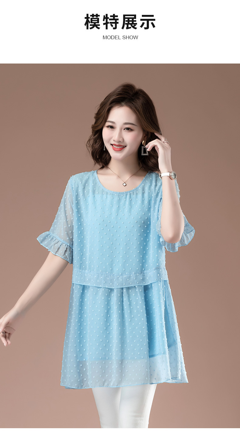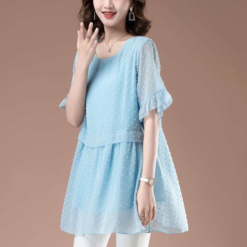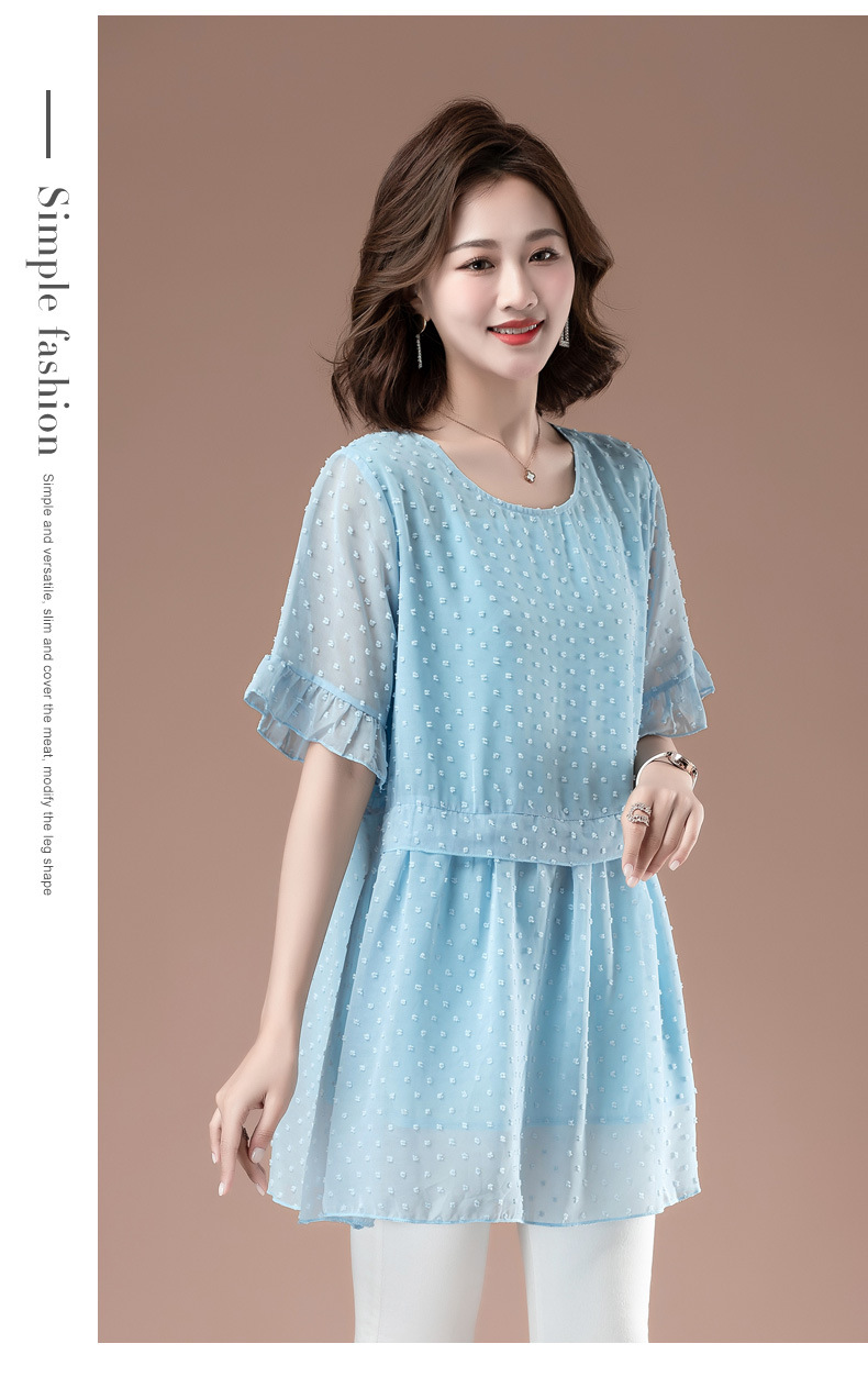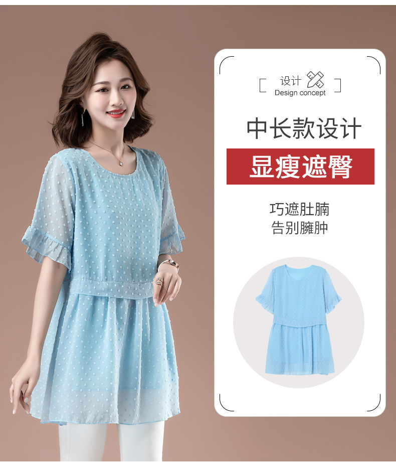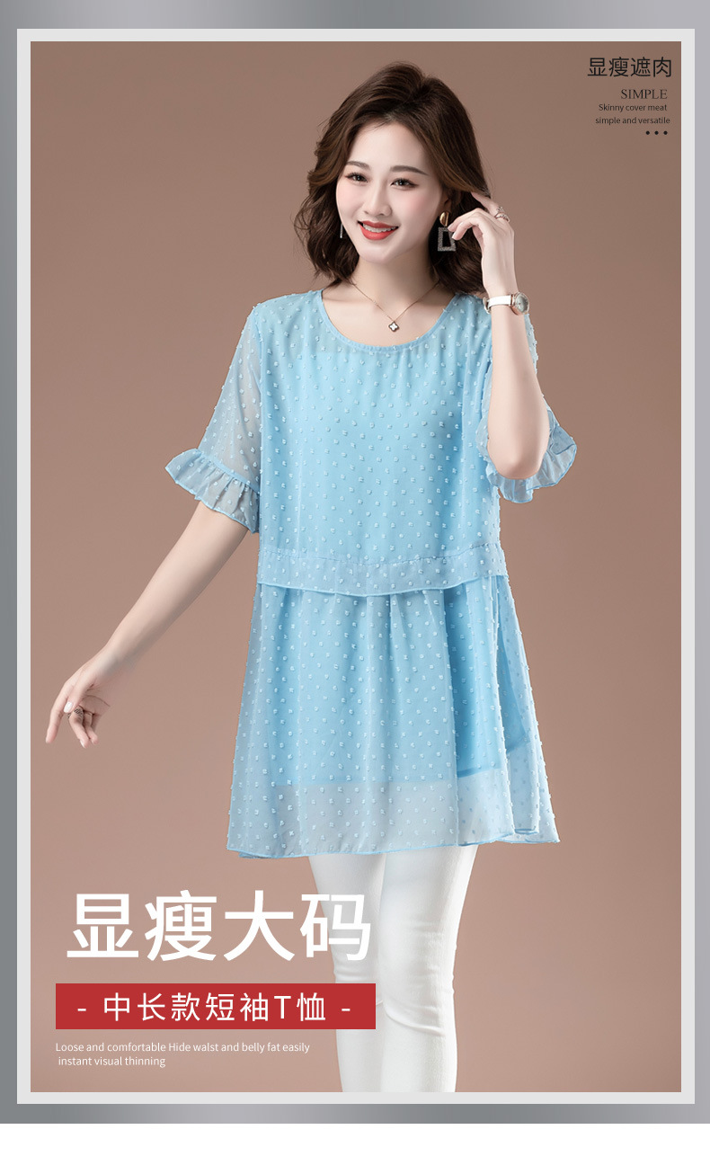 중년 어머니의 여름 반팔 쉬폰 셔츠 여성용 200kg 느슨한 대형 티셔츠 긴 외국 스타일 코트