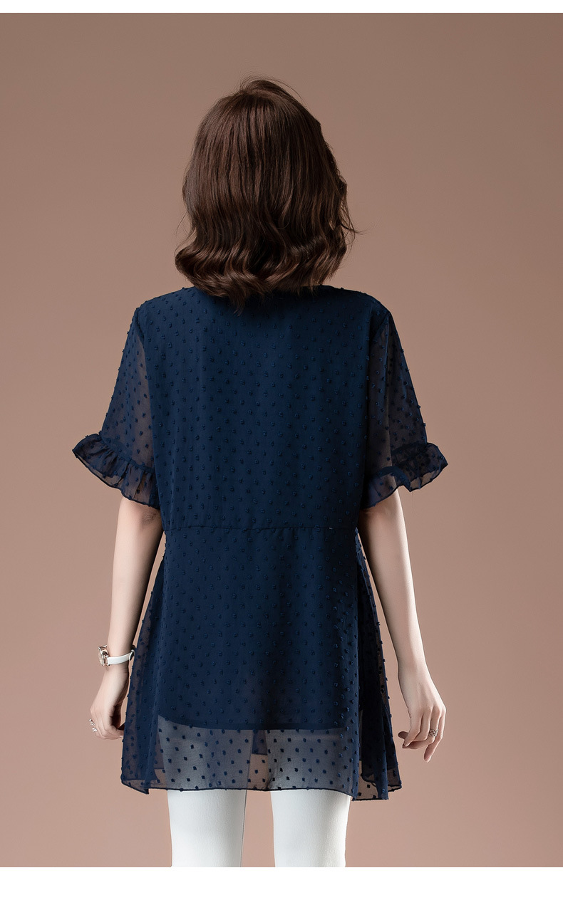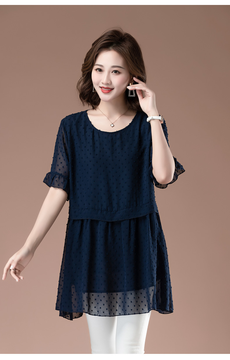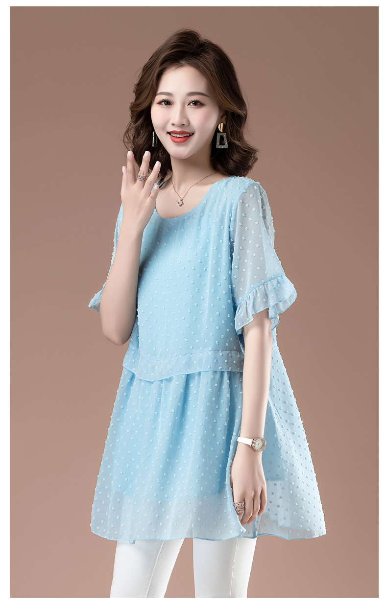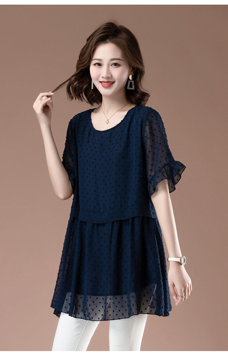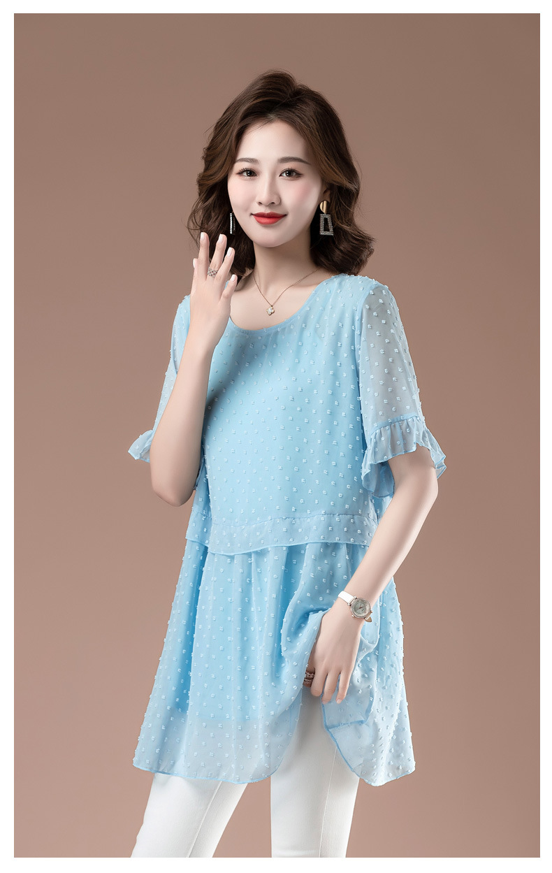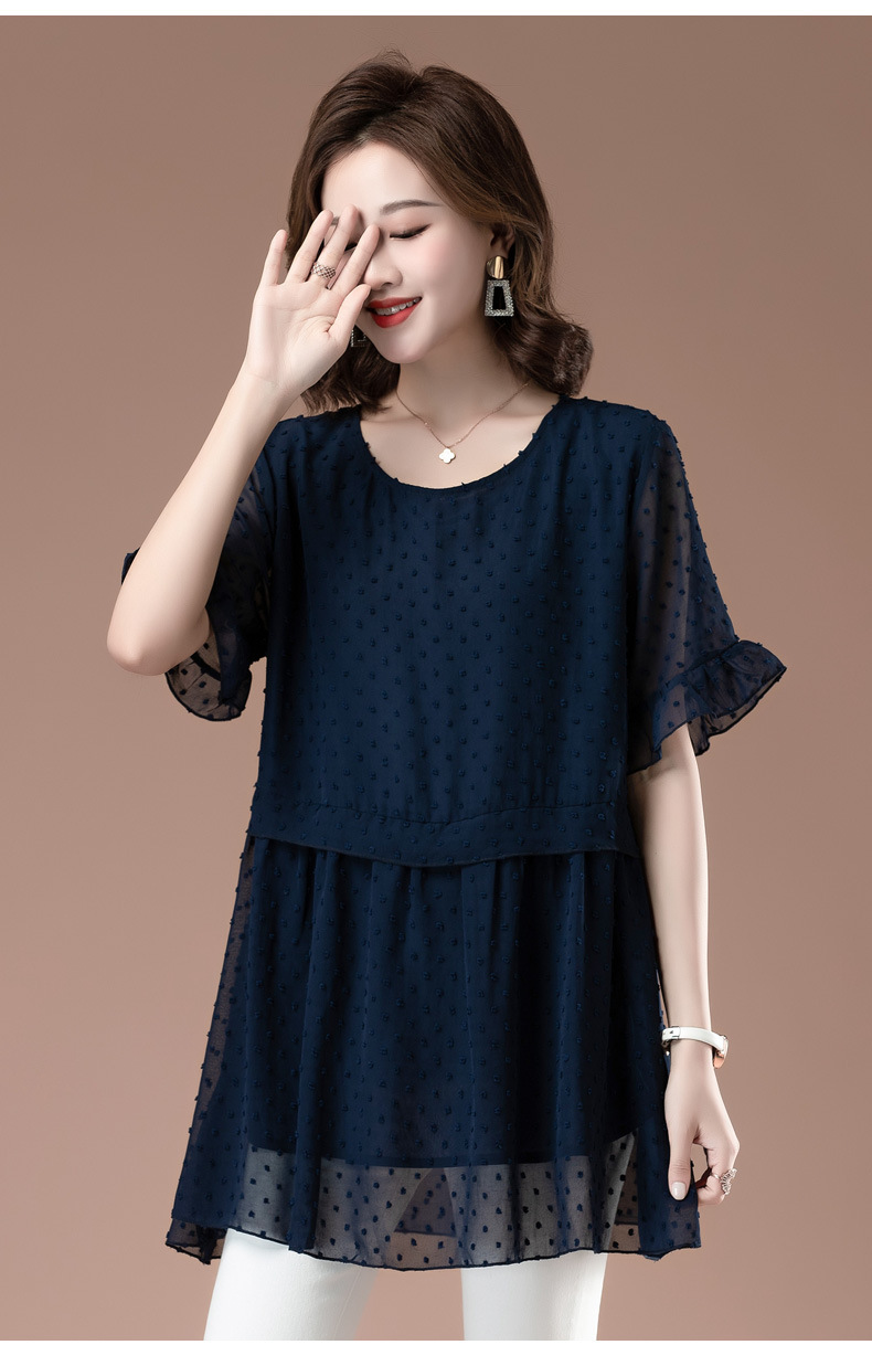 중년 어머니의 여름 반팔 쉬폰 셔츠 여성용 200kg 느슨한 대형 티셔츠 긴 외국 스타일 코트