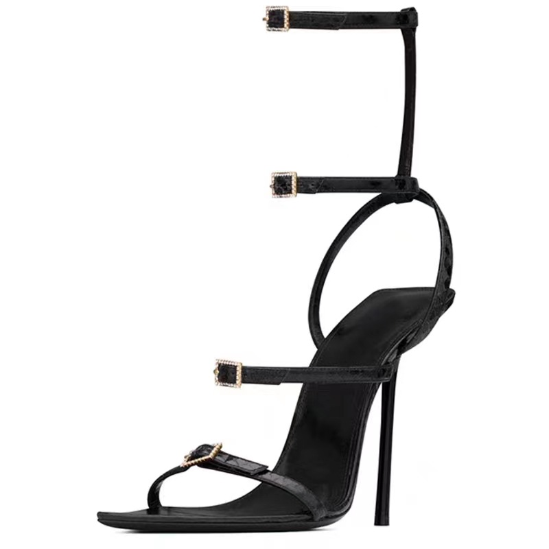 도매 공장 다이렉트 하이힐 여성용 오픈 발가락 모조 다이아몬드 버클 여성 신발 고급 힐 로마 스타일 블랙 샌들