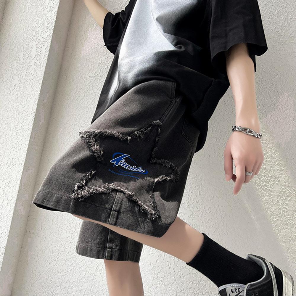 캐주얼 데님 반바지 남자의 여름 얇은 유행 브랜드 에 하이 스트리트 아메리칸 스타일 씻어 디자인 감각 틈새 하프 바지스토어 가기