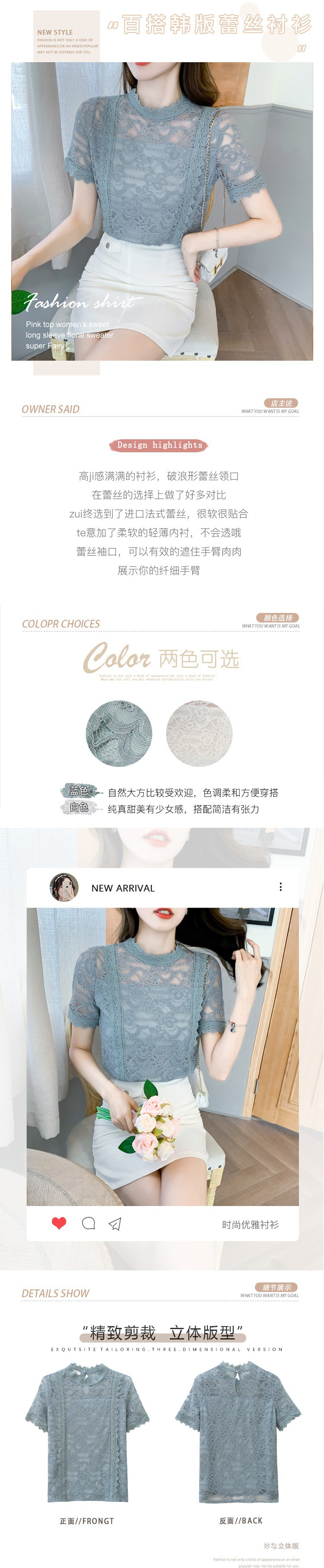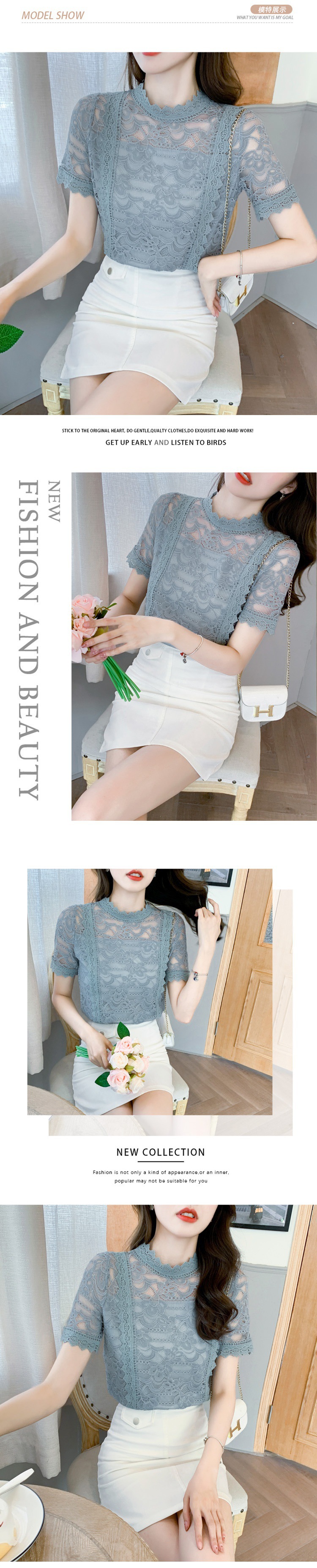 리얼 샷 2023 여름 새로운 패션 우아한 무스 빈 레이스 셔츠 여성의 세련된 쉬폰 탑