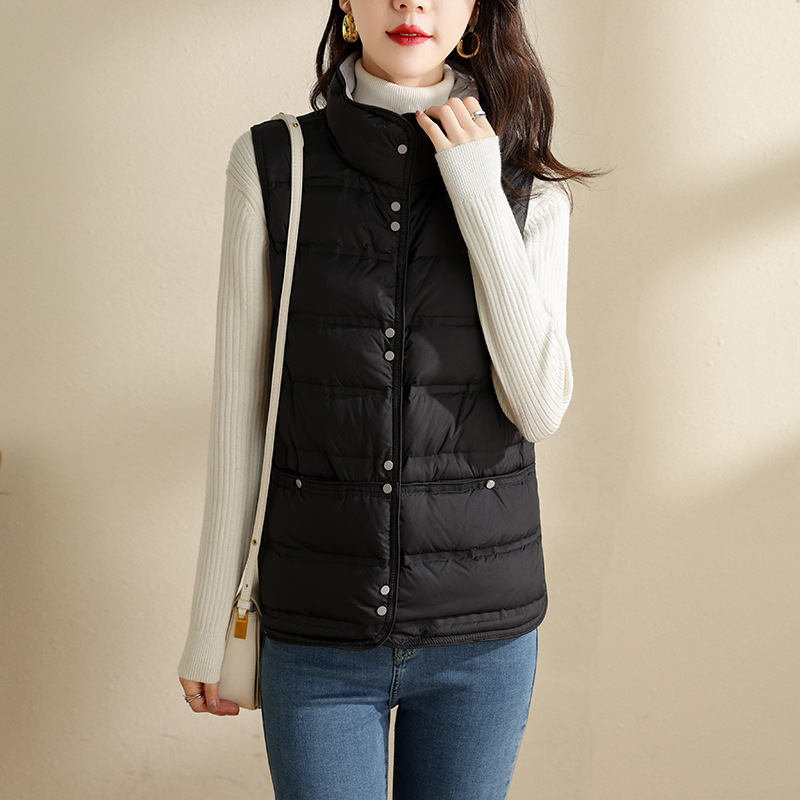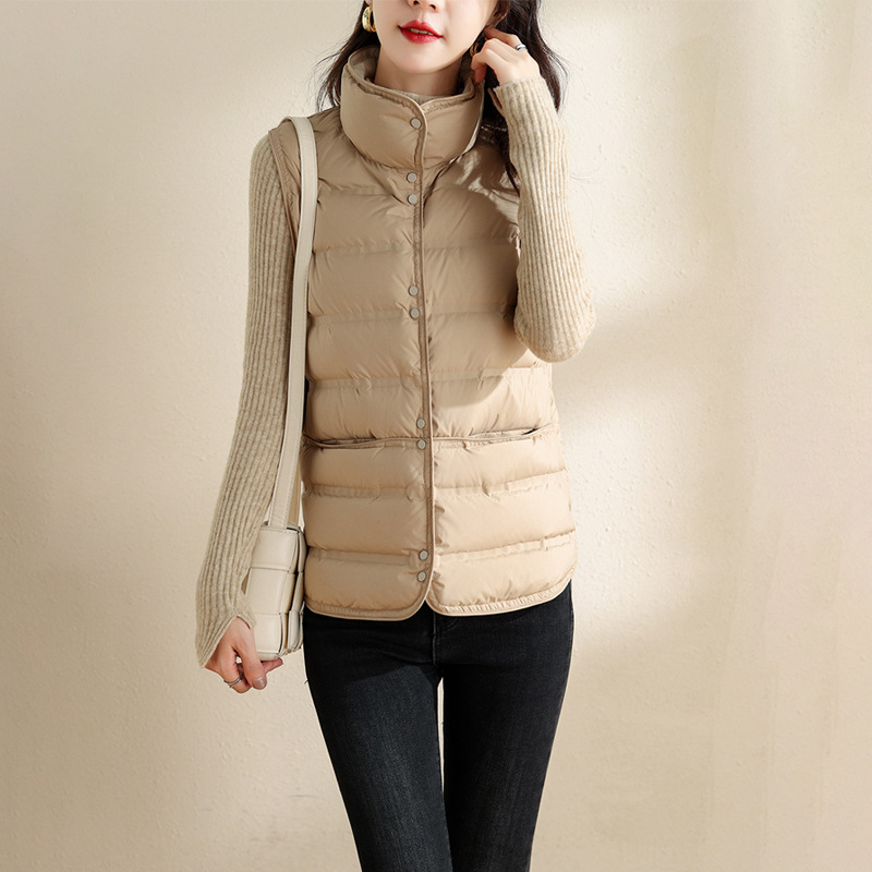 2023 가을과 겨울 슬림핏 유행 경량 다운 조끼 여성용 짧은 서 칼라 조끼 허리띠 아우터 재킷