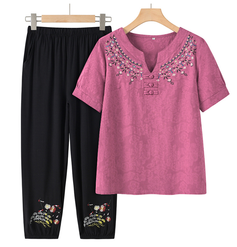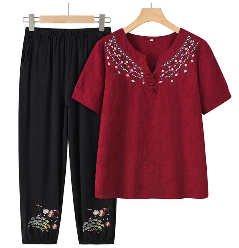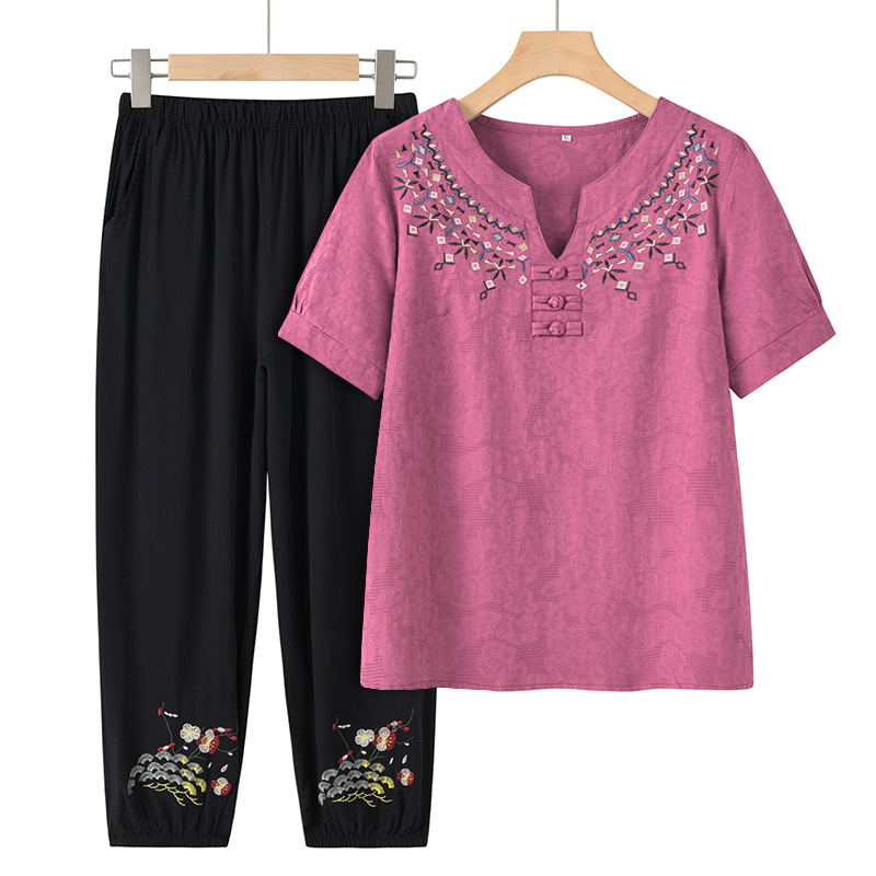 어머니 옷 세트 여름 면 린넨 반팔 티셔츠 느슨한 중년 및 노인 여성 노인 할머니 여름 옷