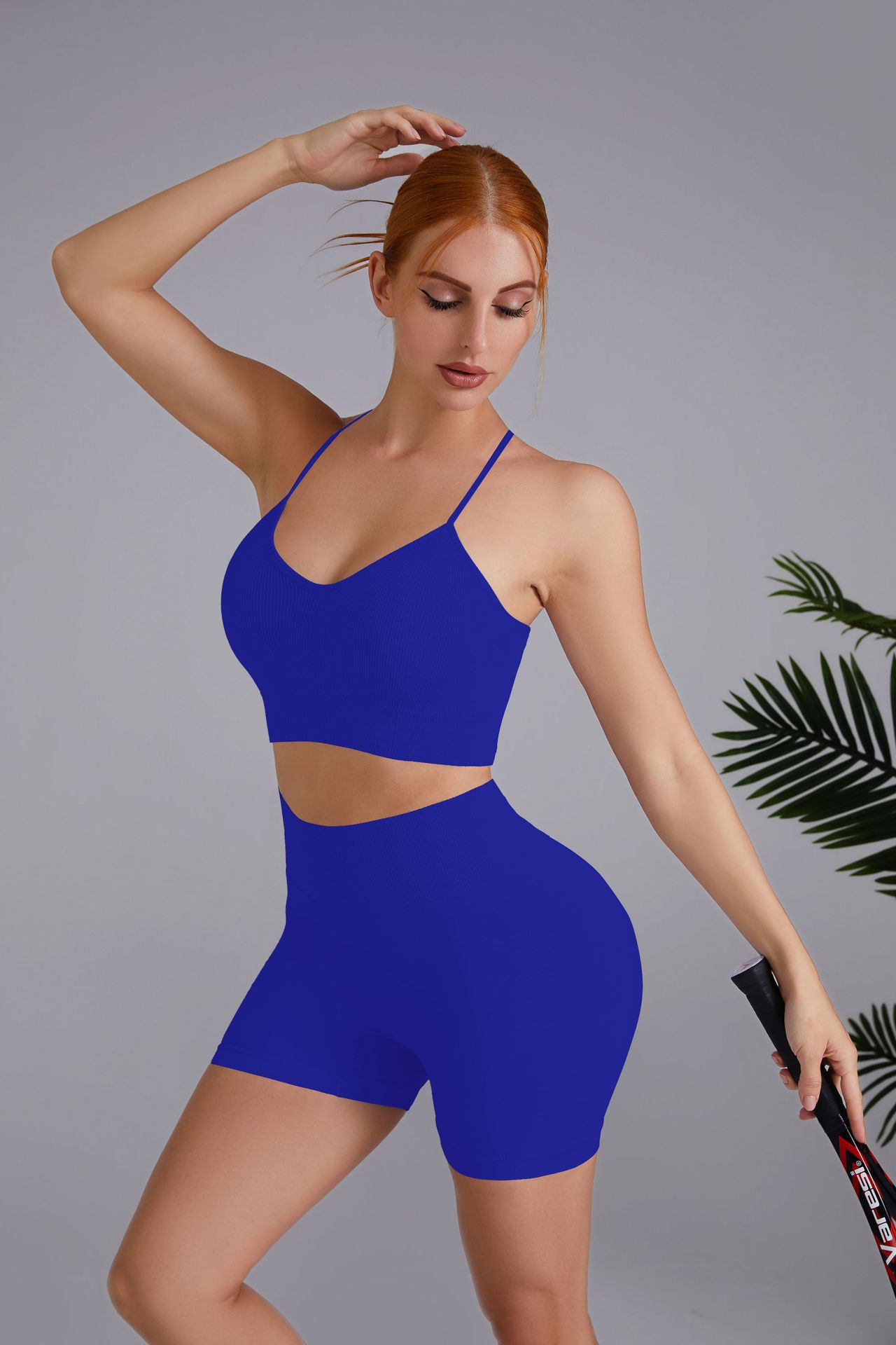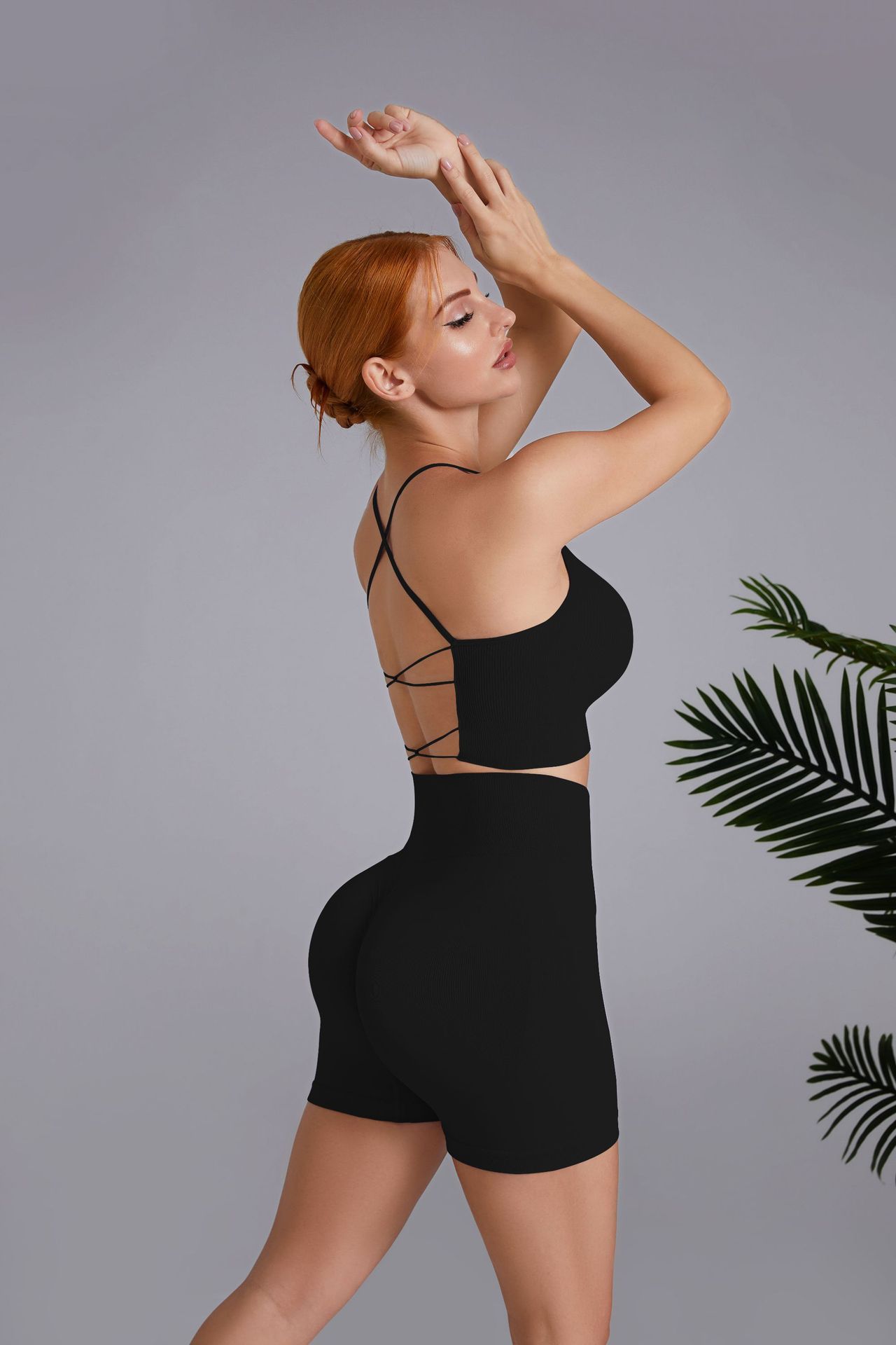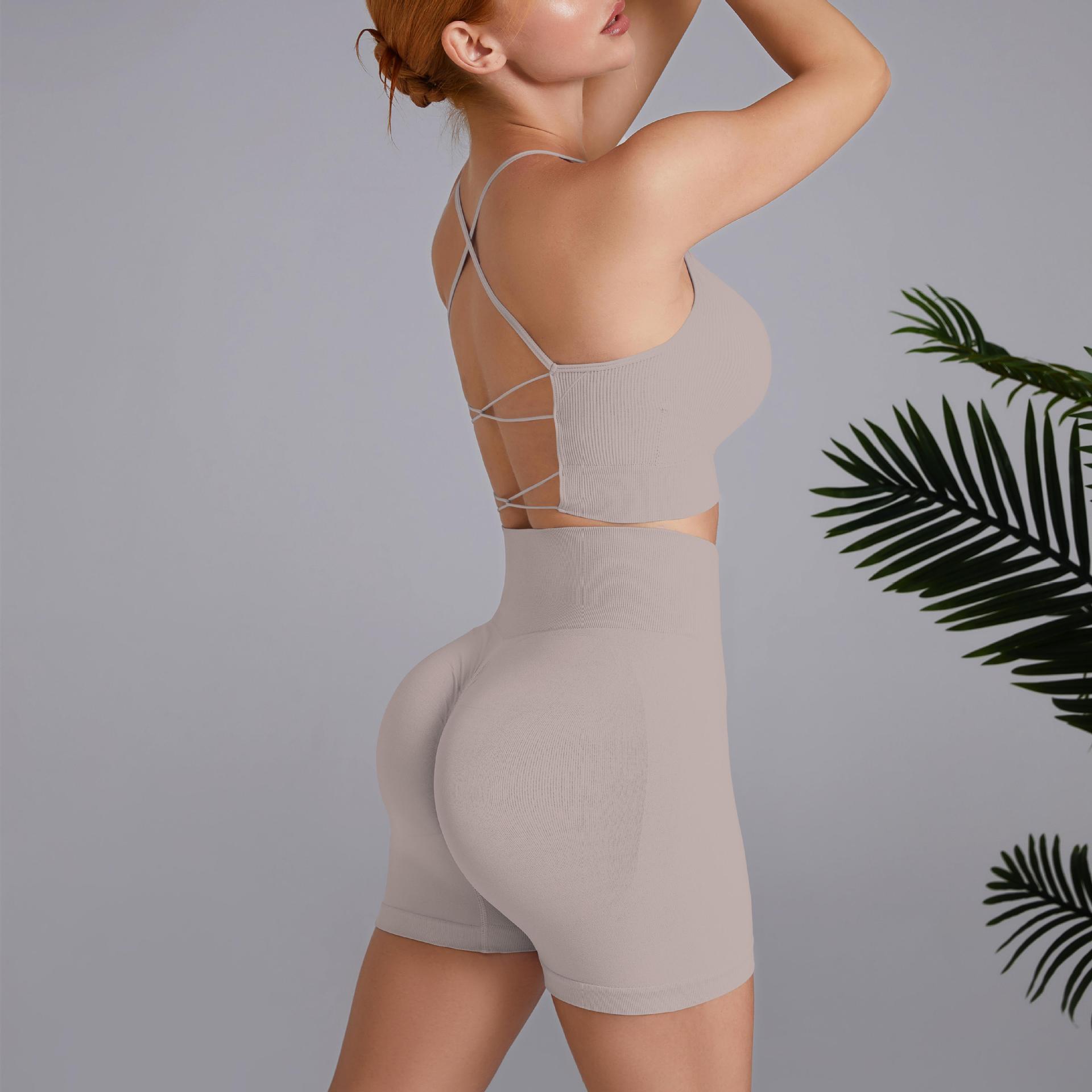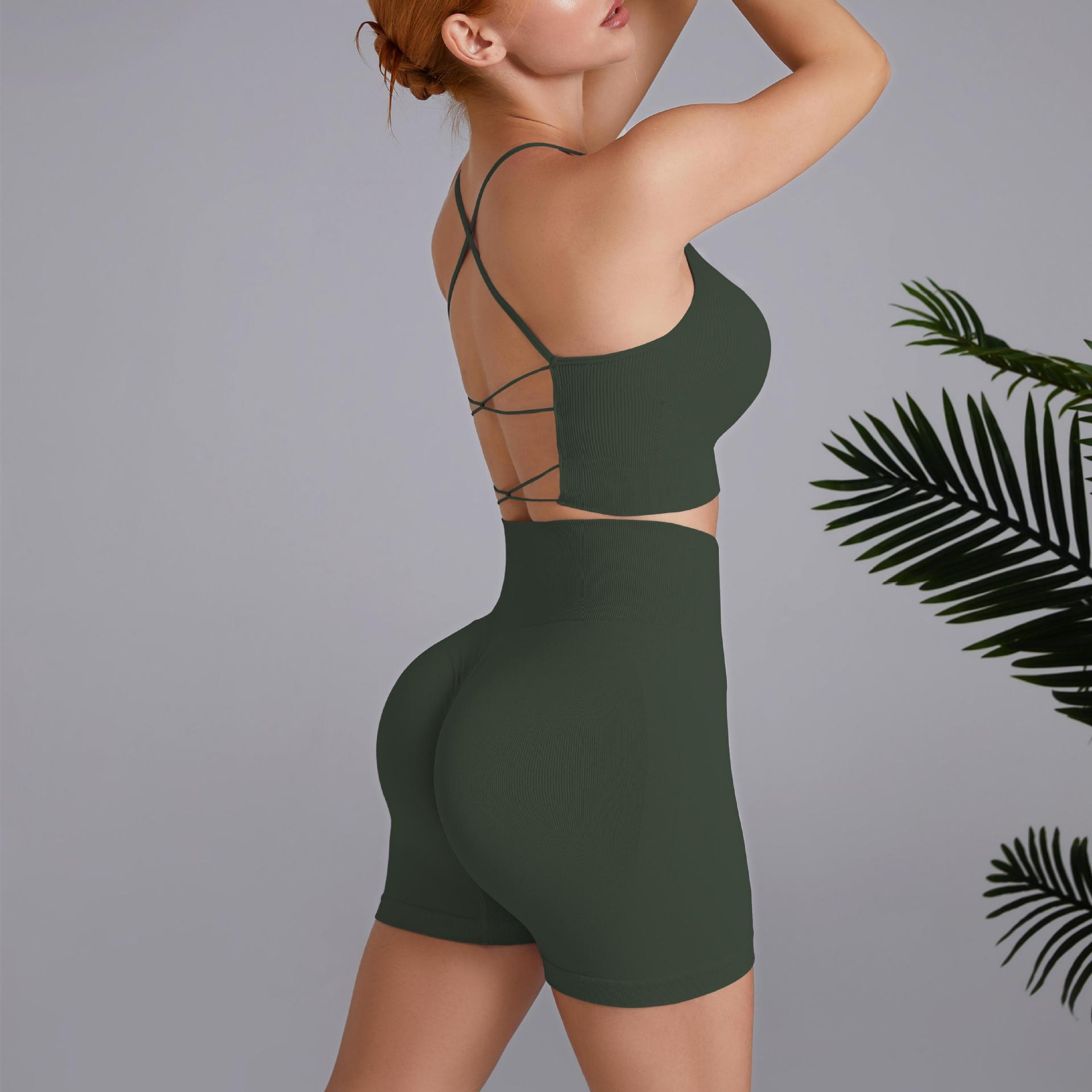 새로운 크로스 뷰티 백 여자의 여름 요가 조끼 세트 얇은 어깨 스트랩 스포츠 브라 하이 웨이스트 배꼽 꽉 요가 반바지