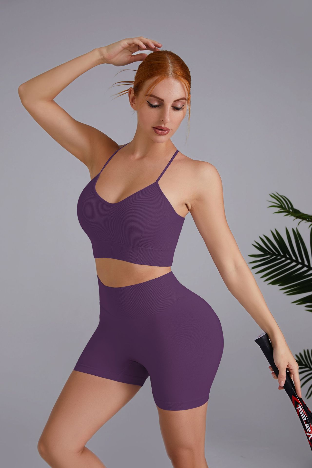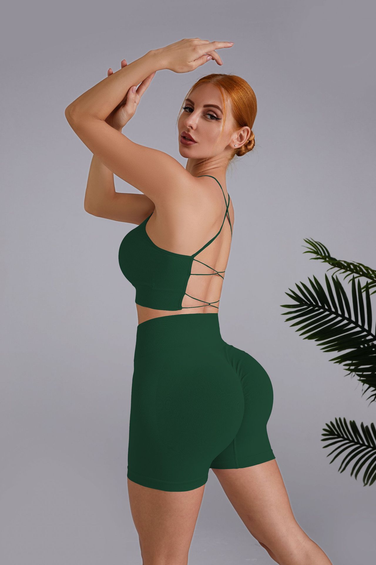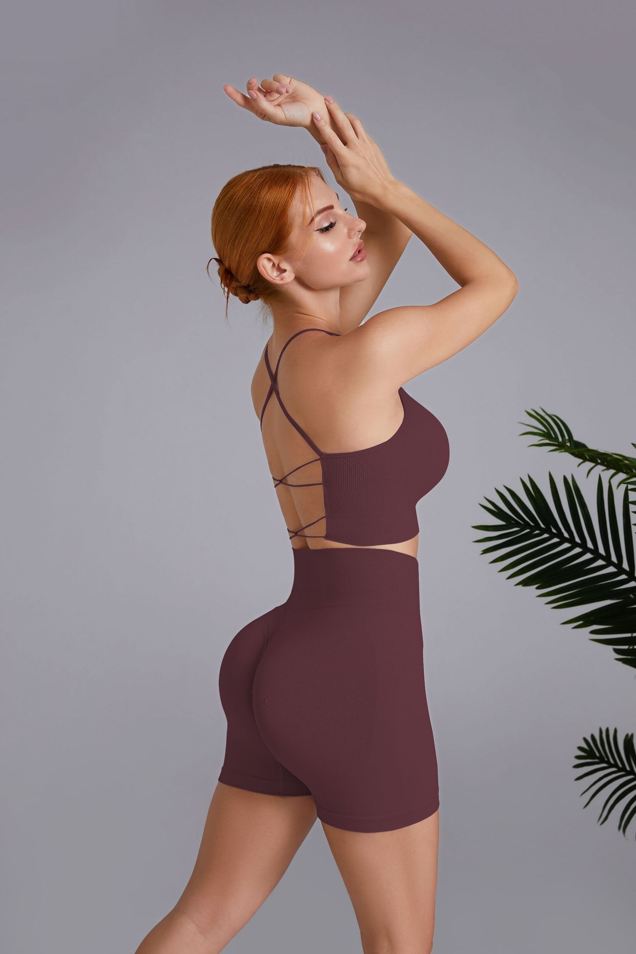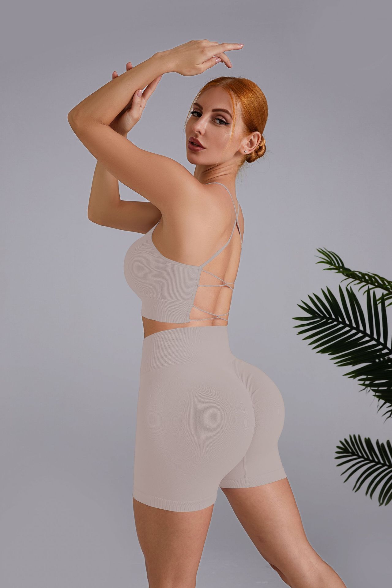 새로운 크로스 뷰티 백 여자의 여름 요가 조끼 세트 얇은 어깨 스트랩 스포츠 브라 하이 웨이스트 배꼽 꽉 요가 반바지