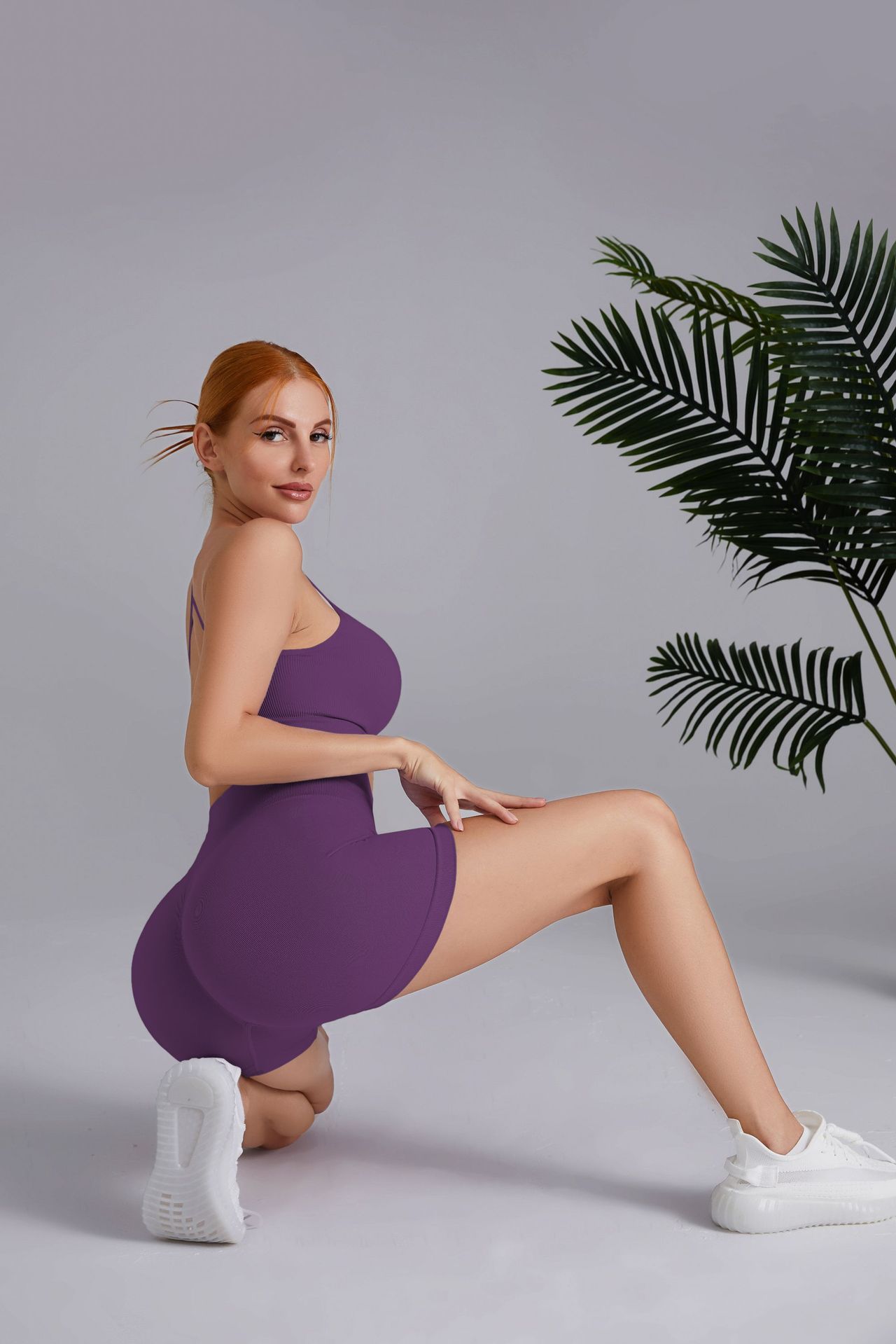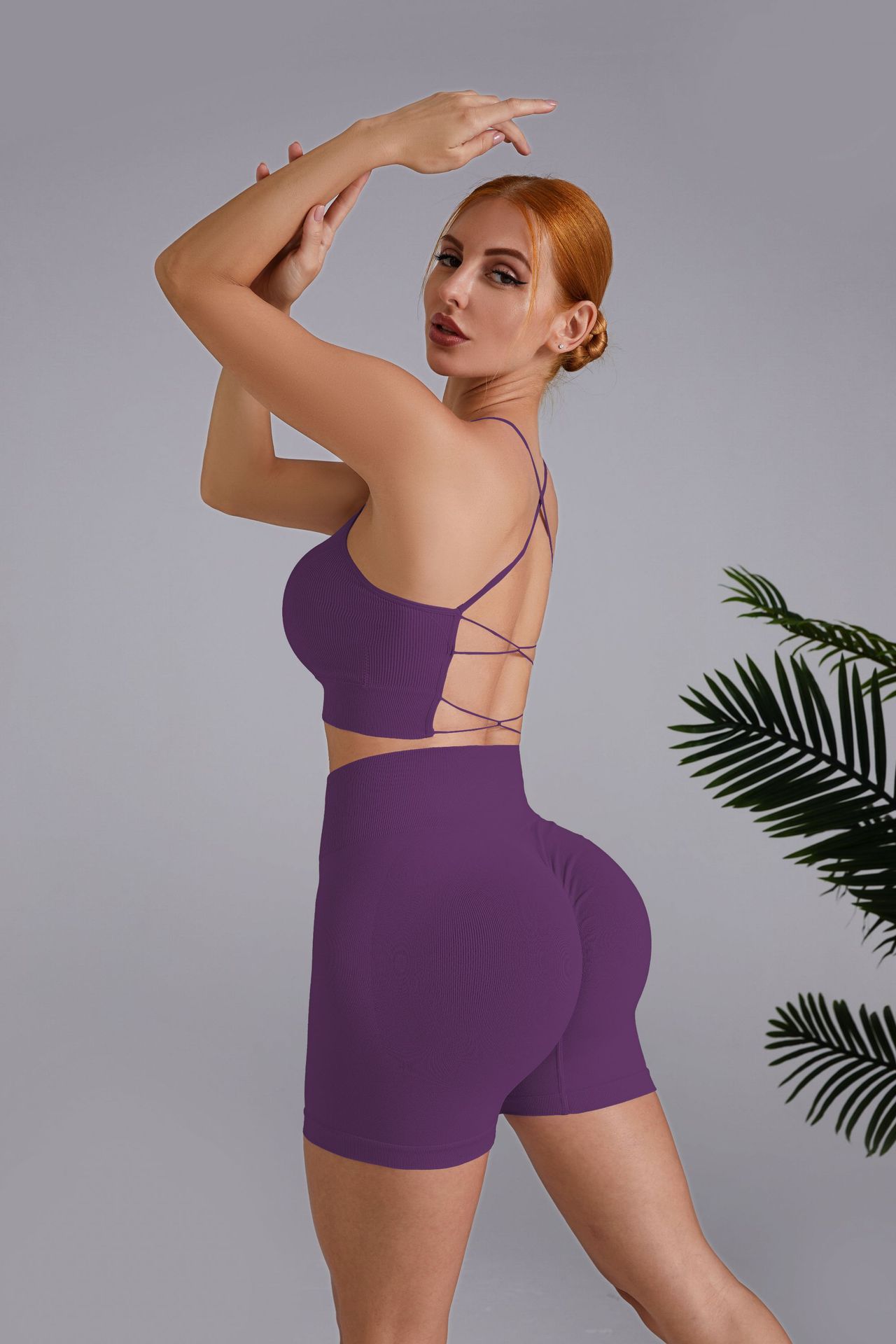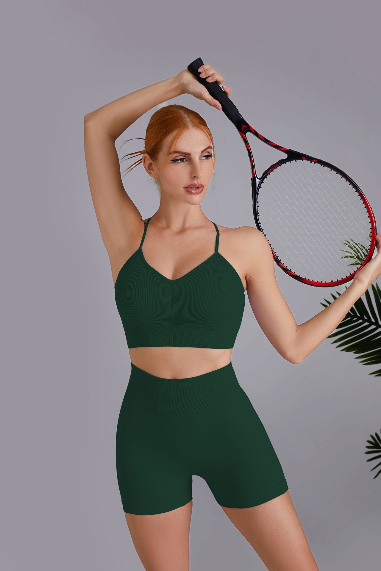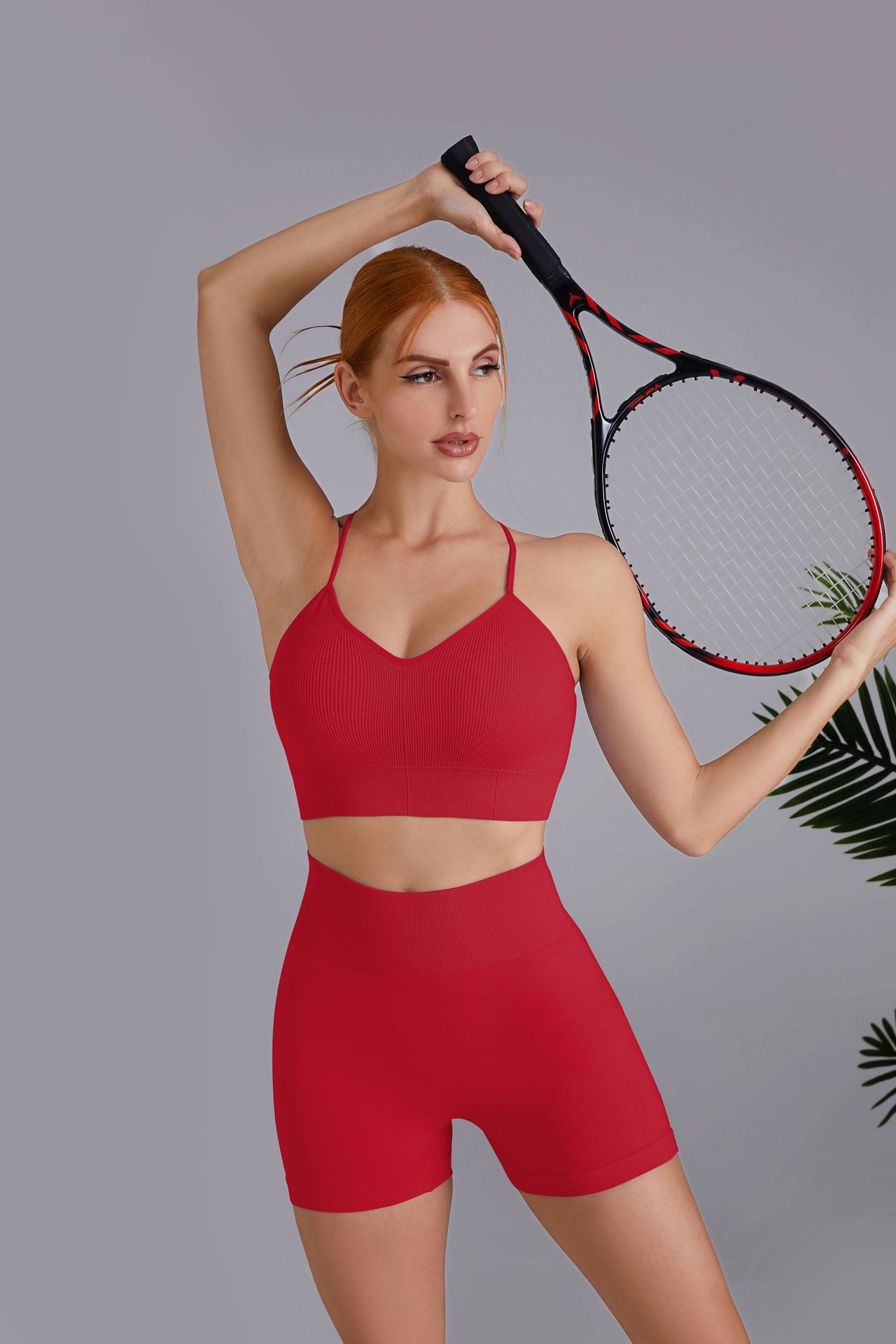 새로운 크로스 뷰티 백 여자의 여름 요가 조끼 세트 얇은 어깨 스트랩 스포츠 브라 하이 웨이스트 배꼽 꽉 요가 반바지