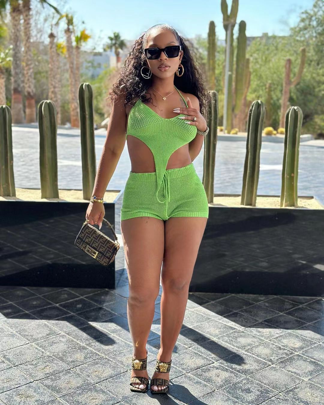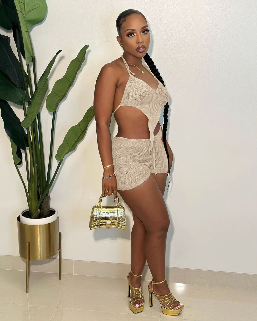 2023 국경 간 유럽과 미국 아마존 여성 의류 새로운 패션 섹시한 홀터 스트랩 조끼 반바지 니트 세트