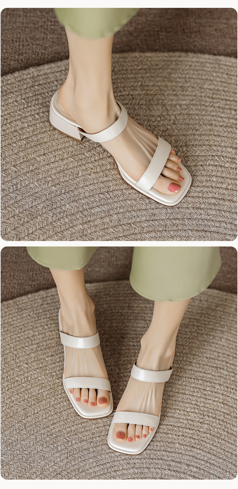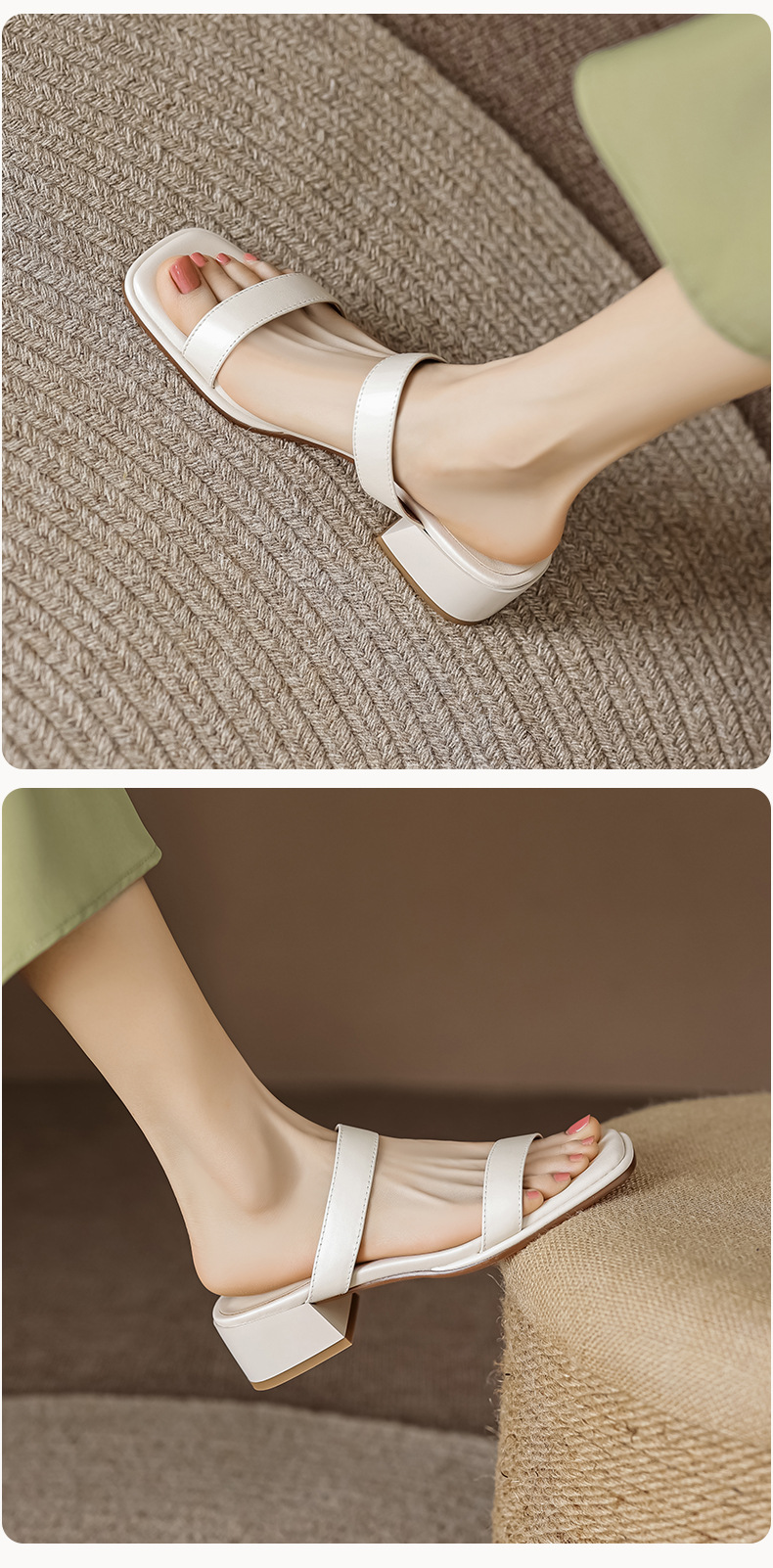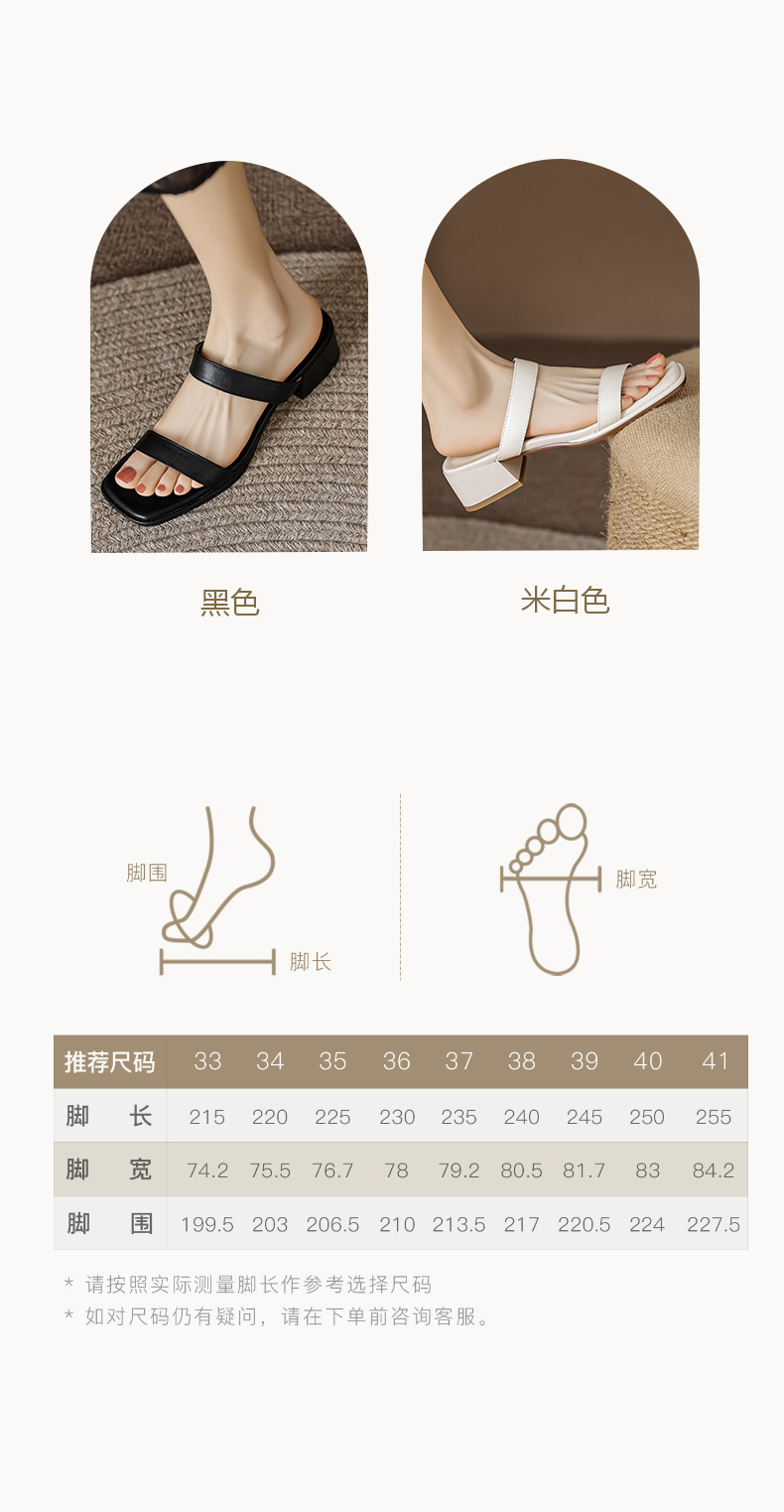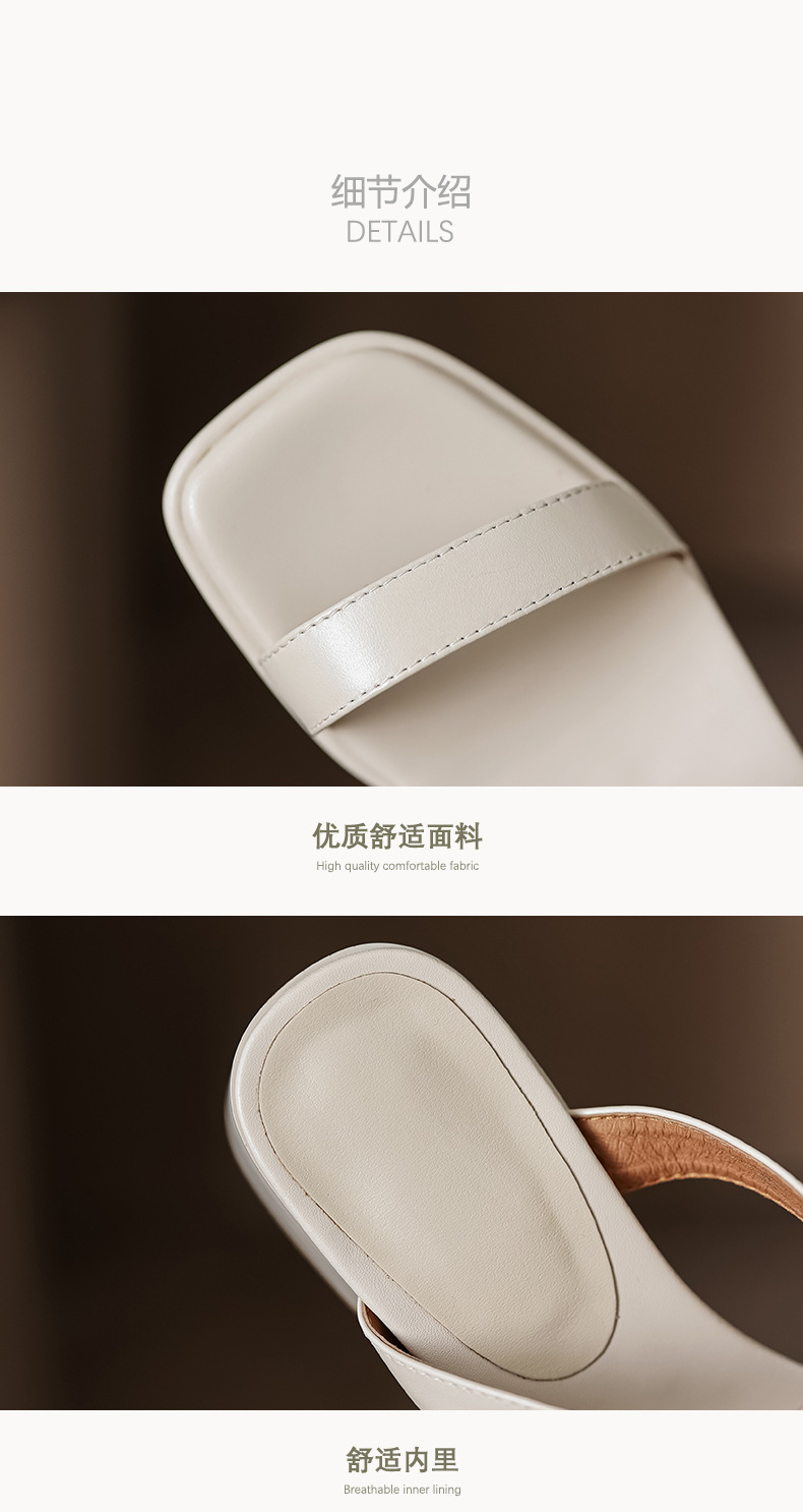 봄과 여름 새로운 정품 가죽 청키 힐 여성용 슬리퍼 한국식 스퀘어 토 오픈 토 미드 힐 게으른 여성용 비치 슈즈스토어 가기