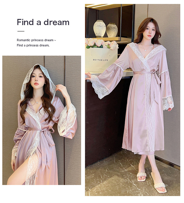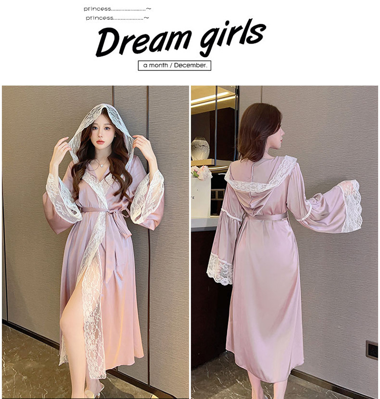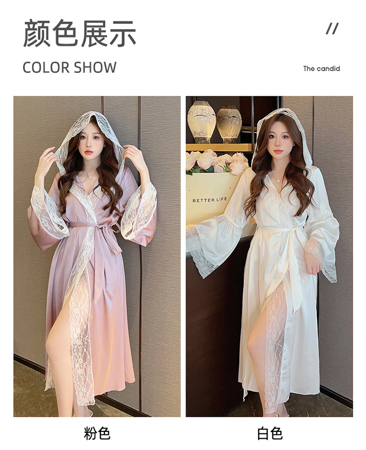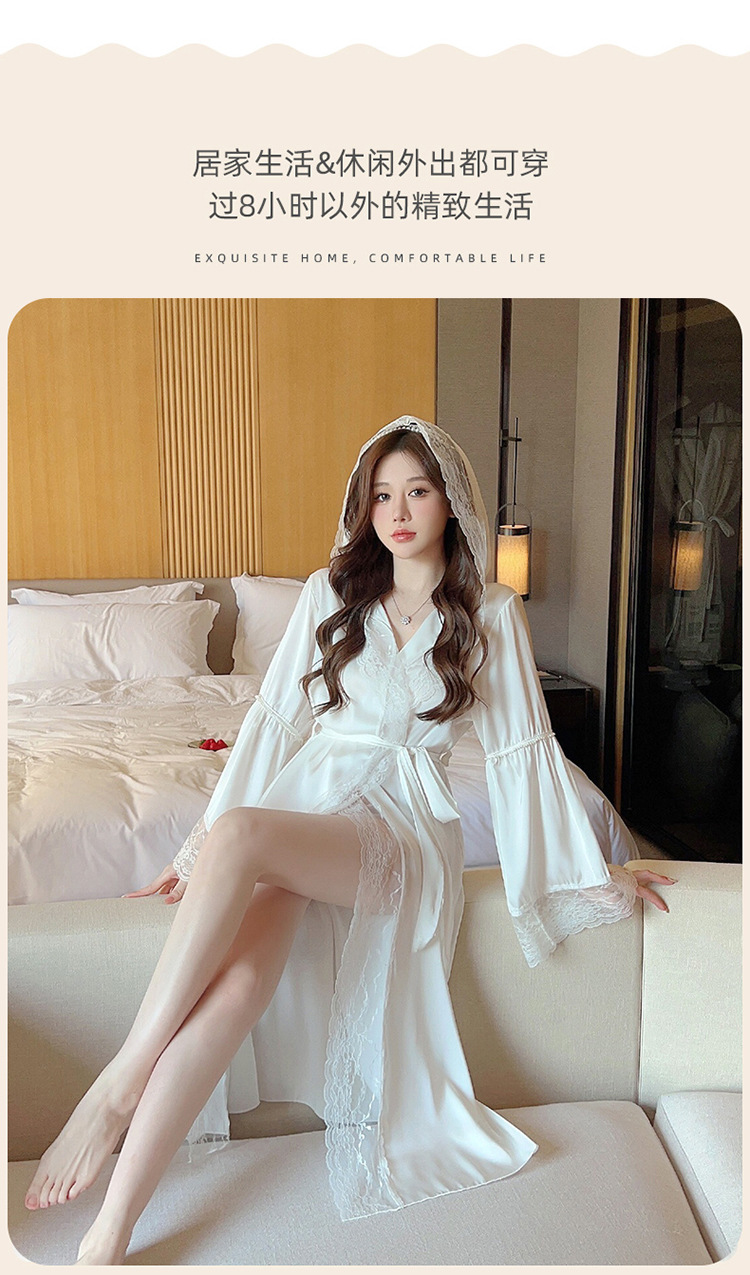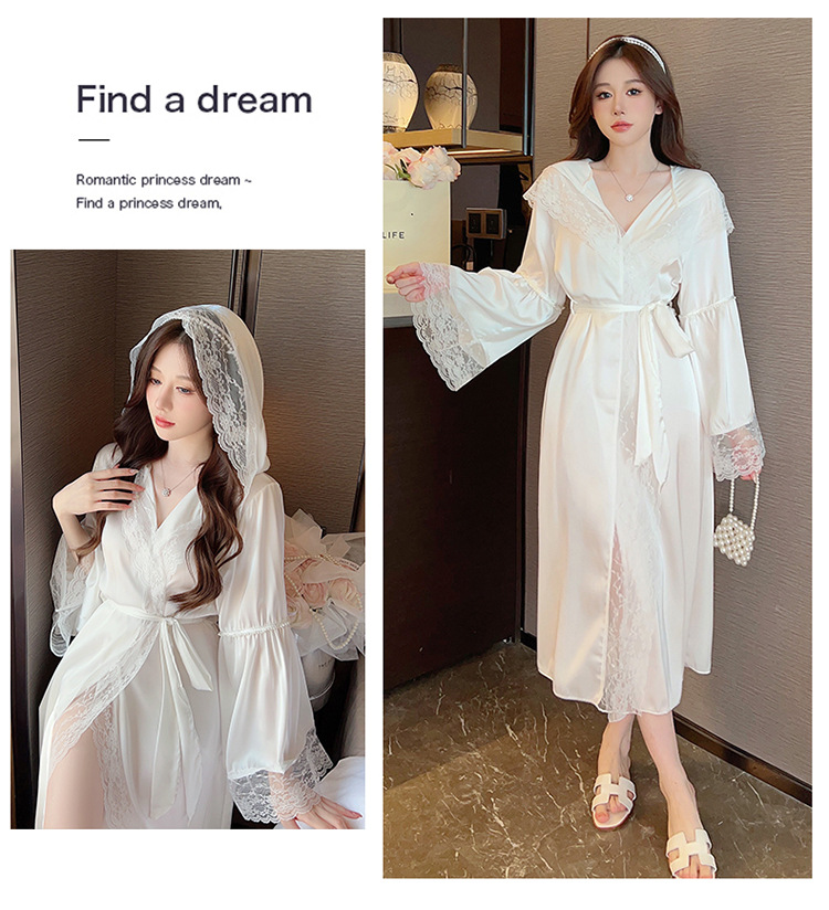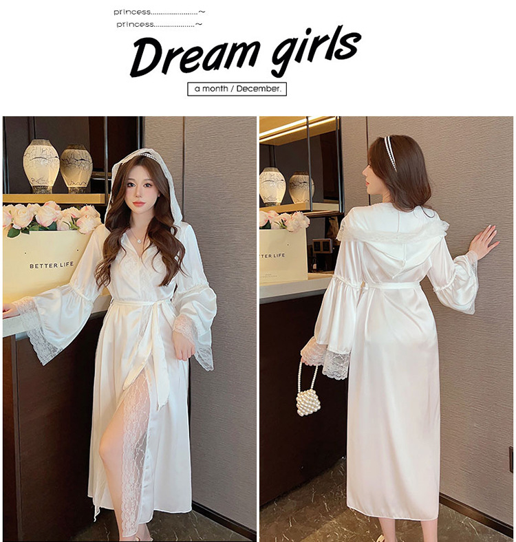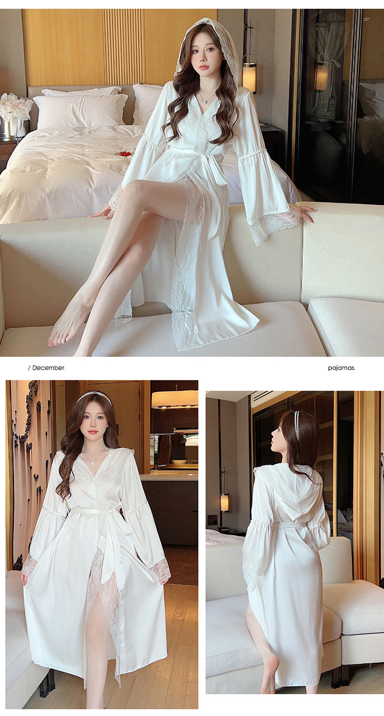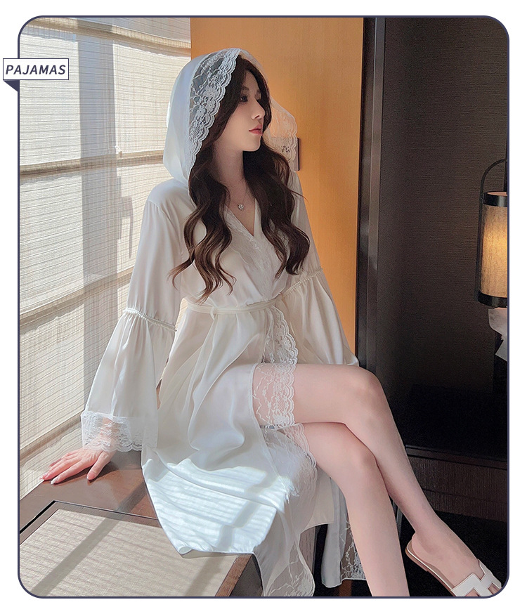 2024 여성의 섹시한 여왕 스타일 잠옷 흰색 여름 새로운 얼음 실크 후드 잠옷 스트랩 여성 홈스토어 가기