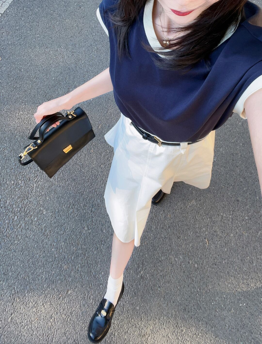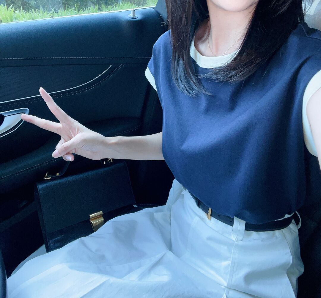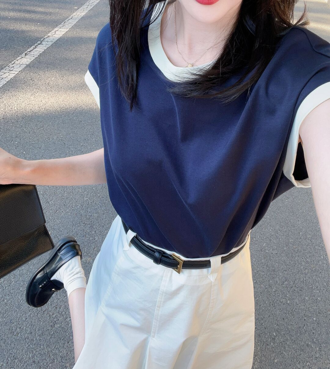 빈티지 숄더 반팔 티셔츠 여성용 여름 민소매 느슨한 슬리밍 대비 색상 티셔츠 여성용 아이스 실크 탑