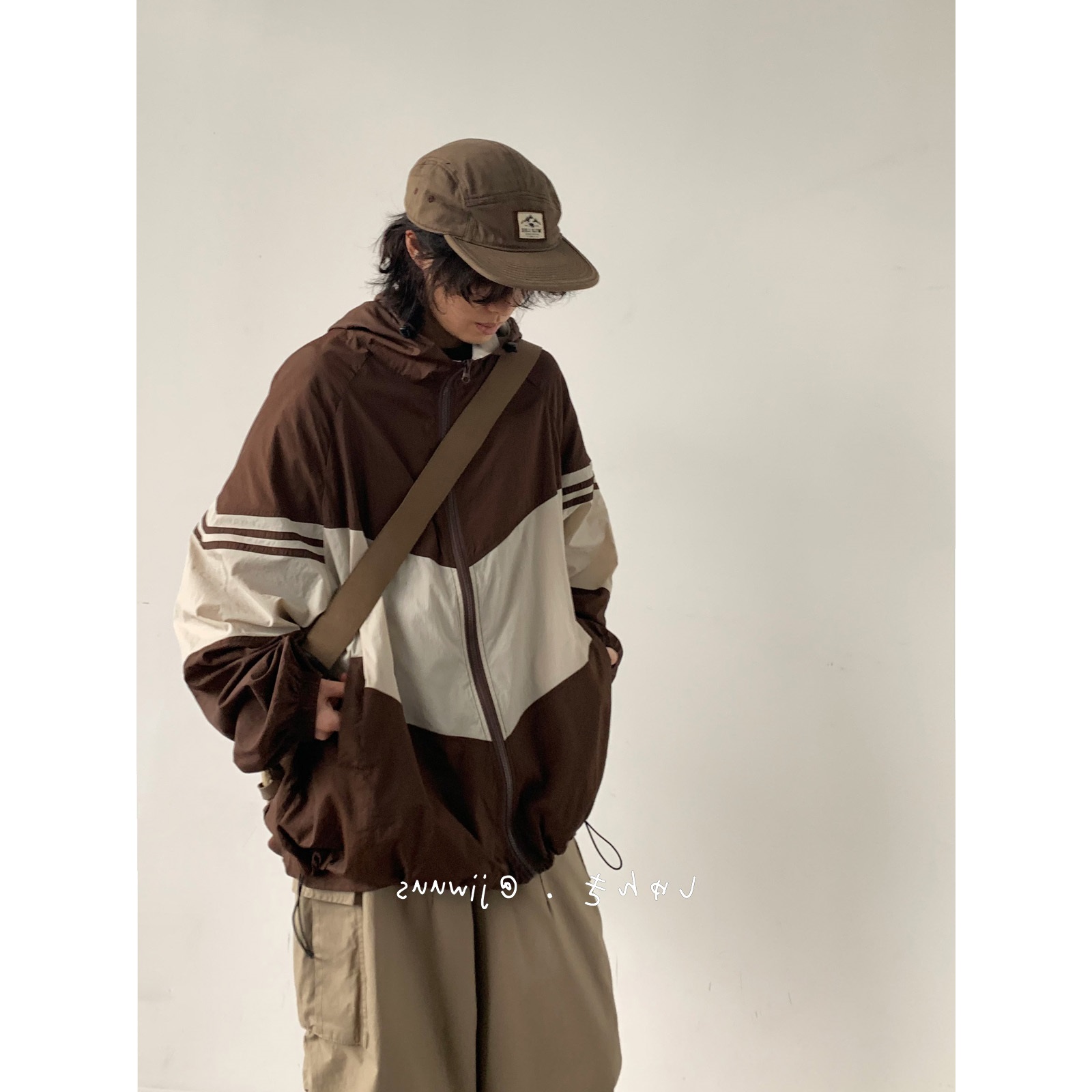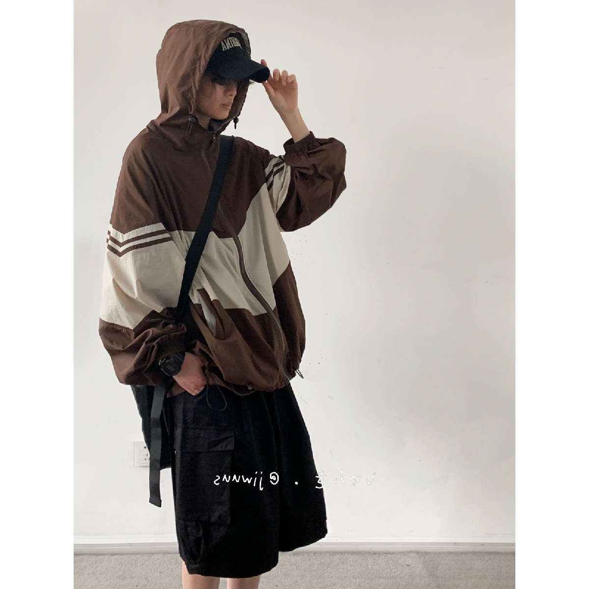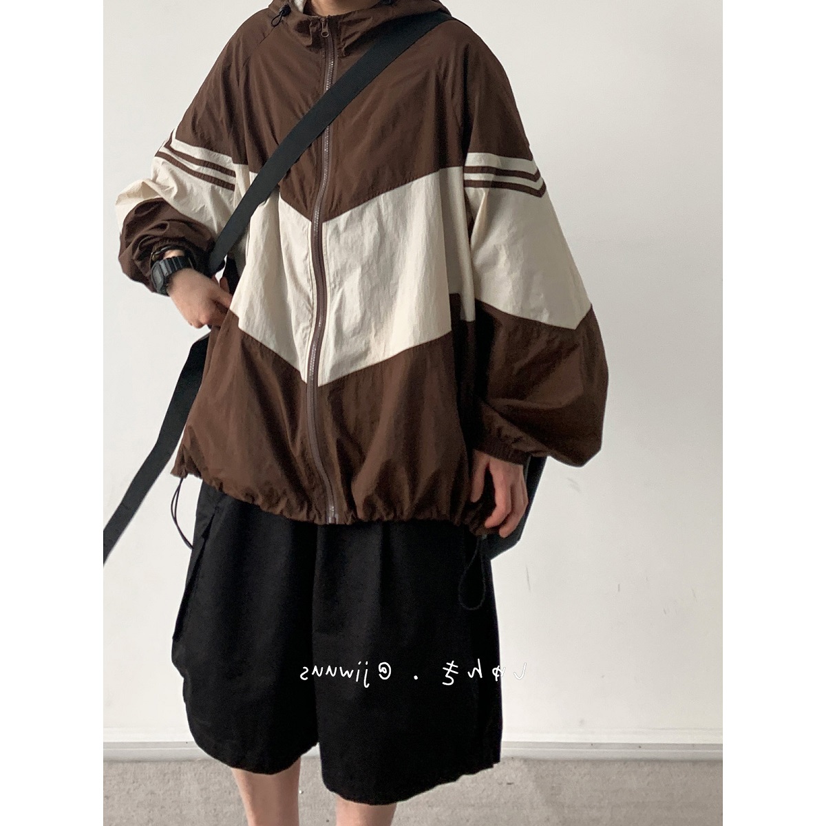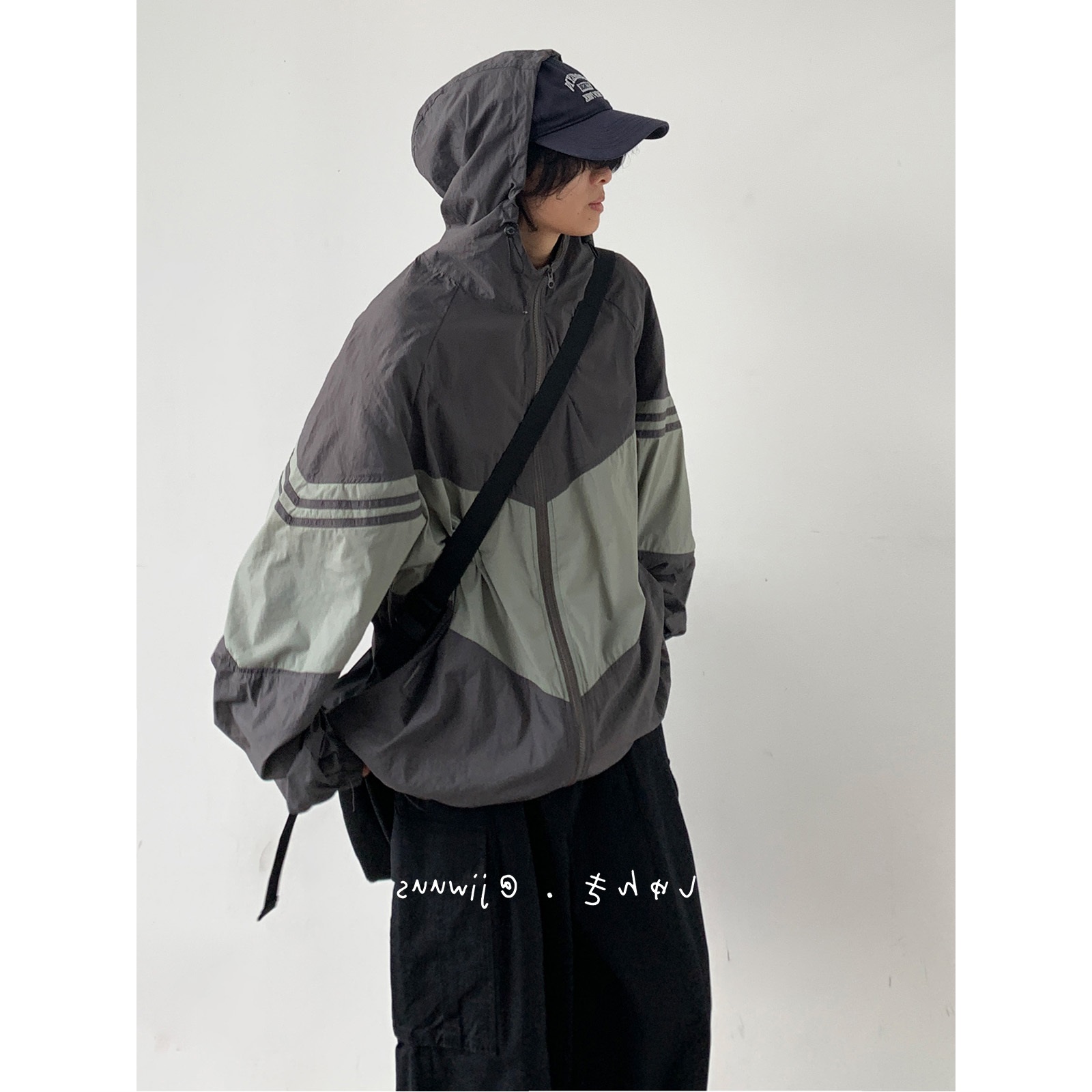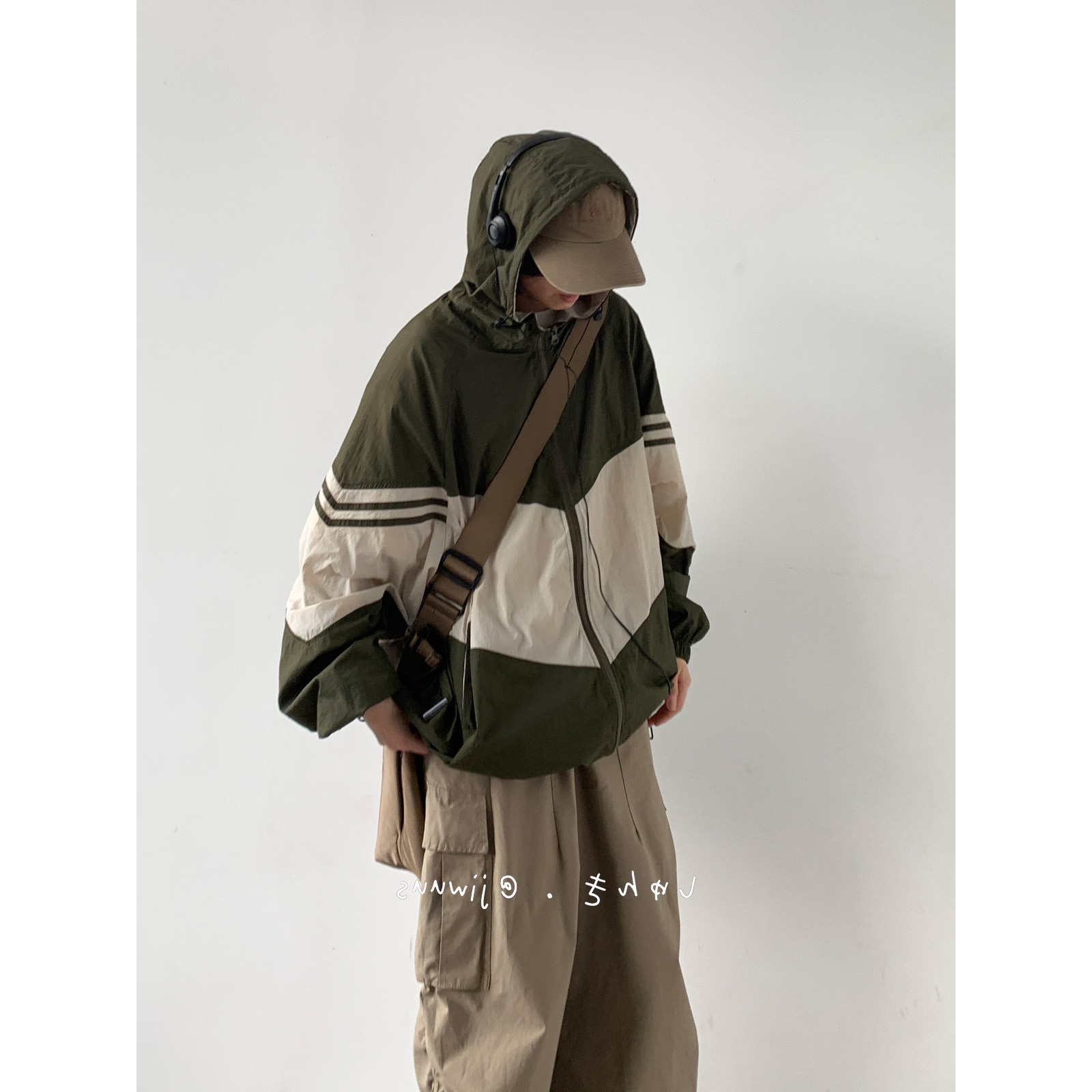 일본식 레트로 프로필 자외선 차단제 재킷 여름 얇은 남성과 여성의 느슨한 색상 접합 야외 자외선 차단제 작업 바지스토어 가기