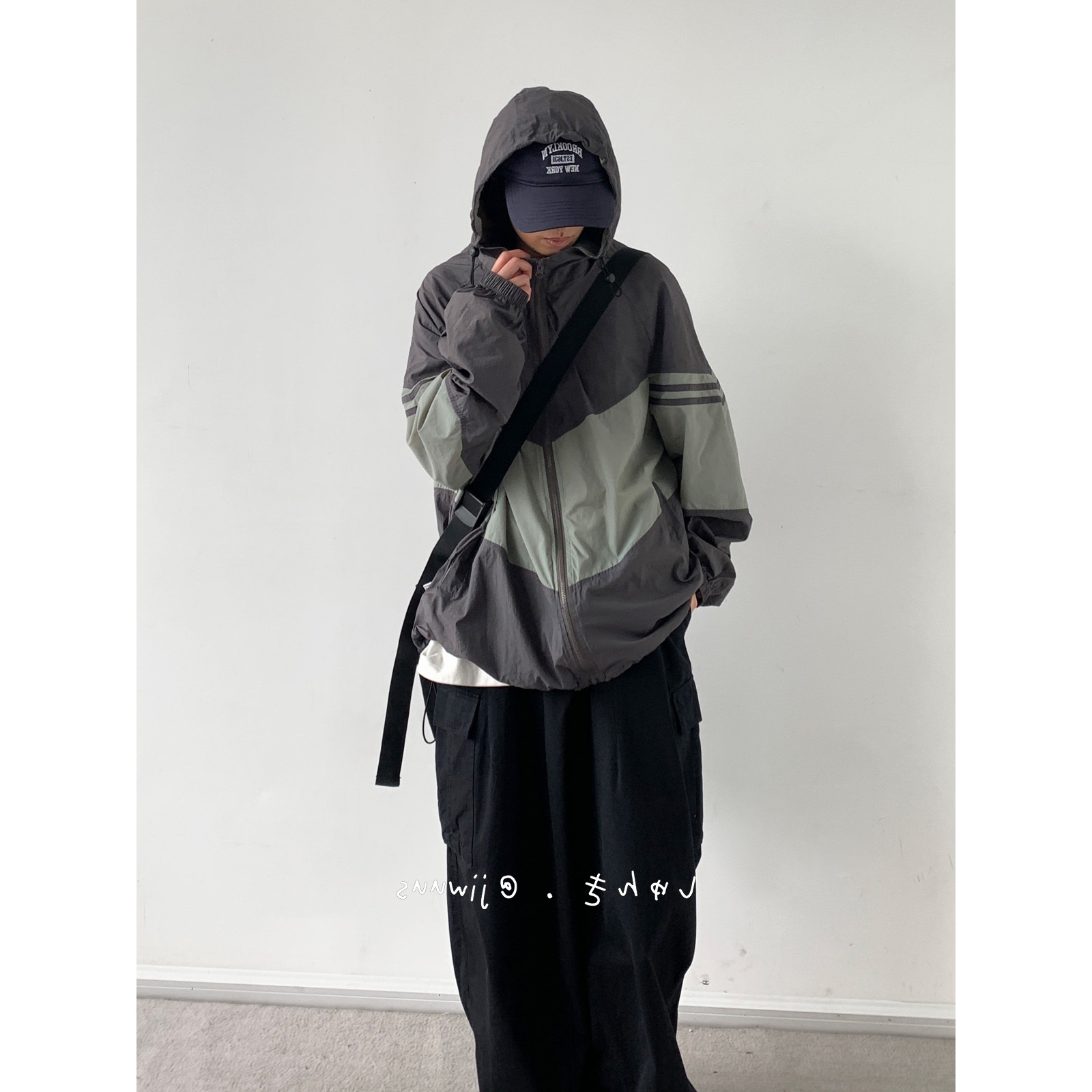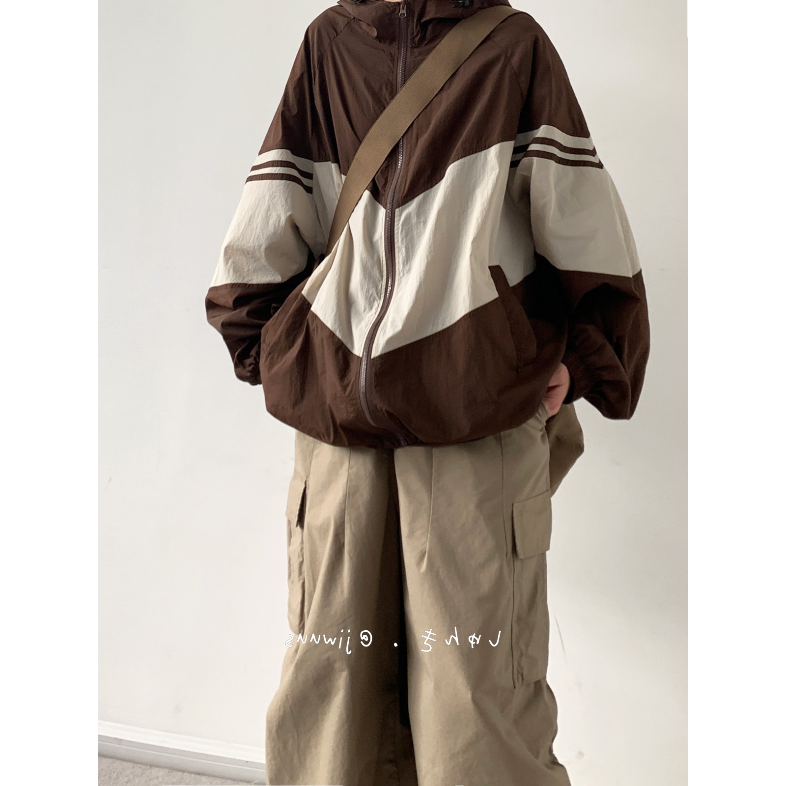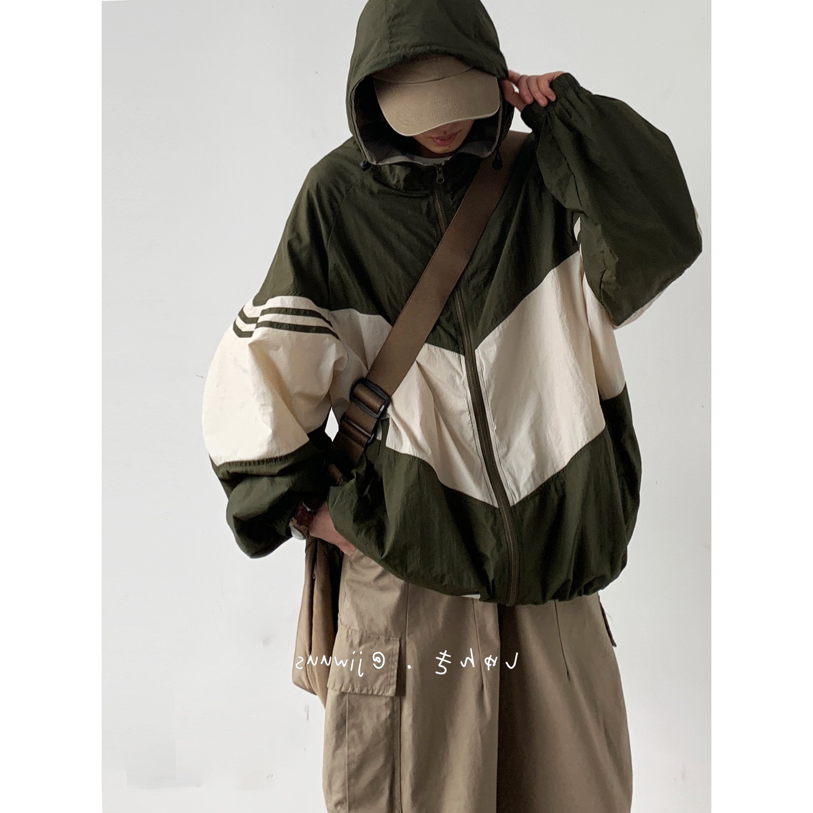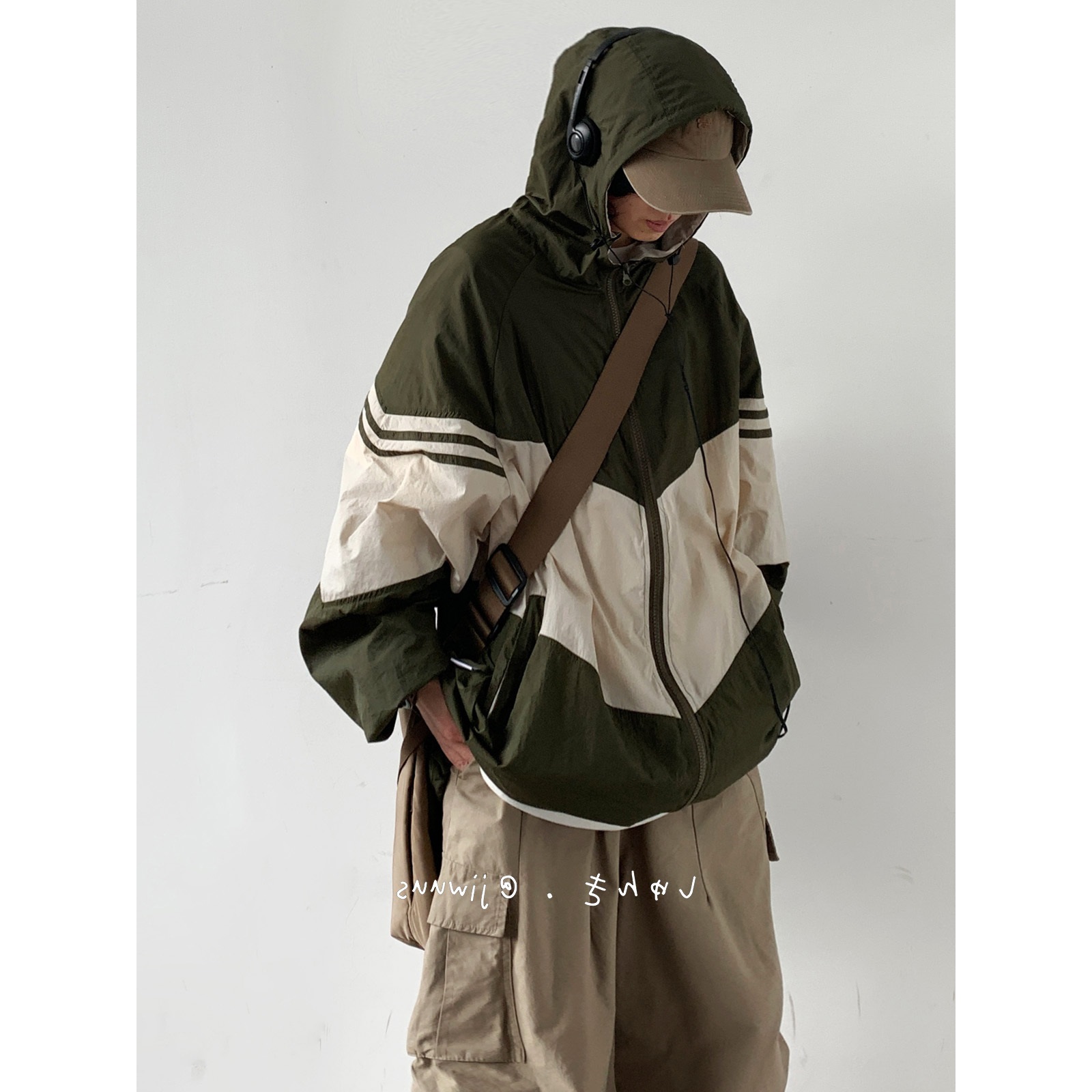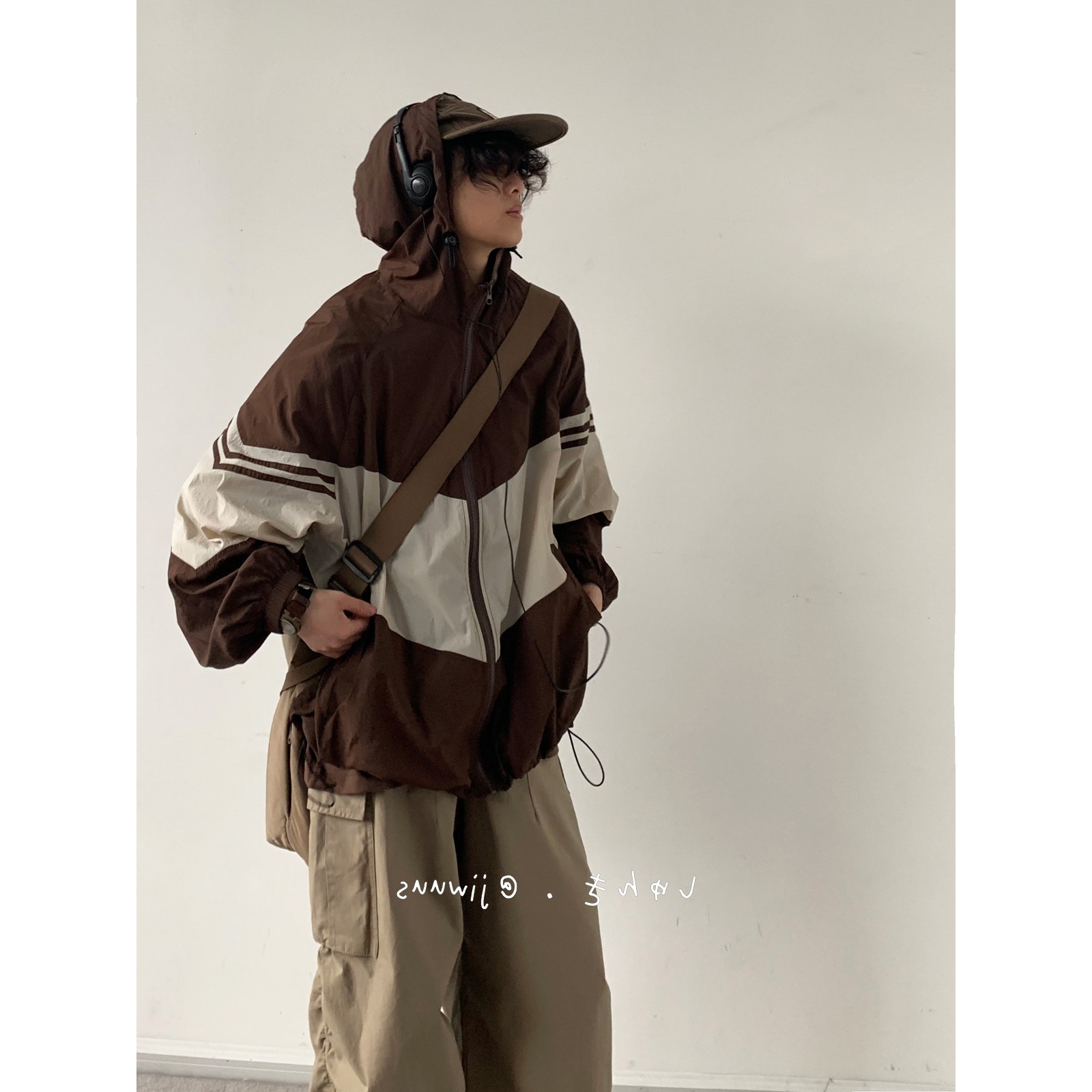 일본식 레트로 프로필 자외선 차단제 재킷 여름 얇은 남성과 여성의 느슨한 색상 접합 야외 자외선 차단제 작업 바지스토어 가기