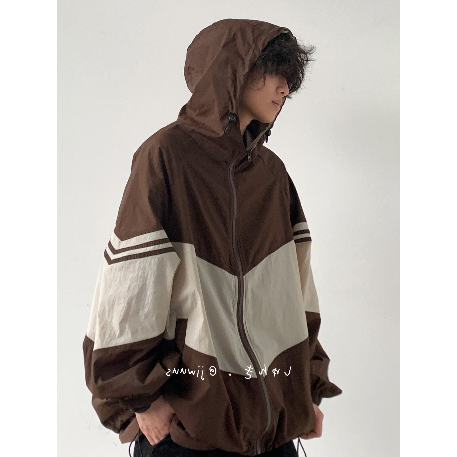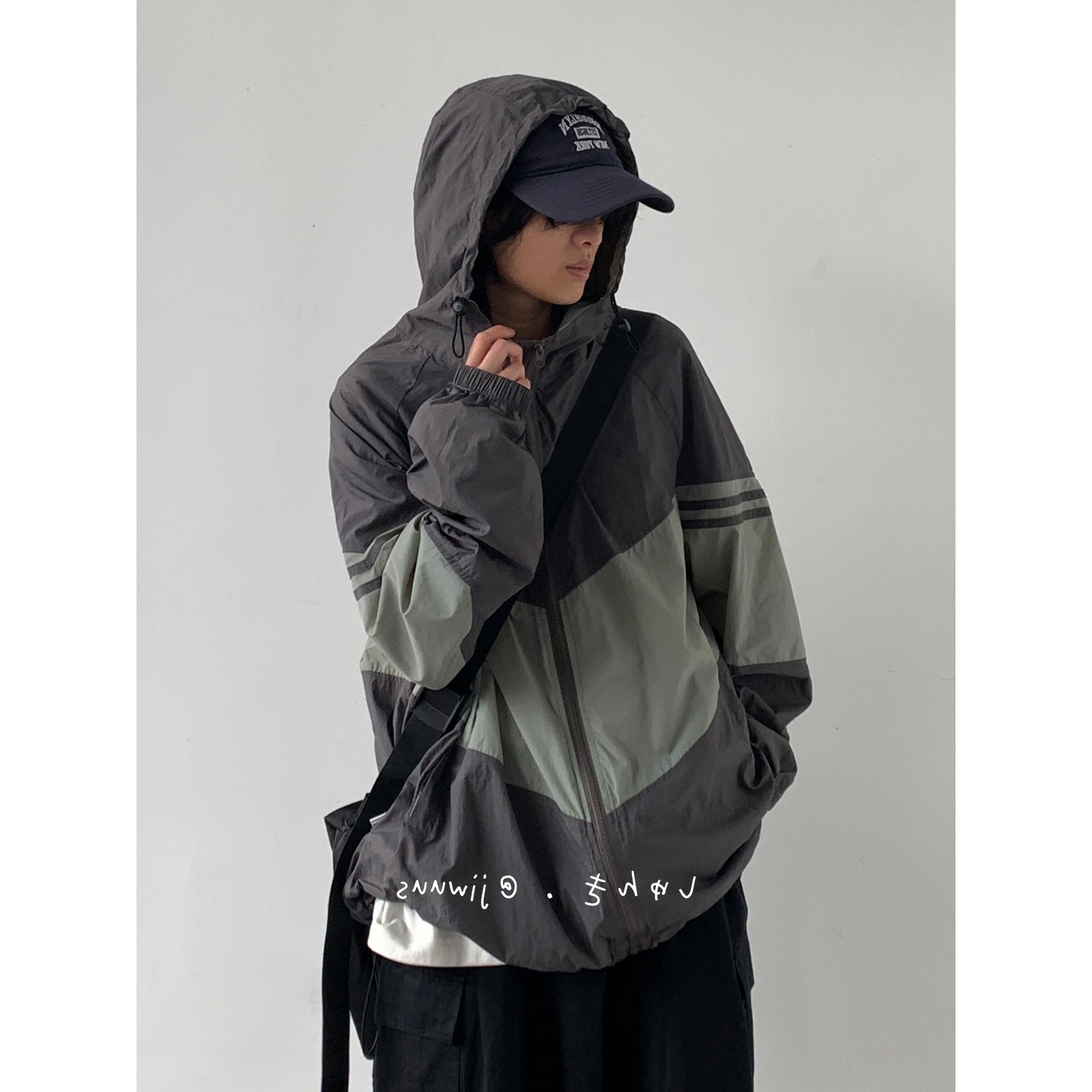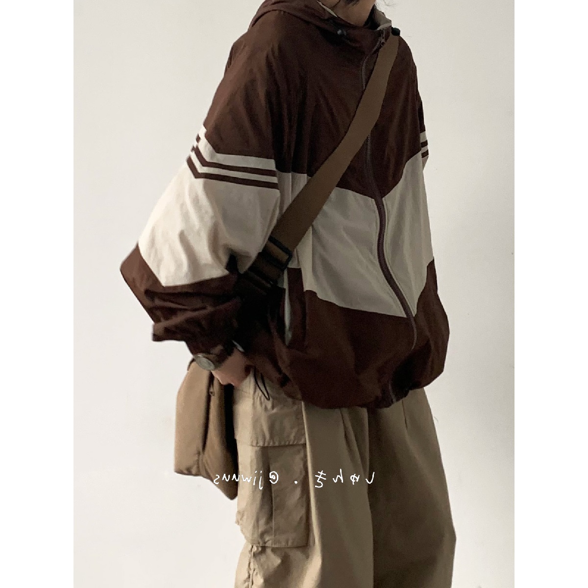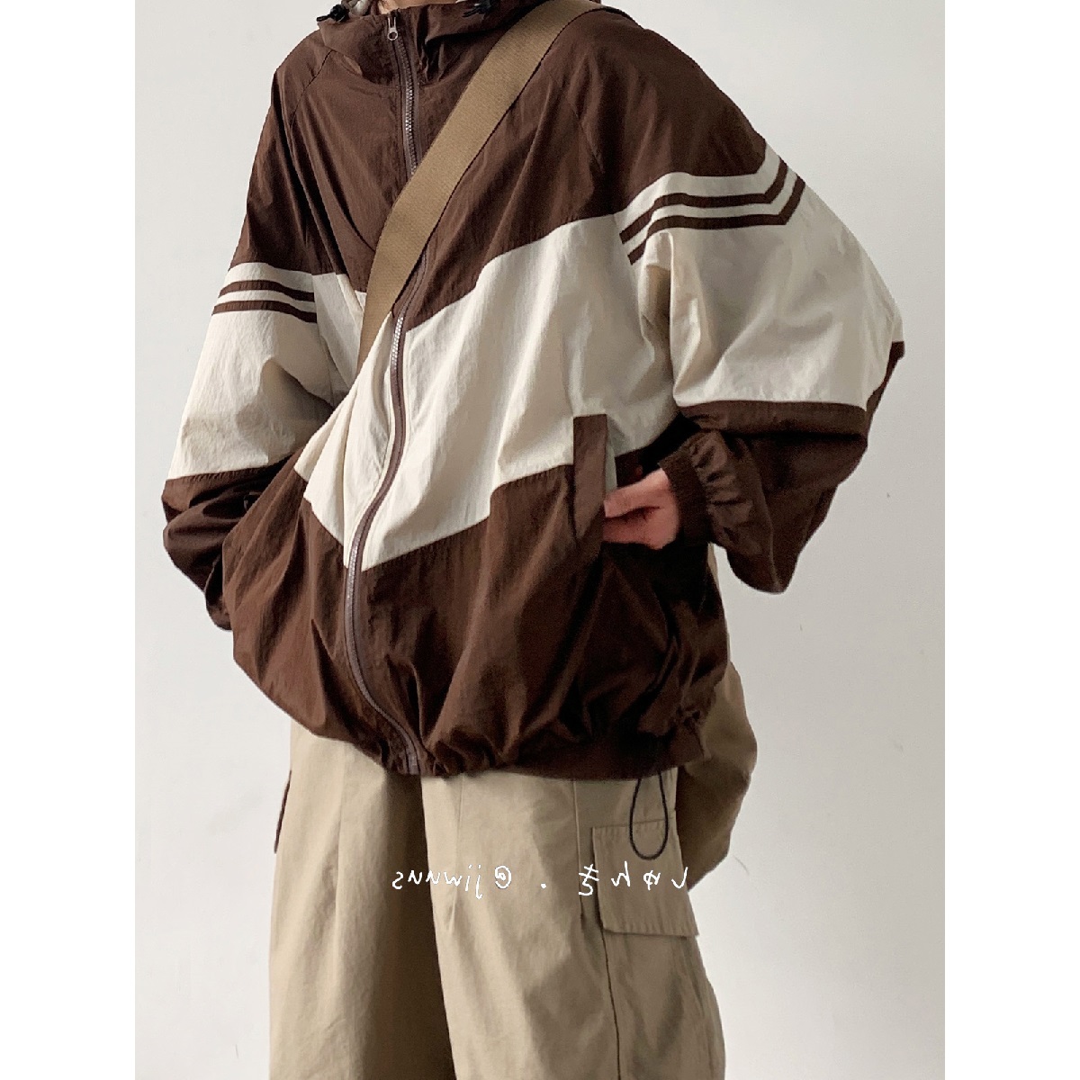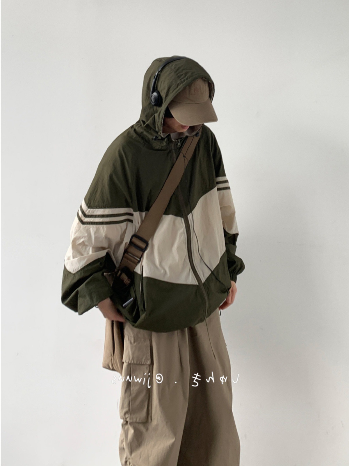 일본식 레트로 프로필 자외선 차단제 재킷 여름 얇은 남성과 여성의 느슨한 색상 접합 야외 자외선 차단제 작업 바지스토어 가기