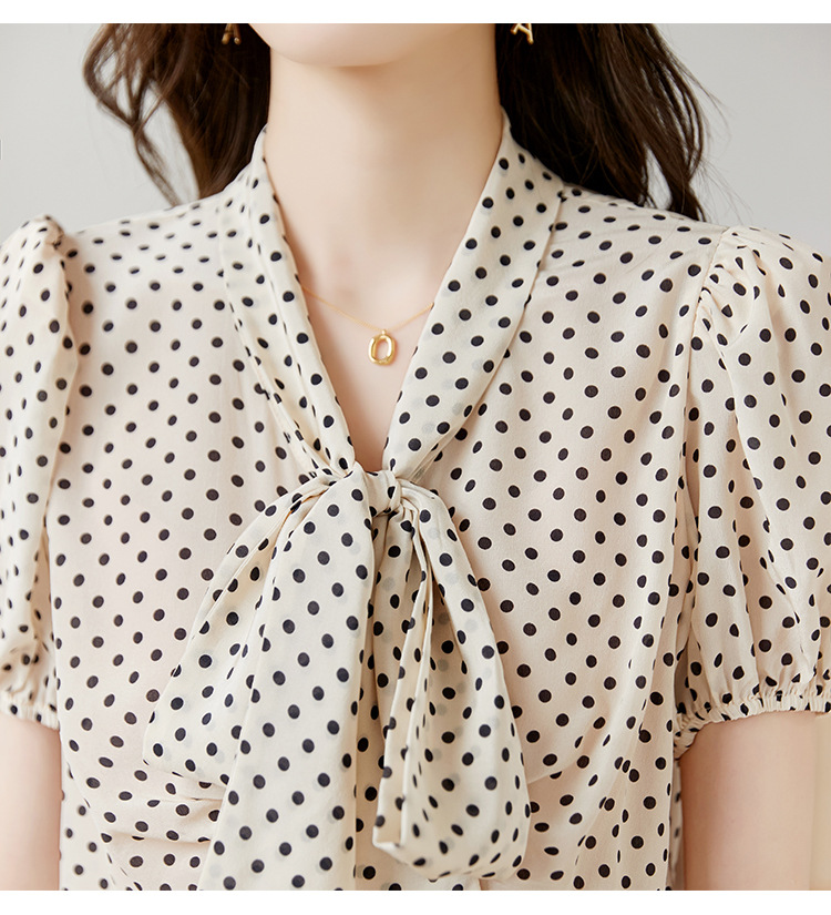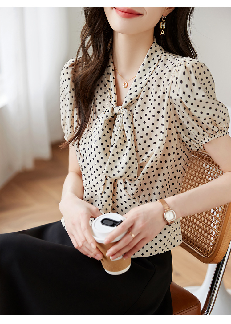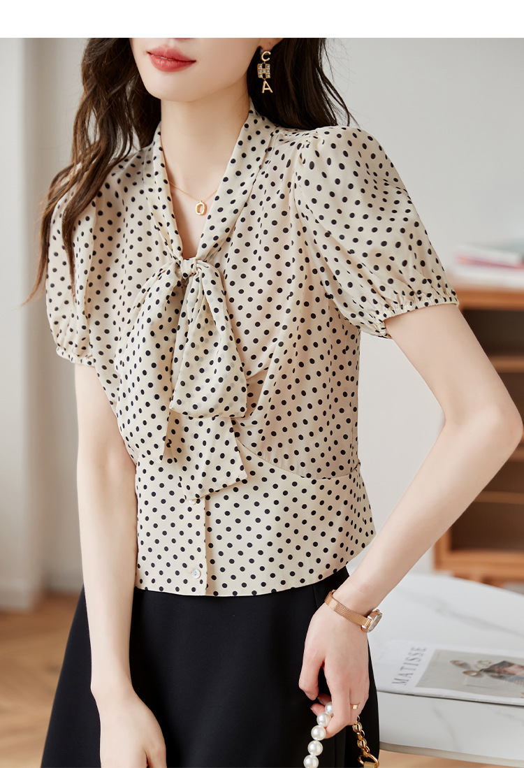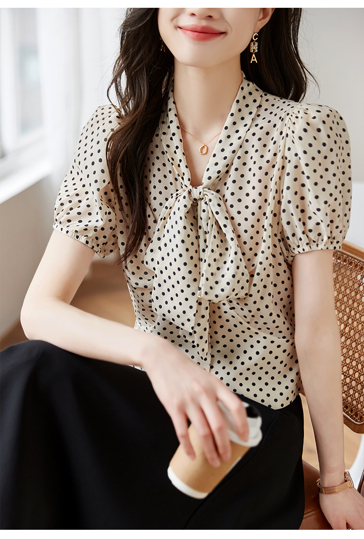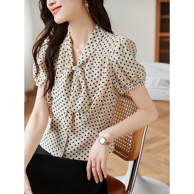 레트로 폴카 도트 실크 셔츠 여성 여름 새 스타일 레이스 업 칼라 셔츠 퍼프 슬리브 탑